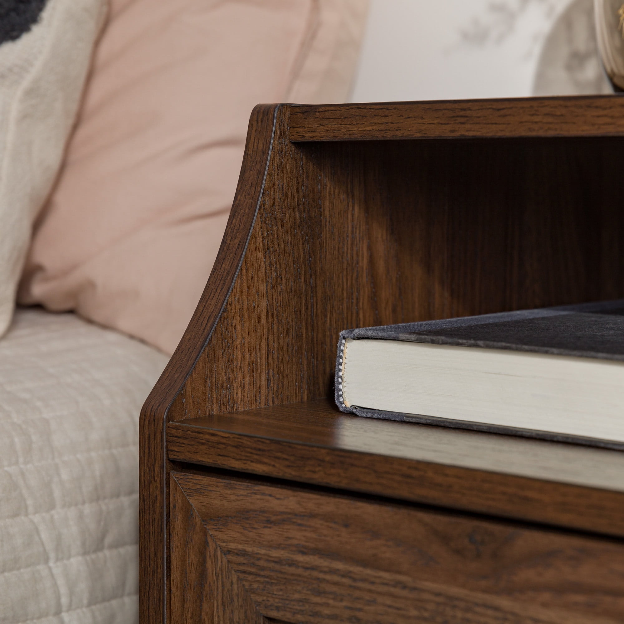 Dark walnut finish Modern contemporary style USB port attachment for easy charging 2 drawers on telescoping metal glides Cord management ports keep cables tidy Attractive metal legs Plastic caps on base protect flooring Open storage within curved top cubby Ships ready-to-assemble with step-by-step instructions Made with warp-resistant MDF, durable laminate, and powder-coated steel Assembled Dimensions: 26” H x 22” L x 15” W Packaged dimensions: 10″ H x 28″ L x 20″ W