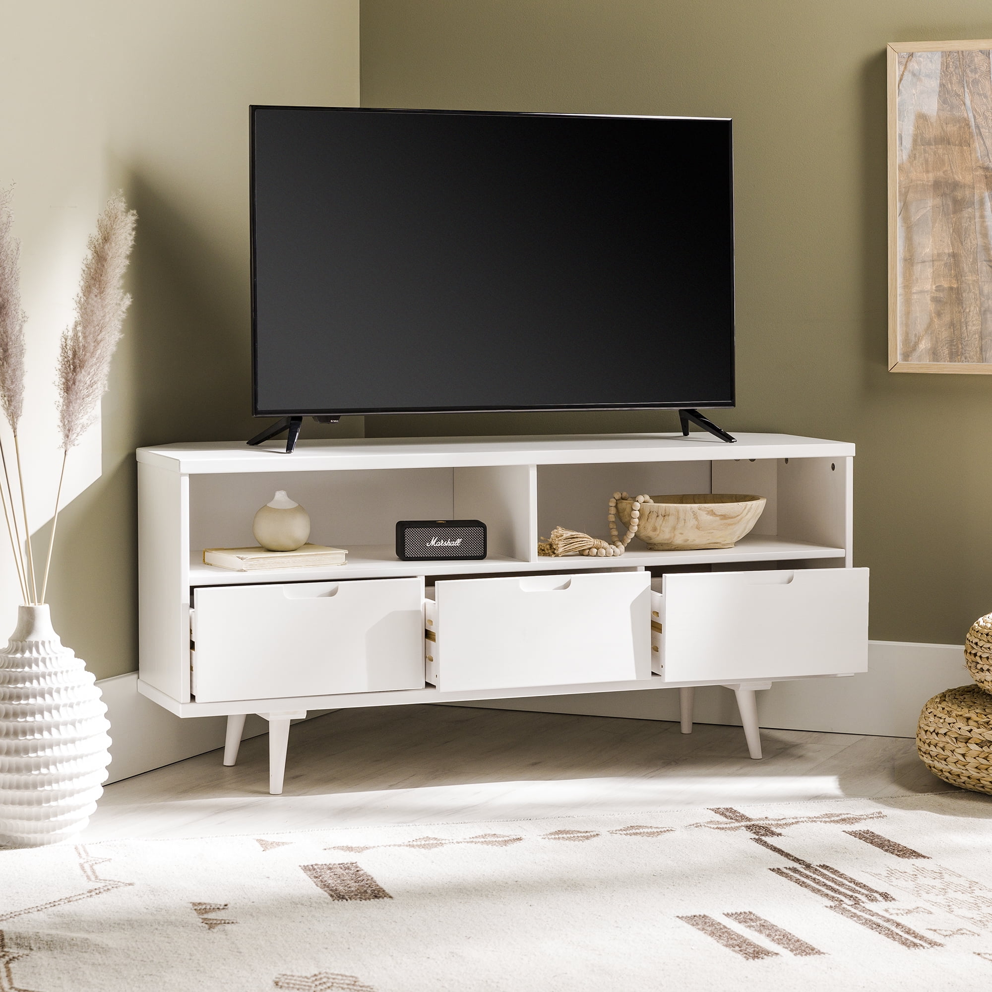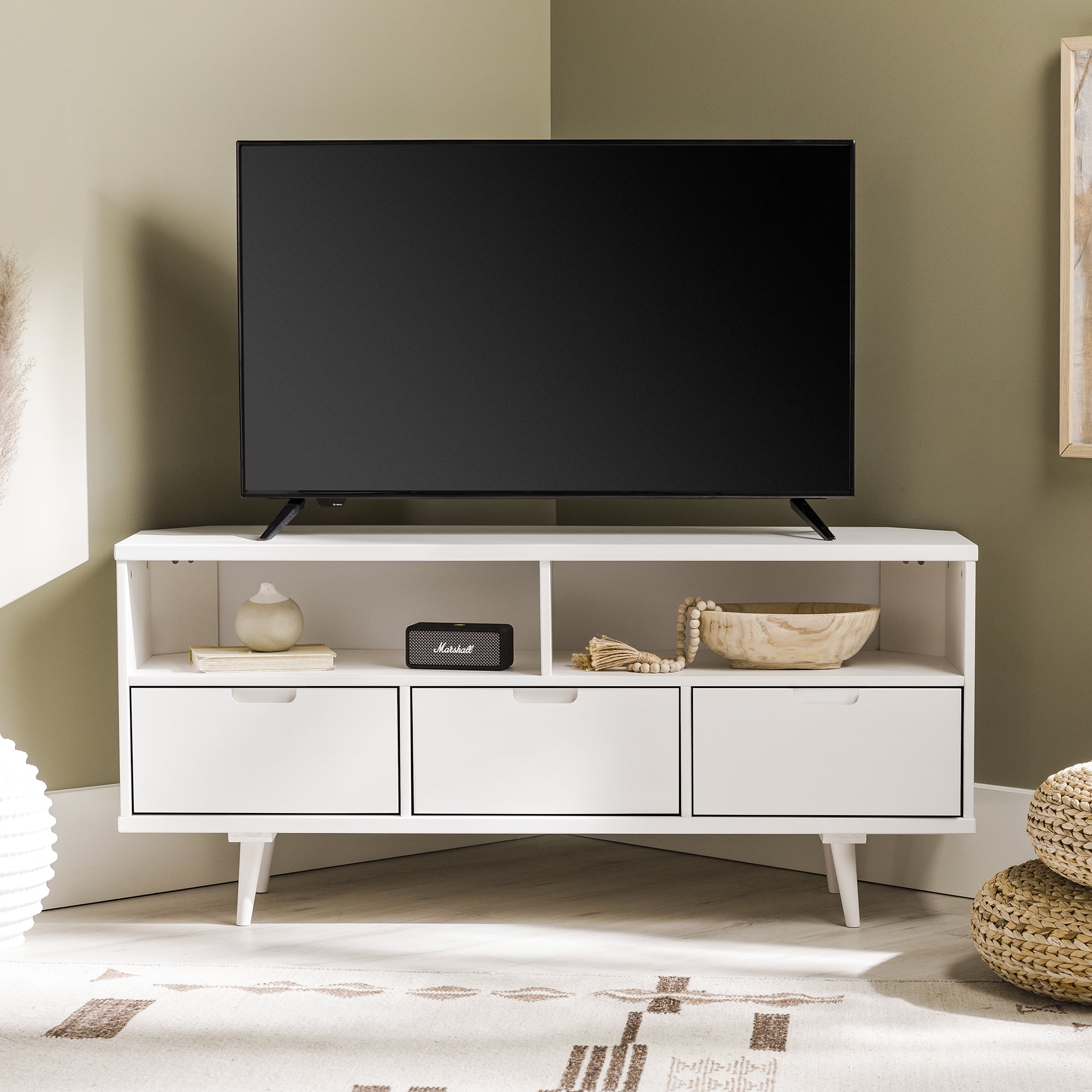 Walker Edison Modern 3-Drawer Solid Wood Corner TV Stand, White