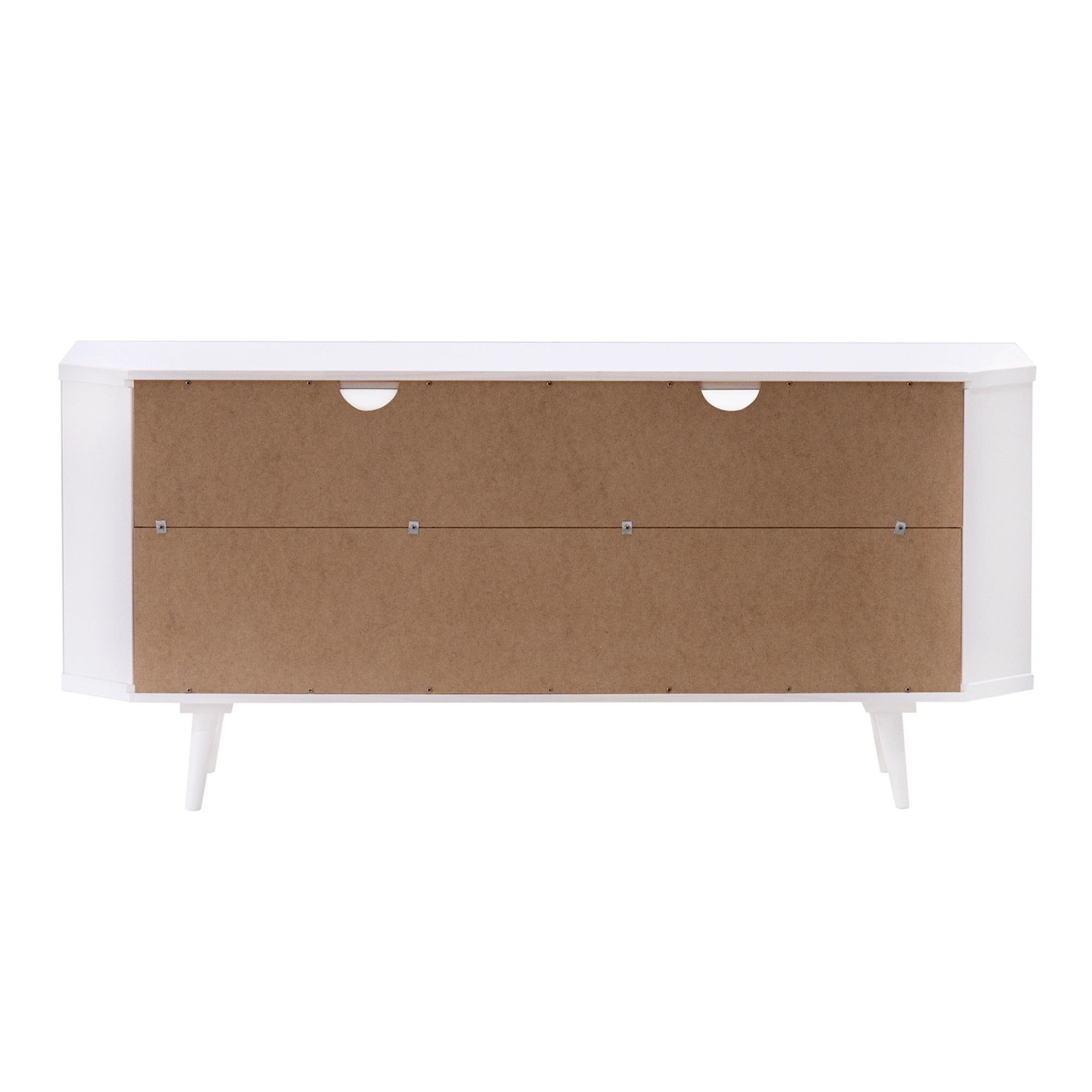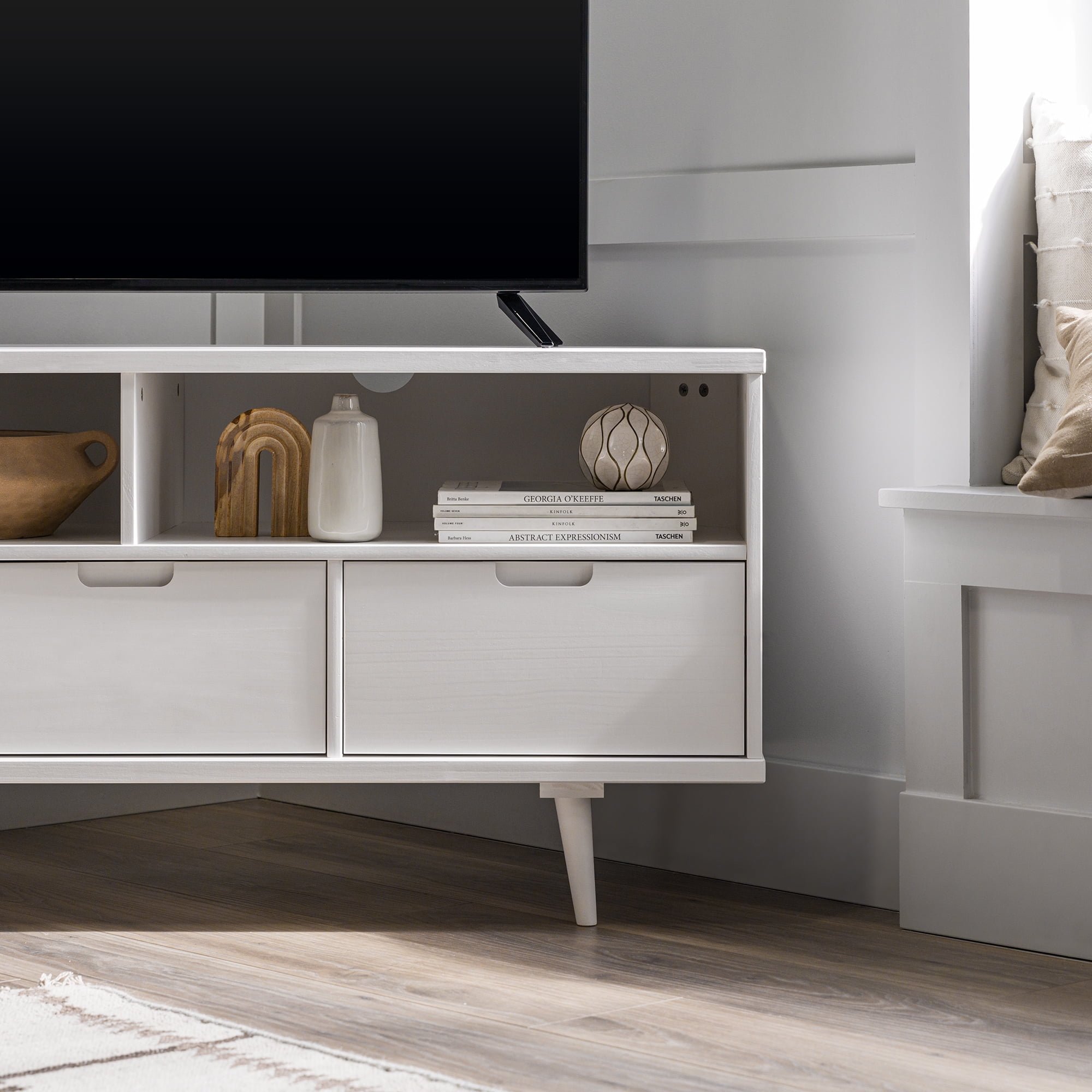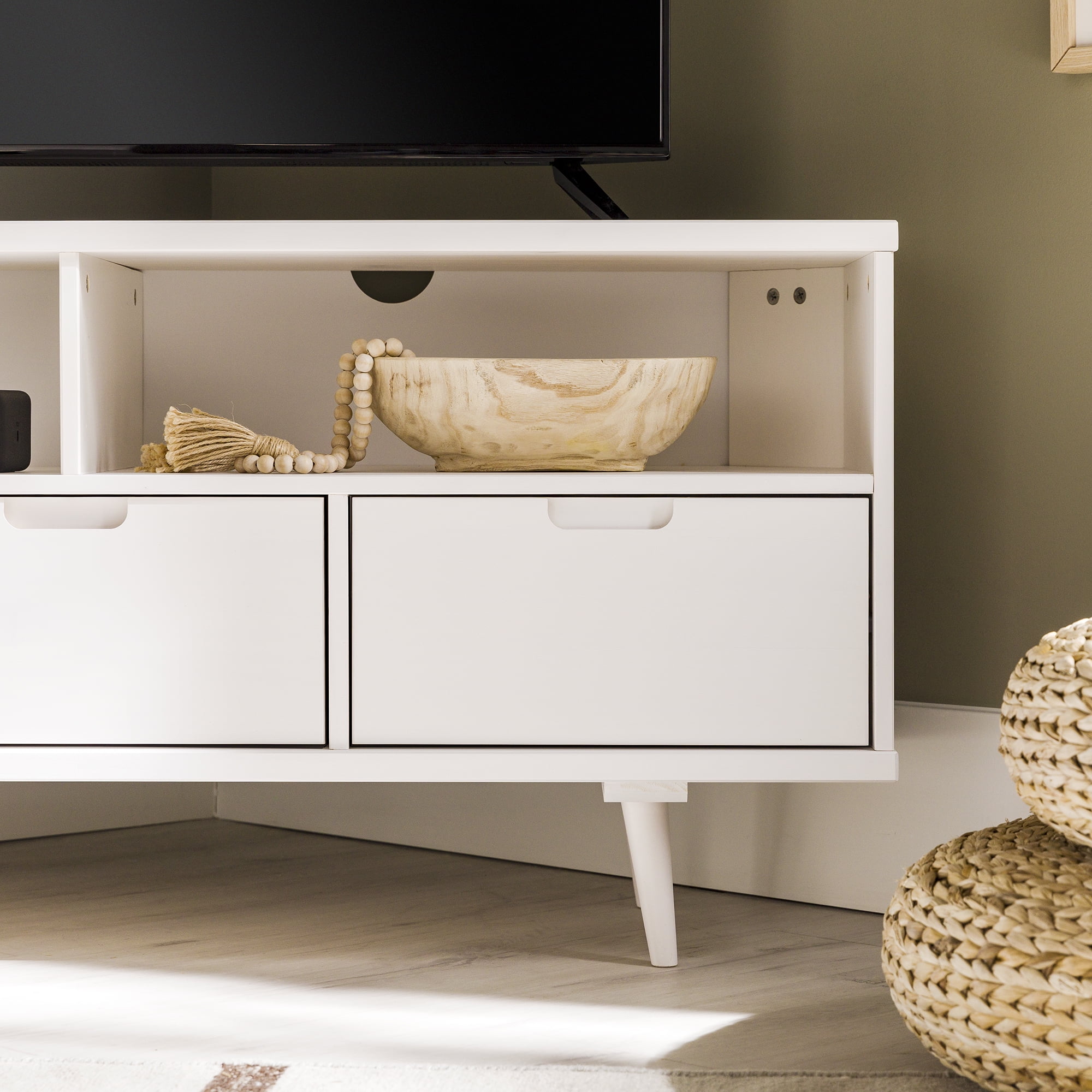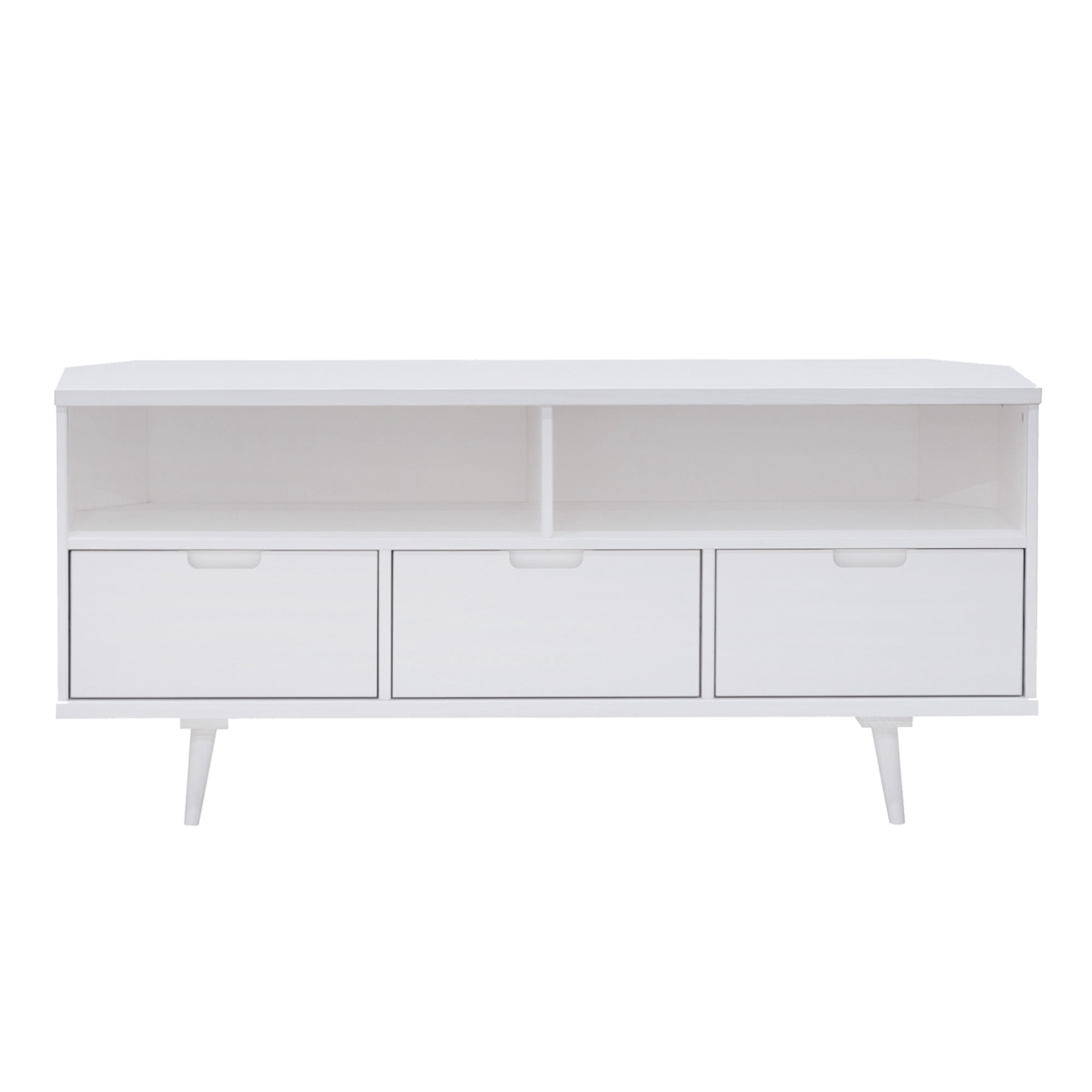 Mid-century modern TV stand White painted finish 3 drawers on telescoping metal slides Angled sides to fit corners easily Cut-out handles for a natural look Choose from three attractive finishes to match your style Solid wood construction Ships ready-to-assemble with step-by-step instructions Assembled Dimensions: 23.5″ H x 52″ L x 25.75″ W Packaged Dimensions: 7.09” H x 55” L x 18.31” W