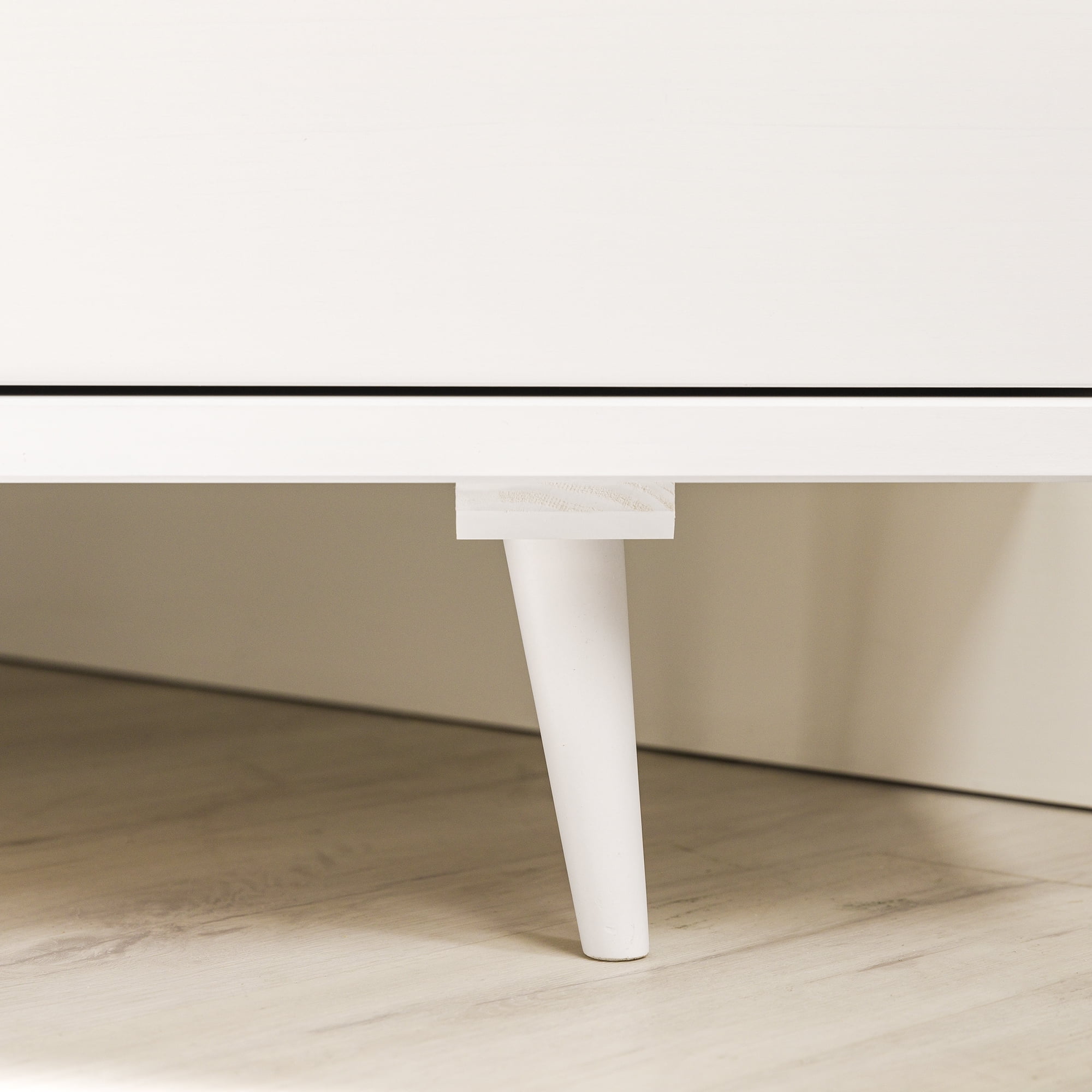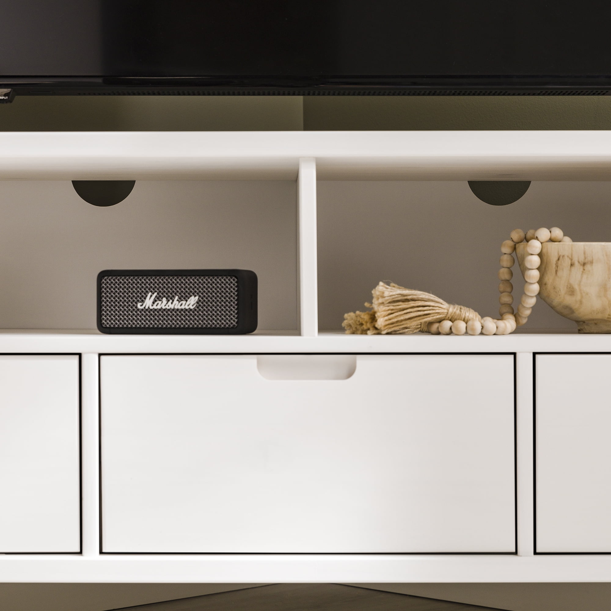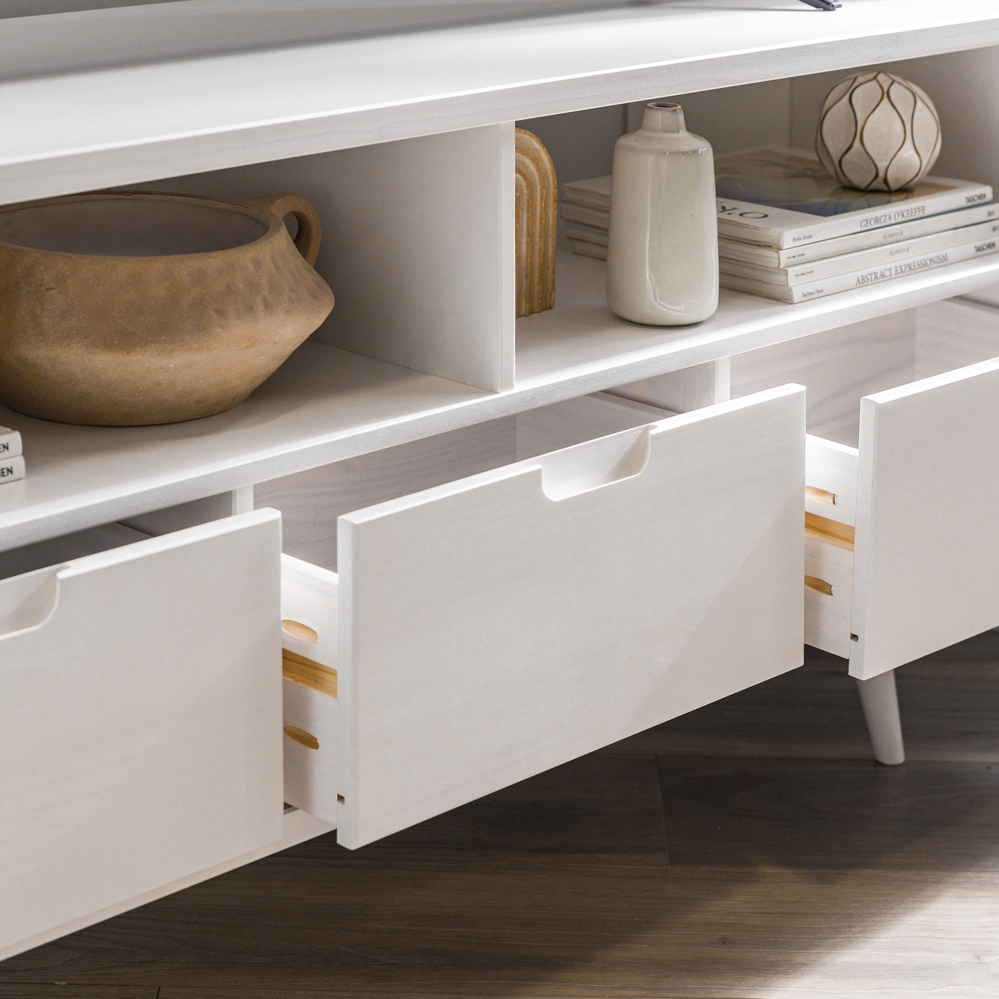 Mid-century modern TV stand White painted finish 3 drawers on telescoping metal slides Angled sides to fit corners easily Cut-out handles for a natural look Choose from three attractive finishes to match your style Solid wood construction Ships ready-to-assemble with step-by-step instructions Assembled Dimensions: 23.5″ H x 52″ L x 25.75″ W Packaged Dimensions: 7.09” H x 55” L x 18.31” W