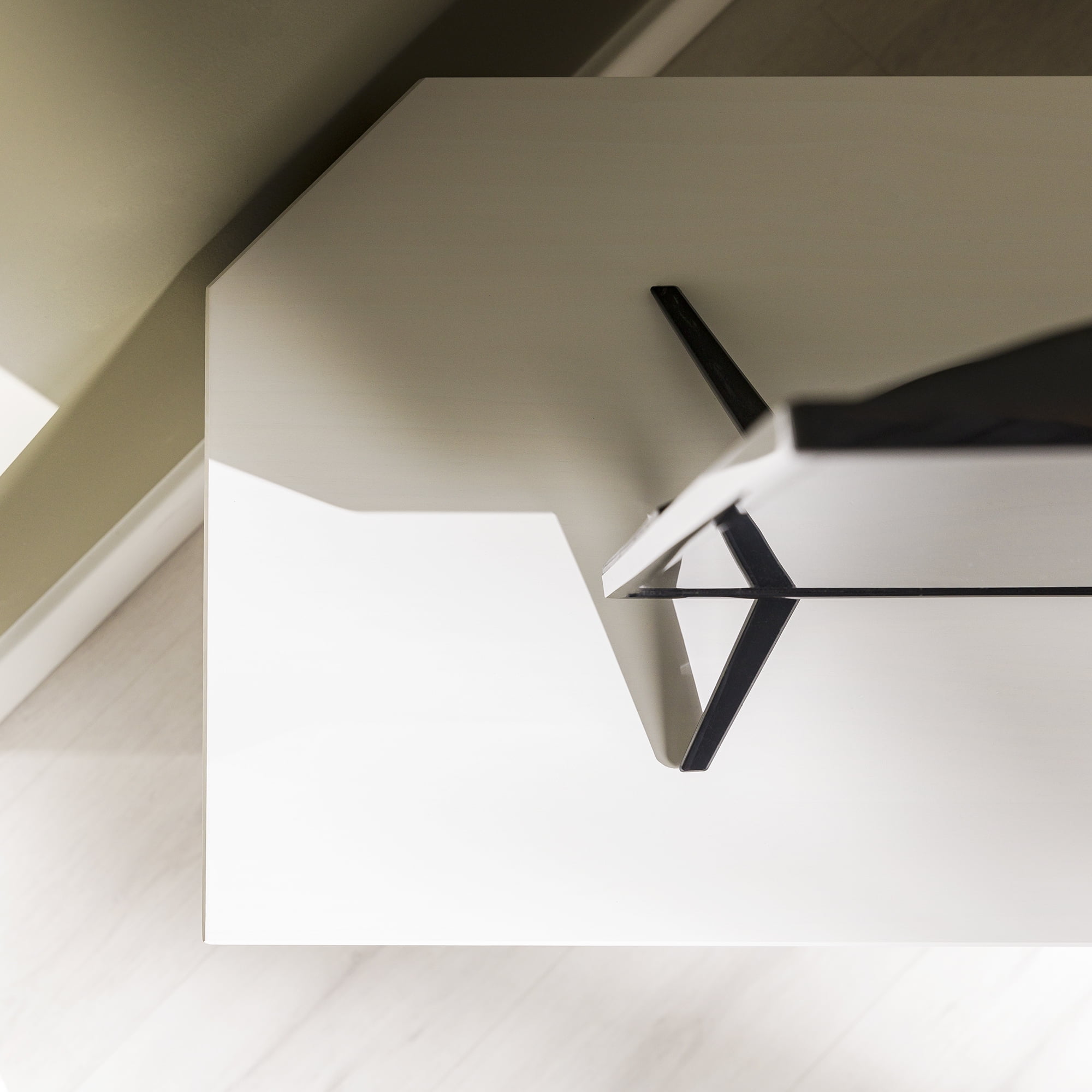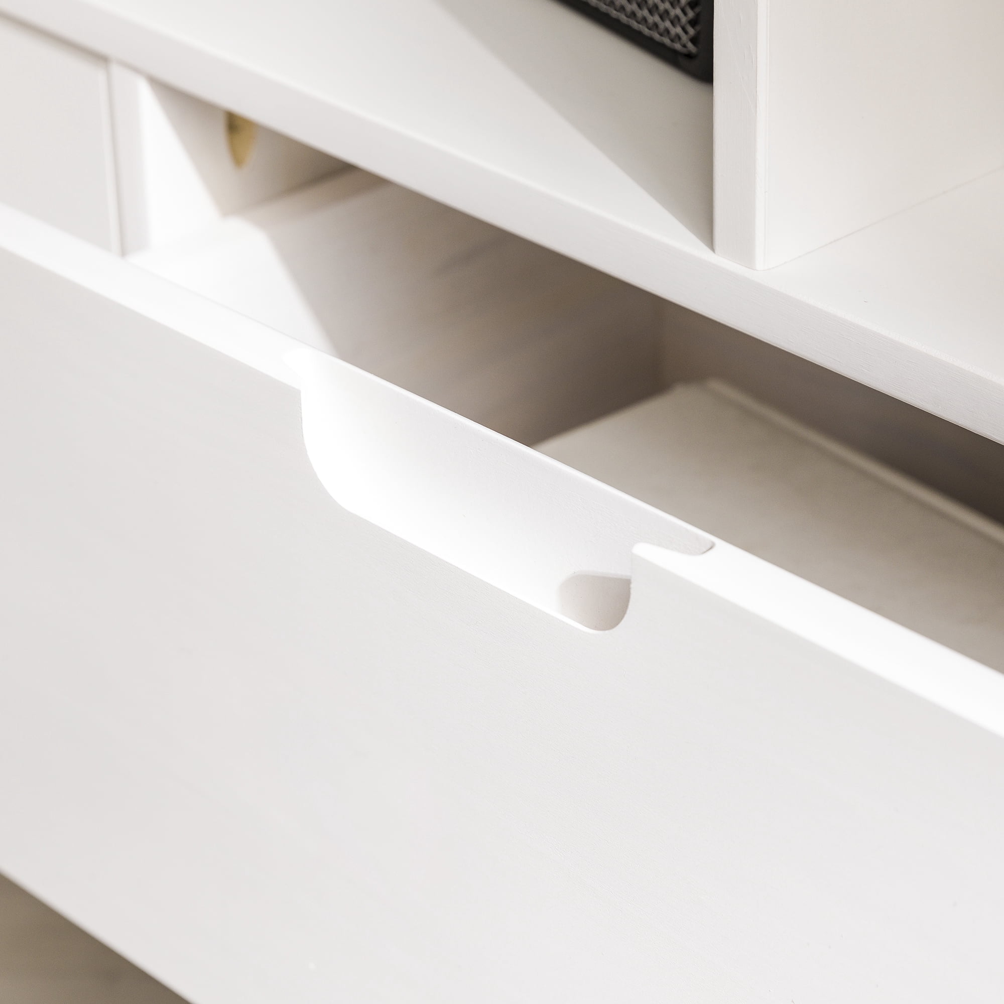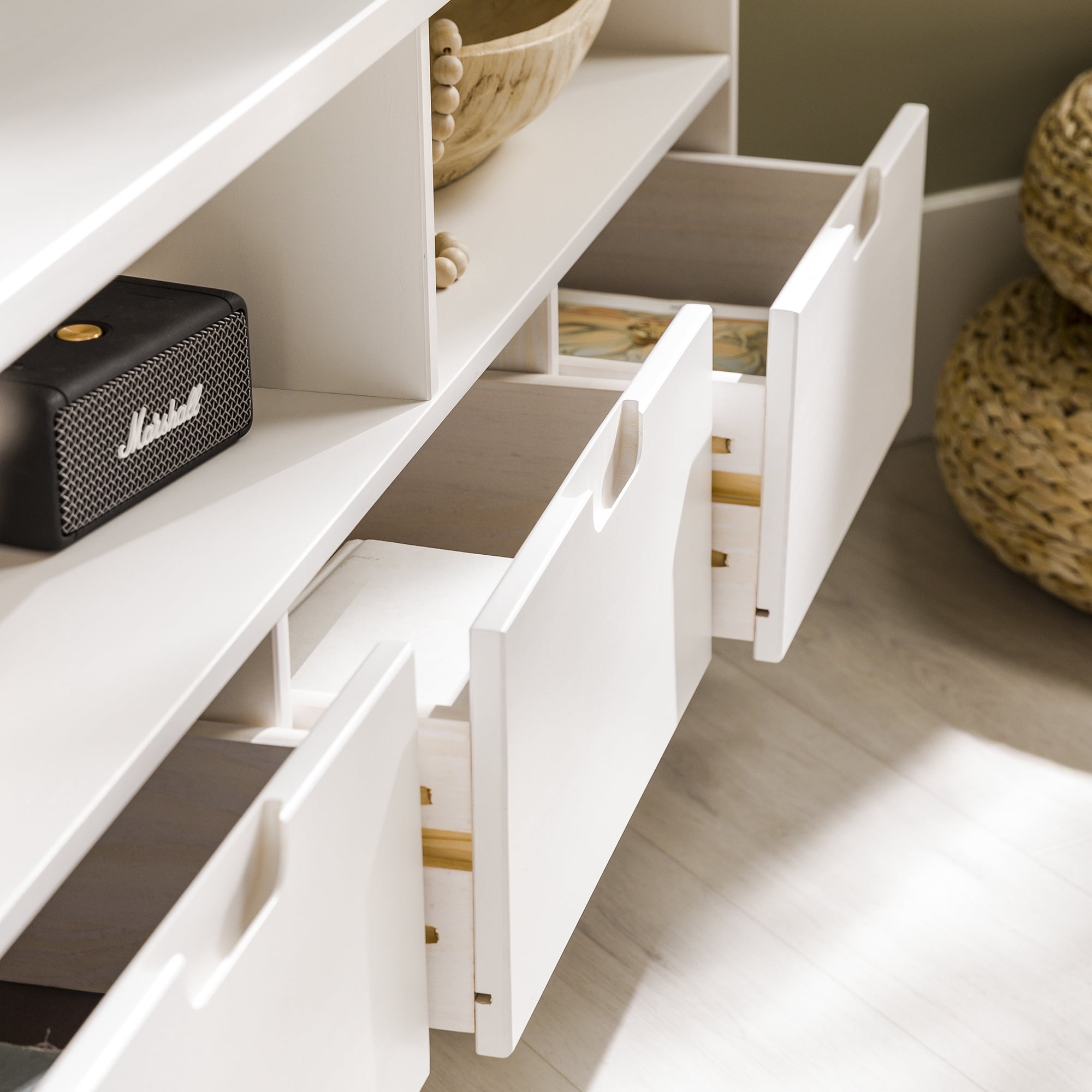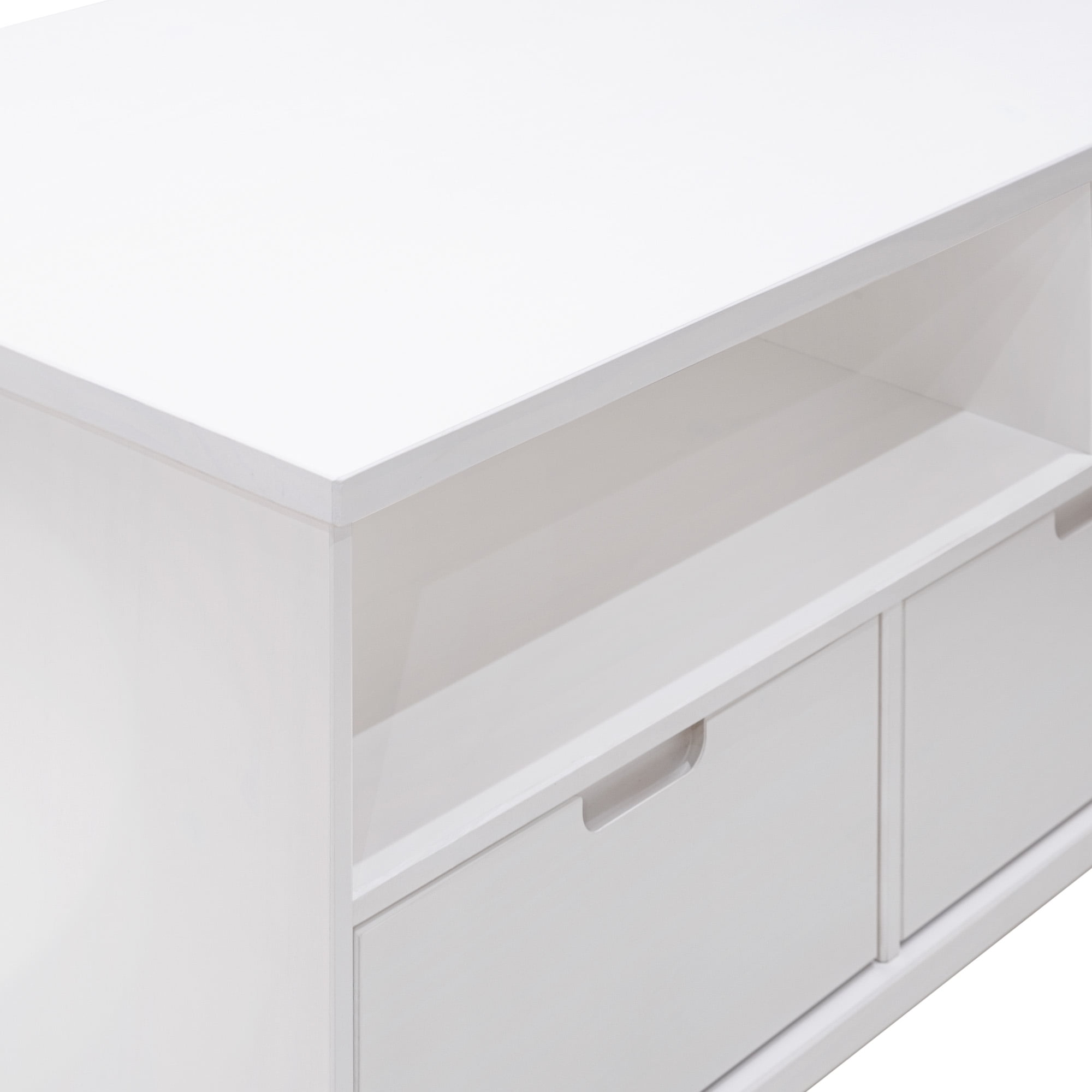 Mid-century modern TV stand White painted finish 3 drawers on telescoping metal slides Angled sides to fit corners easily Cut-out handles for a natural look Choose from three attractive finishes to match your style Solid wood construction Ships ready-to-assemble with step-by-step instructions Assembled Dimensions: 23.5″ H x 52″ L x 25.75″ W Packaged Dimensions: 7.09” H x 55” L x 18.31” W
