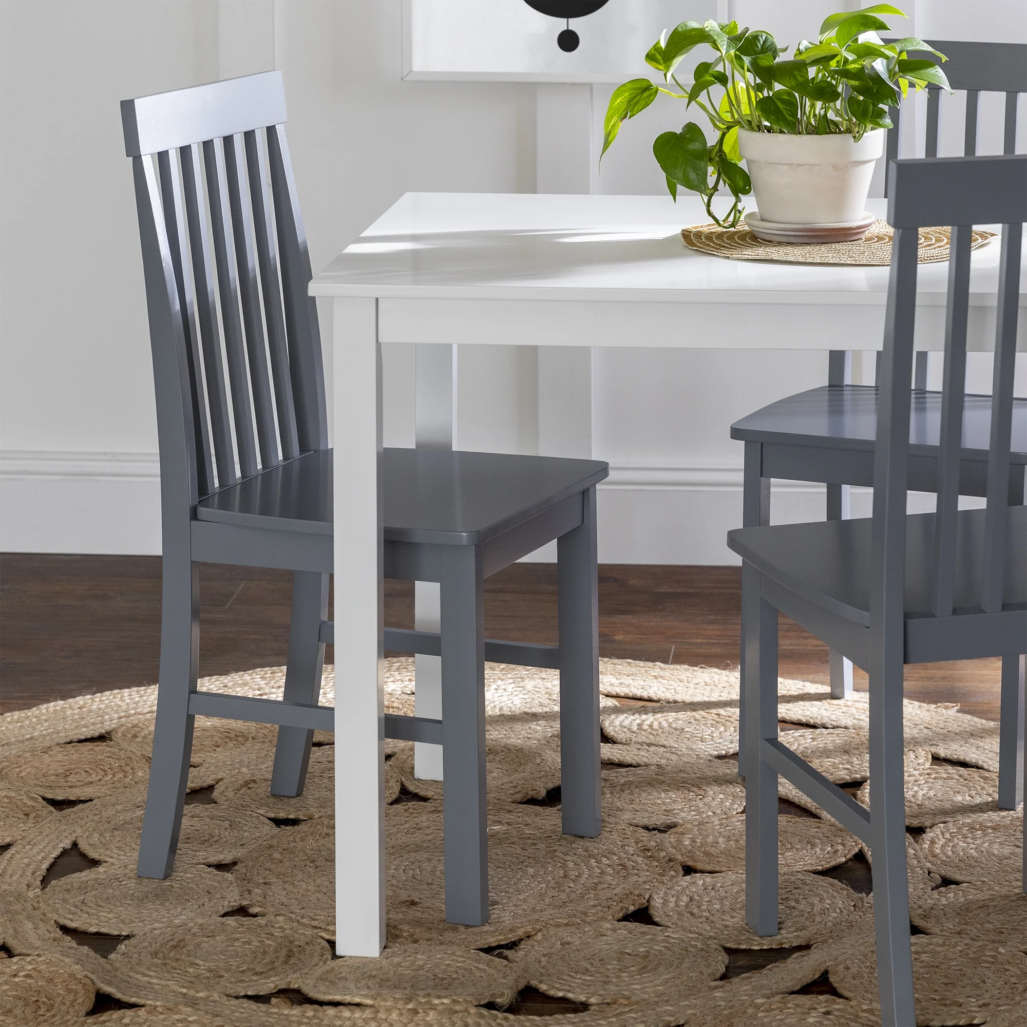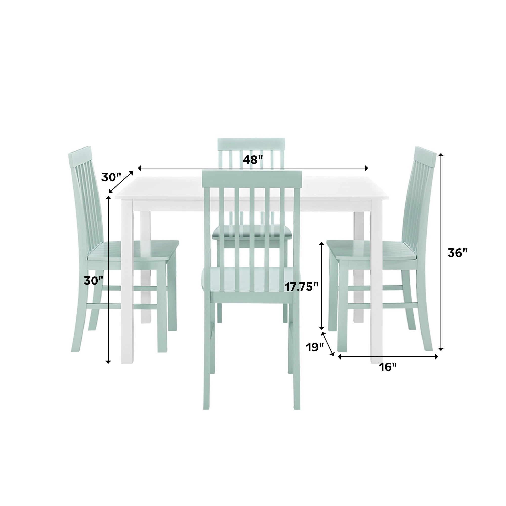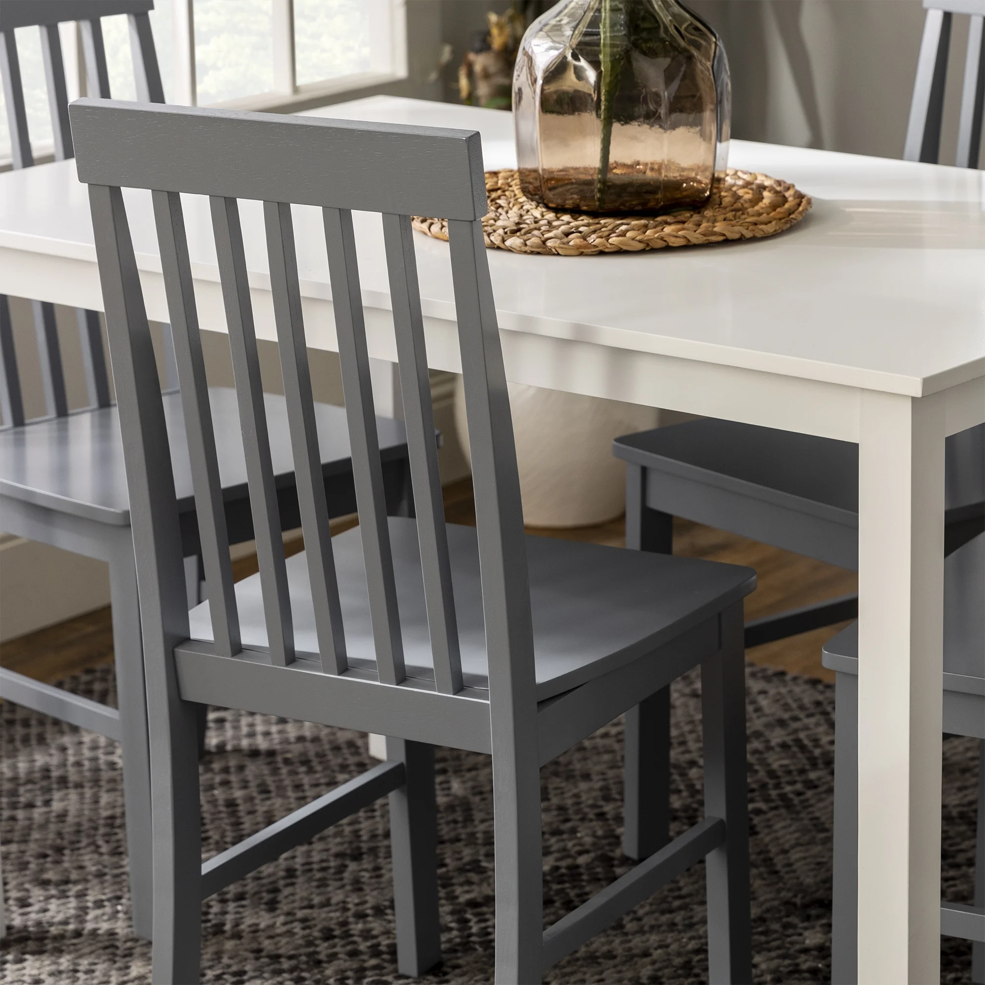 Modern farmhouse 5 piece dining set Includes 4 chairs and 1 table Slightly curved, spindle chair backrests Solid wood table and chairs Beautiful painted finish Rectangle tabletop great for kitchens or game rooms Small-space living friendly Assembly is required