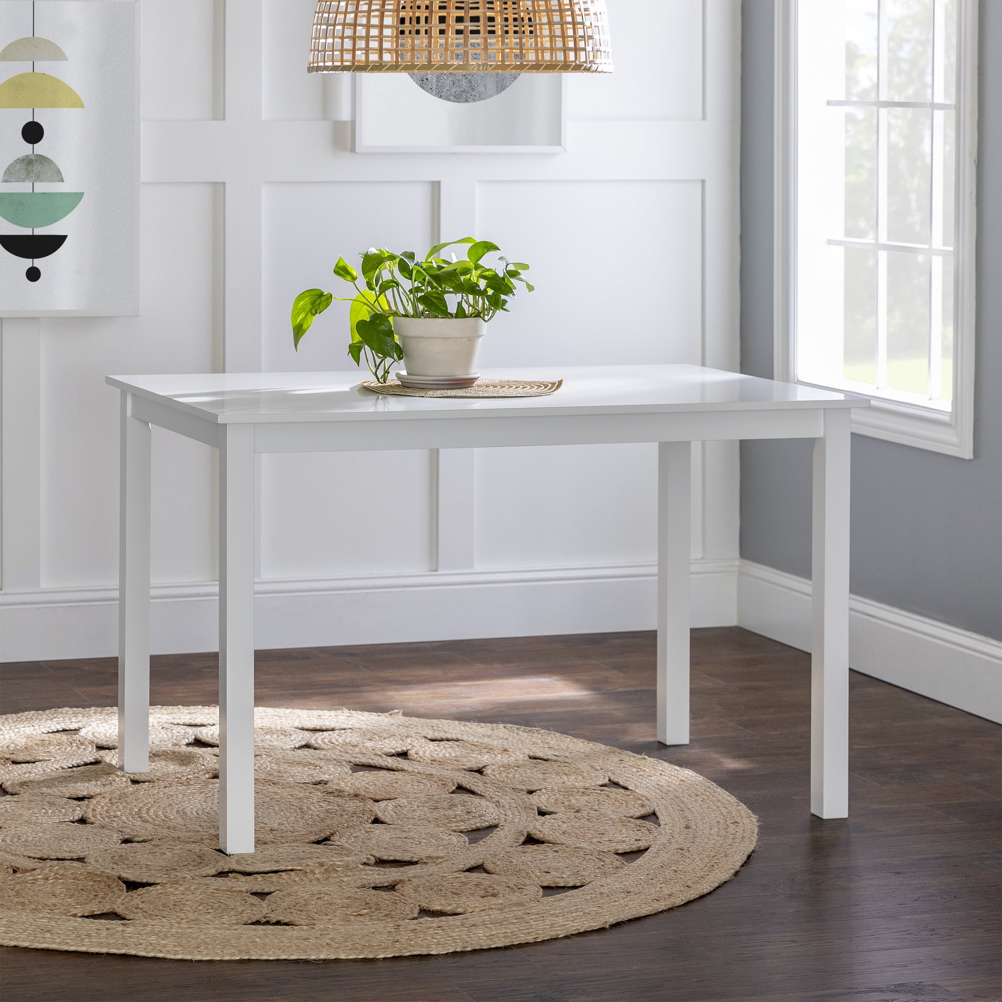 Modern farmhouse 5 piece dining set Slightly curved, spindle chair backrests Includes 4 chairs and 1 table Solid wood table and chairs Beautiful painted finish Rectangle tabletop great for kitchens or game rooms Small-space living friendly Assembly is required