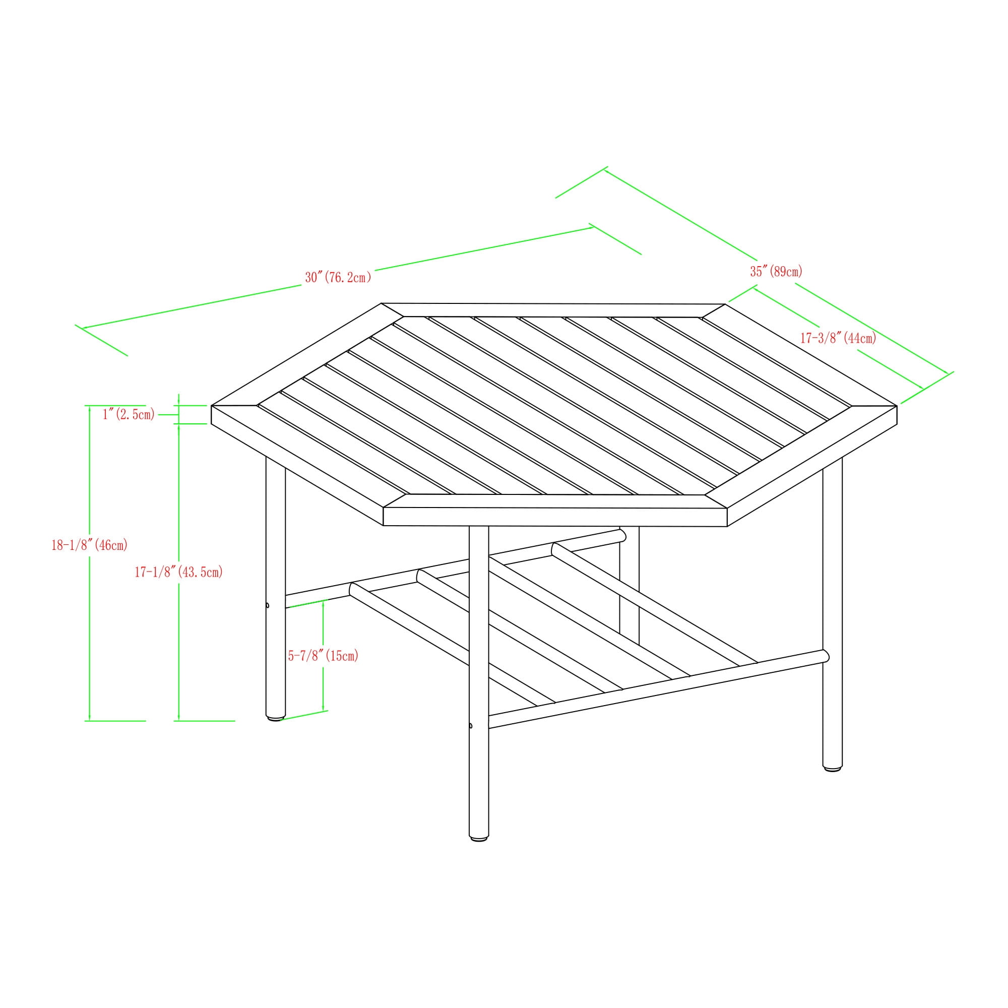 Weather-resistant acacia wood tabletop Responsibly harvested materials Smooth powder-coated steel legs for a durable frame Boho, hexagon table design 1 lower shelf for added storage Ships ready-to-assemble Place in a living room, sunroom, or patio Apply teak oil to keep wood vibrant Apply teak oil occasionally to keep wood vibrant Assembled Dimensions: 18.25” H x 34.5” L x 30” W Packaged Dimensions: 6” H x 37” L x 32.5” W Ships ready-to-assemble in 1 convenient box