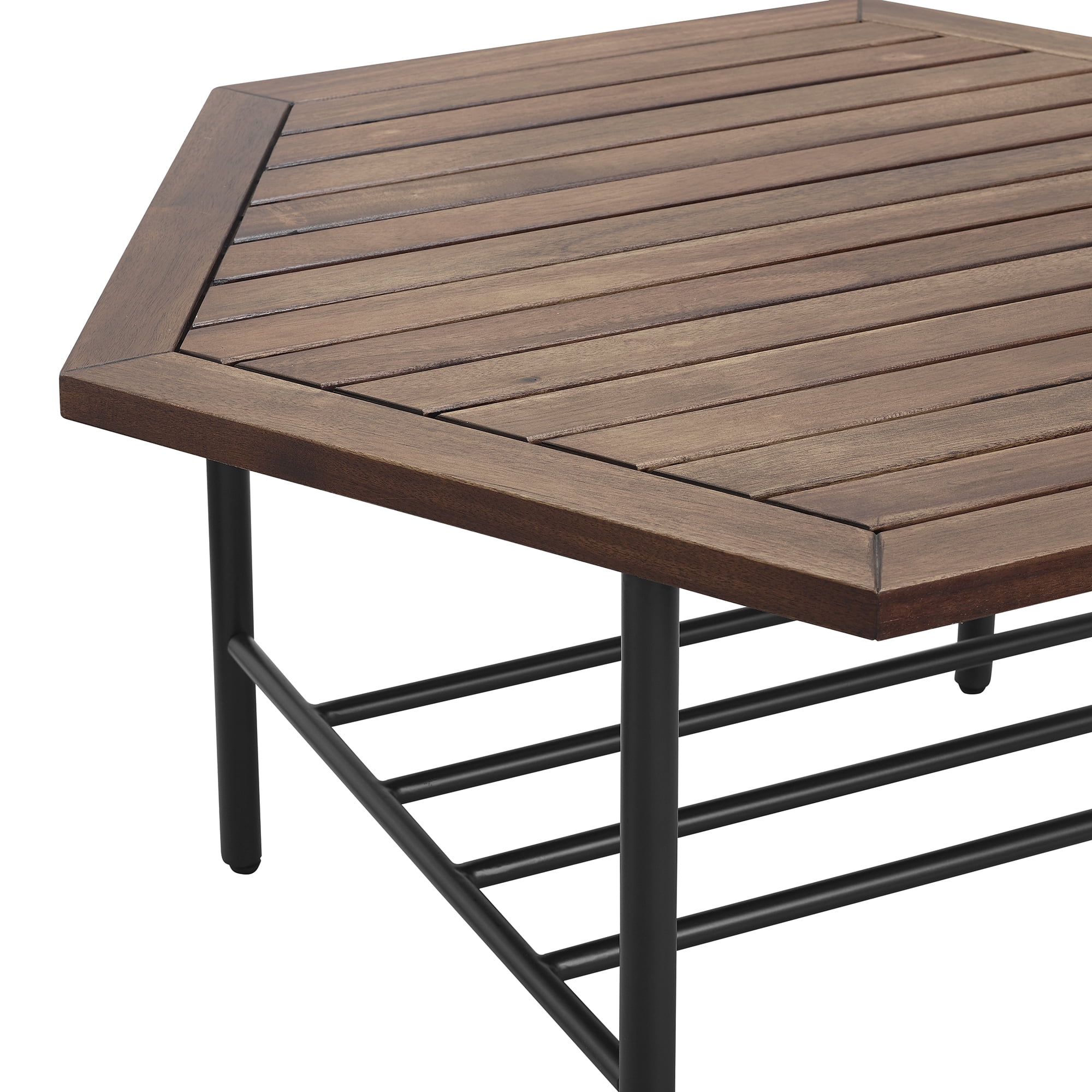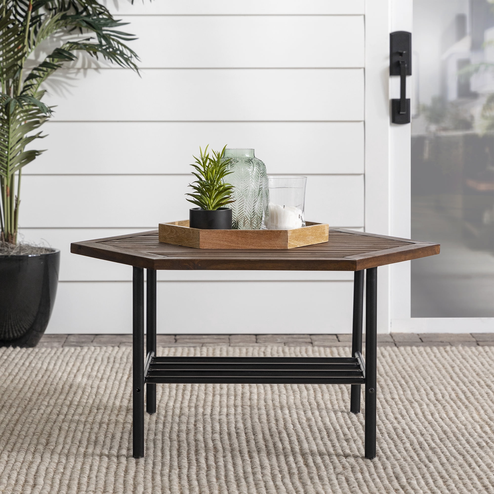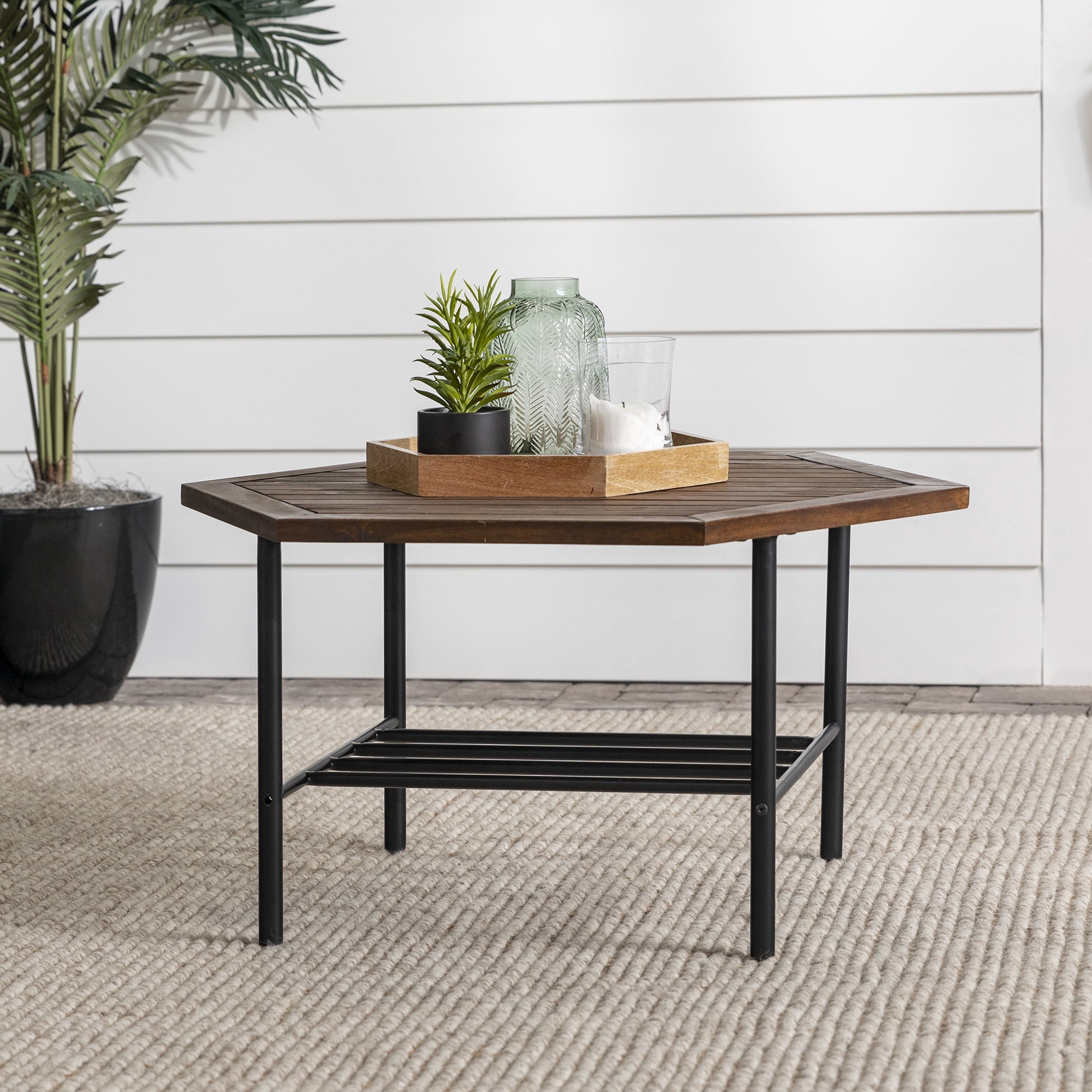 Enjoy cold beverages and your favorite snacks during a warm summer afternoon on your patio using this Walker Edison Modern Acacia Wood Hexagon Outdoor Patio Coffee Table. The contemporary hexagon shape and plank tabletop offer a trendy aesthetic to your favorite hosting spot. You can trust the durable, powder-coated steel legs and lower metal-bar shelf to hold precious outdoor accessories. And the acacia wood offers a water and UV-resistant element for a long-lasting frame that you can enjoy through many more seasons. Pair this classy backyard cocktail table with a loveseat or club chairs for a warm ambiance that all the neighbors will love.