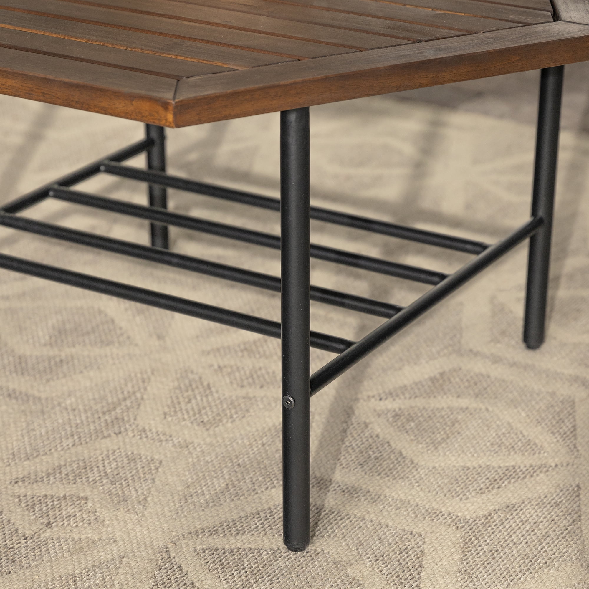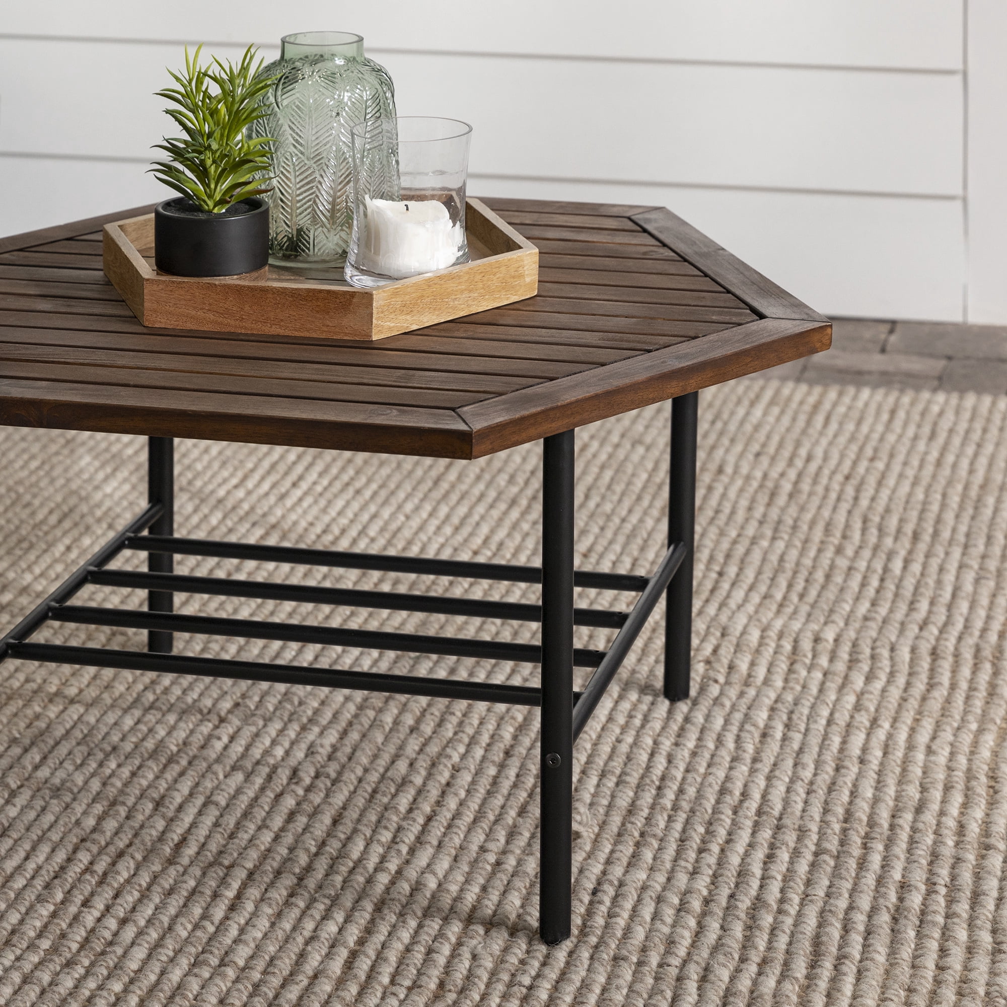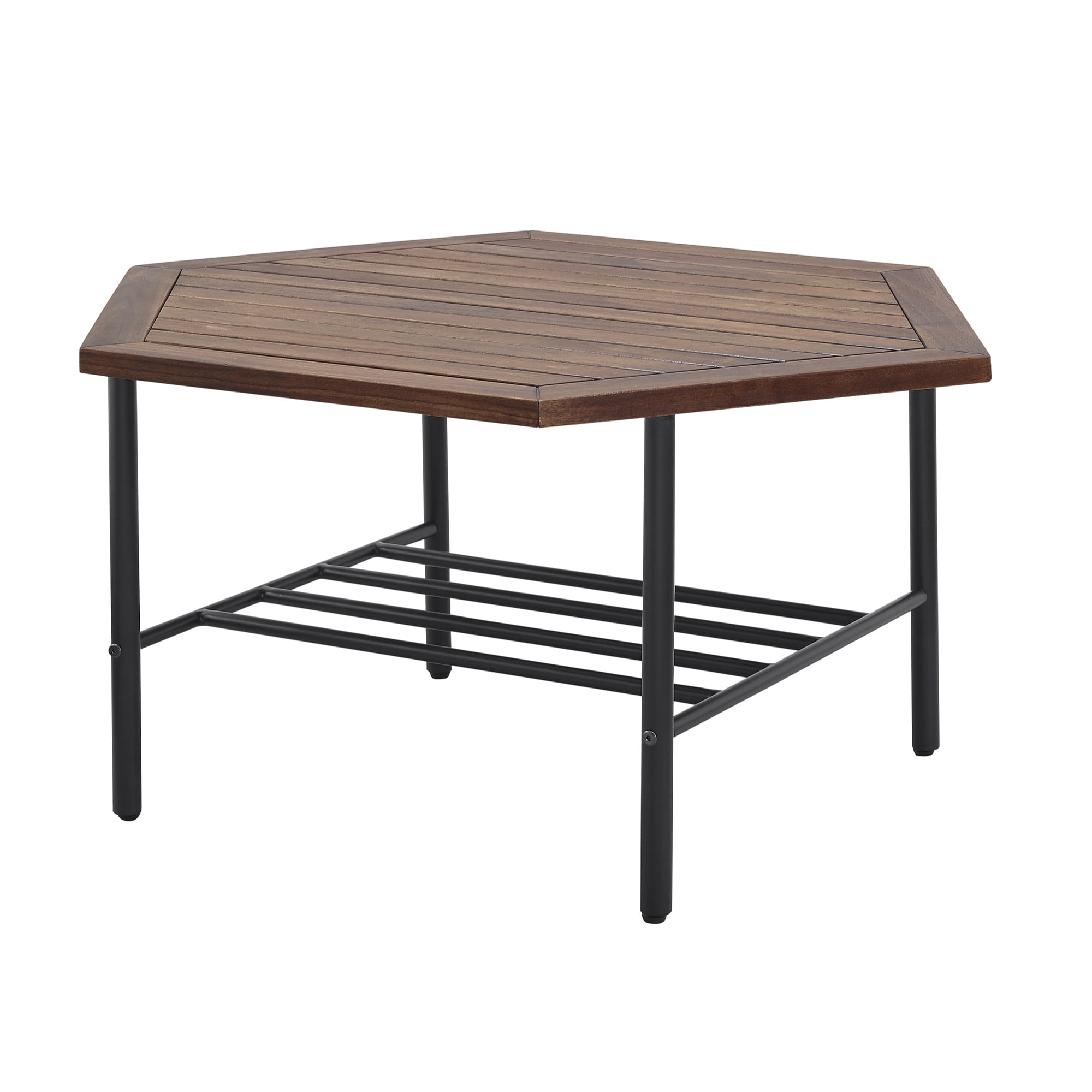 Enjoy cold beverages and your favorite snacks during a warm summer afternoon on your patio using this Walker Edison Modern Acacia Wood Hexagon Outdoor Patio Coffee Table. The contemporary hexagon shape and plank tabletop offer a trendy aesthetic to your favorite hosting spot. You can trust the durable, powder-coated steel legs and lower metal-bar shelf to hold precious outdoor accessories. And the acacia wood offers a water and UV-resistant element for a long-lasting frame that you can enjoy through many more seasons. Pair this classy backyard cocktail table with a loveseat or club chairs for a warm ambiance that all the neighbors will love.