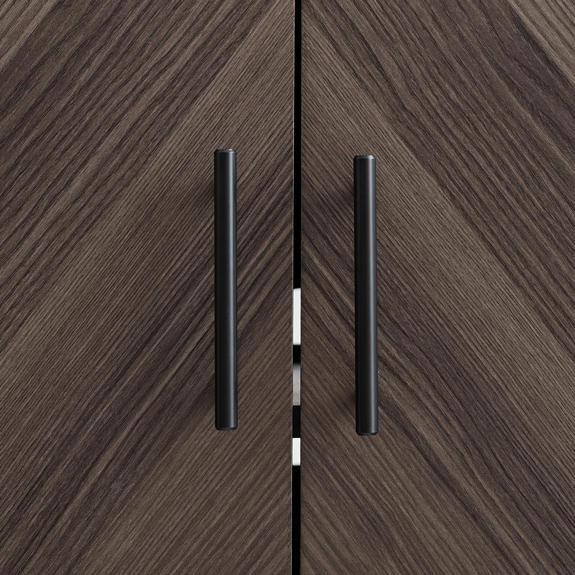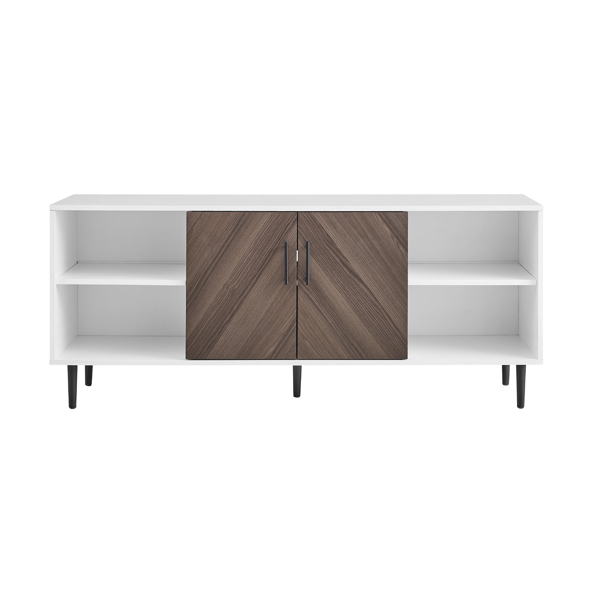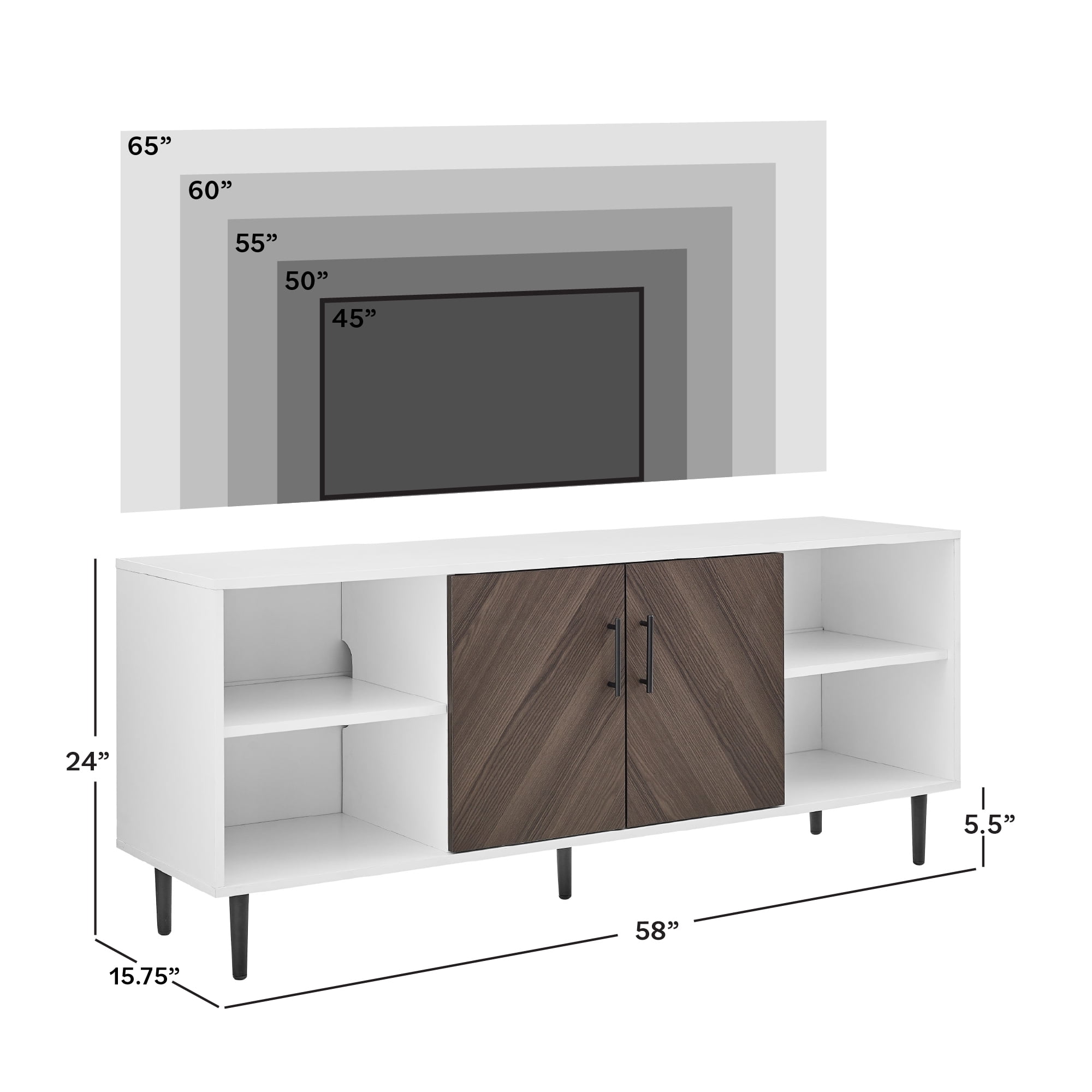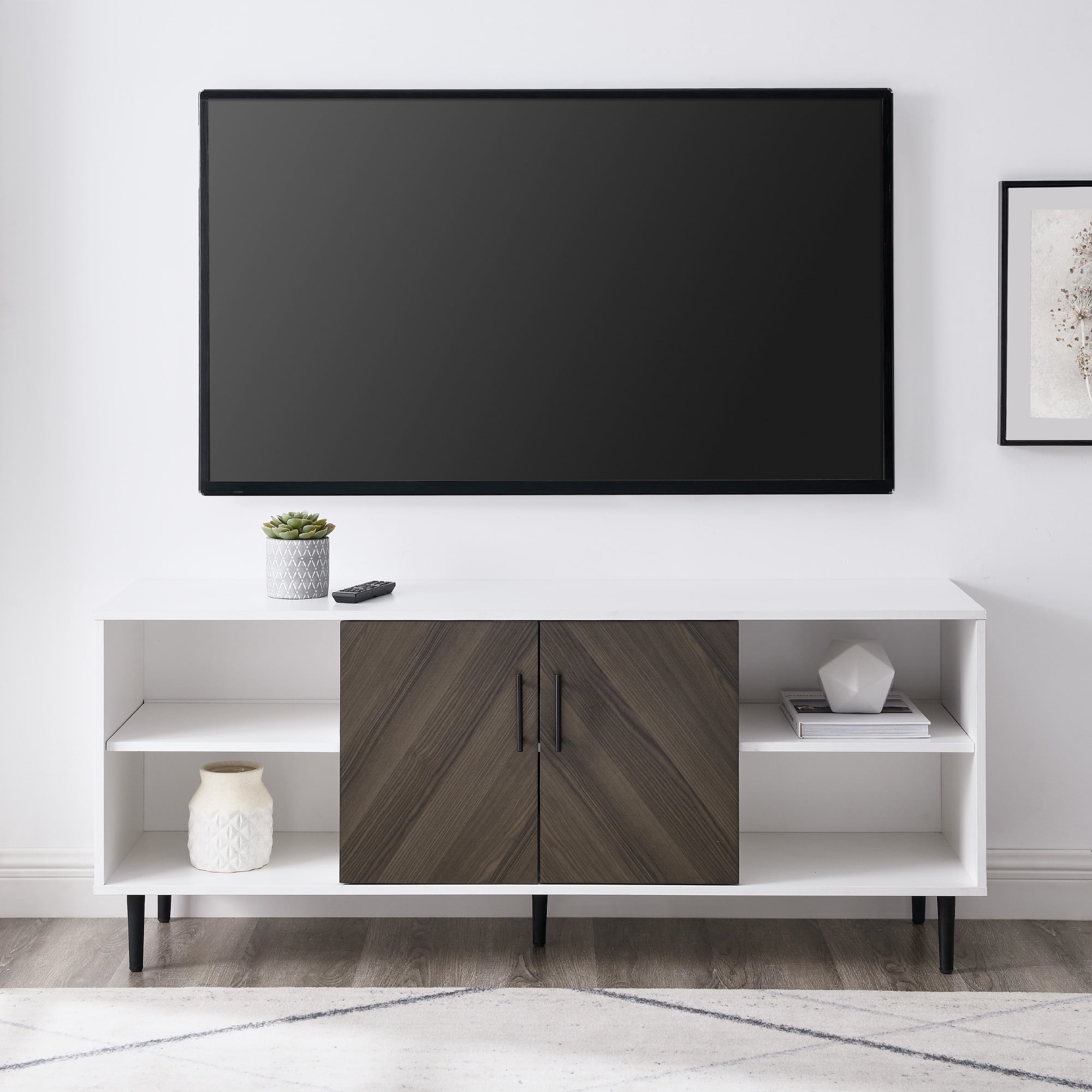 Faux-book match doors add a unique, contemporary look Versatile, modern style Ash brown book match and white finishes 2 doors with soft-close hinges Adjustable shelves for customizable organization Open and closed storage Adjustable feet for easy balance Cord management ports keep cables tidy Accommodates TVs up to 65 inches Made from warp-resistant MDF wood, durable laminate, and powder-coated steel Ships ready-to-assemble with step-by-step instructions Assembled Dimensions: 24″ H x 58″ L x 15.75″ W Packaged Dimensions: 6″ H x 63″ L x 19″ W