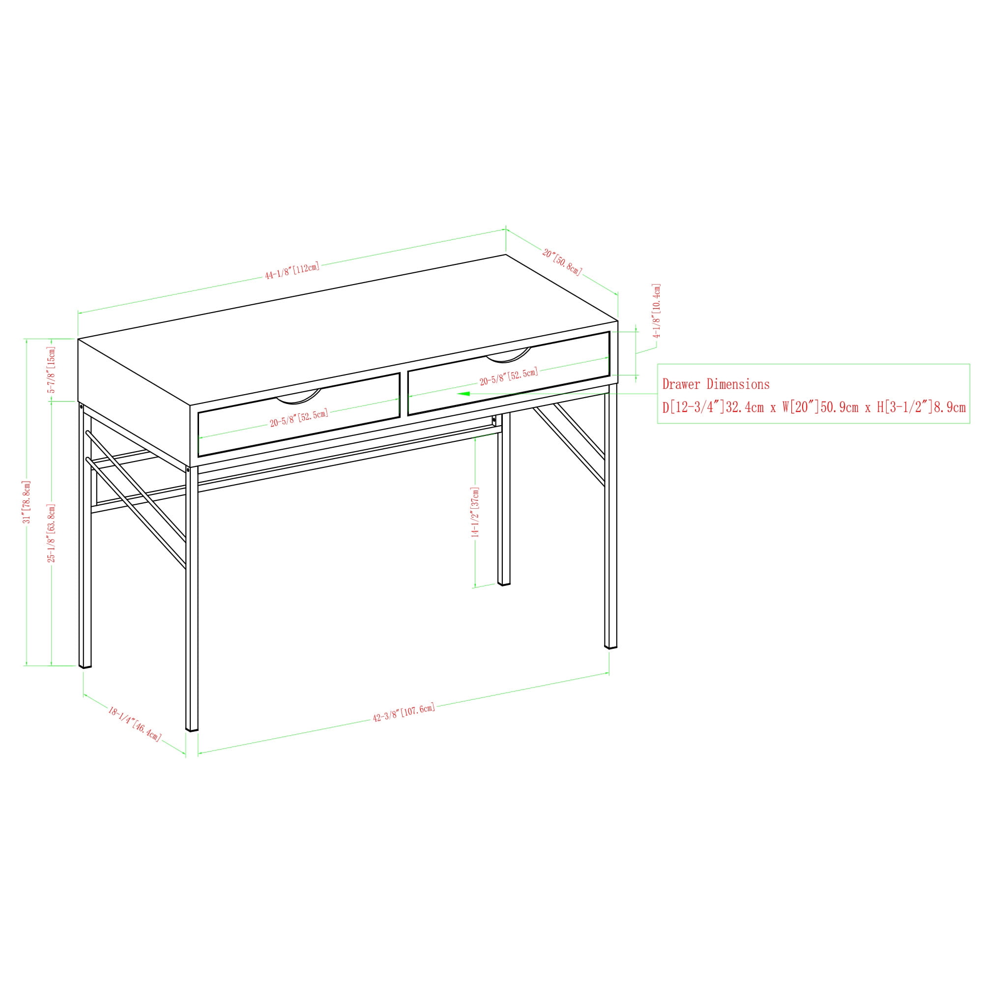 Modern eclectic style Grey finish 2 drawers on smooth-opening wood runners Fabric lined drawer interiors for an expensive feel Sturdy metal legs with decorative details Faux shagreen adds a gorgeous texture Attractive cutout handles Easy assembly—just add the base Made from warp-resistant MDF wood and powder-coated steel Ships ready-to-assemble with step-by-step instructions Assembled Dimensions: 31” H x 44” L x 20” W Packaged Dimensions: 14” H x 49” L x 25.4” W