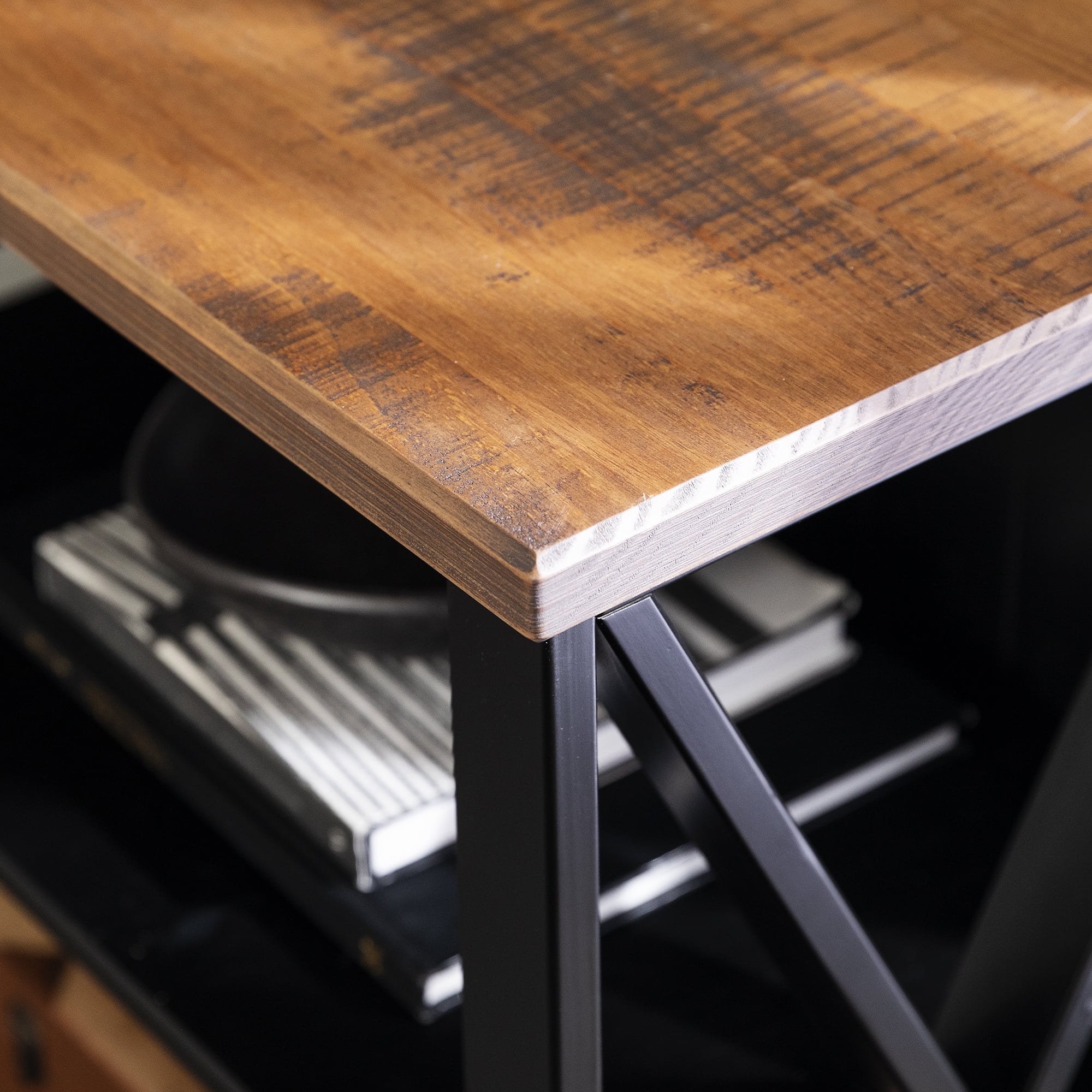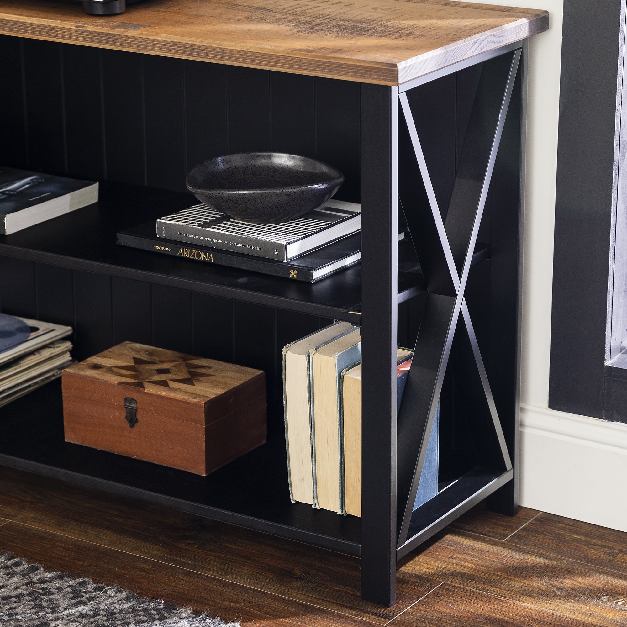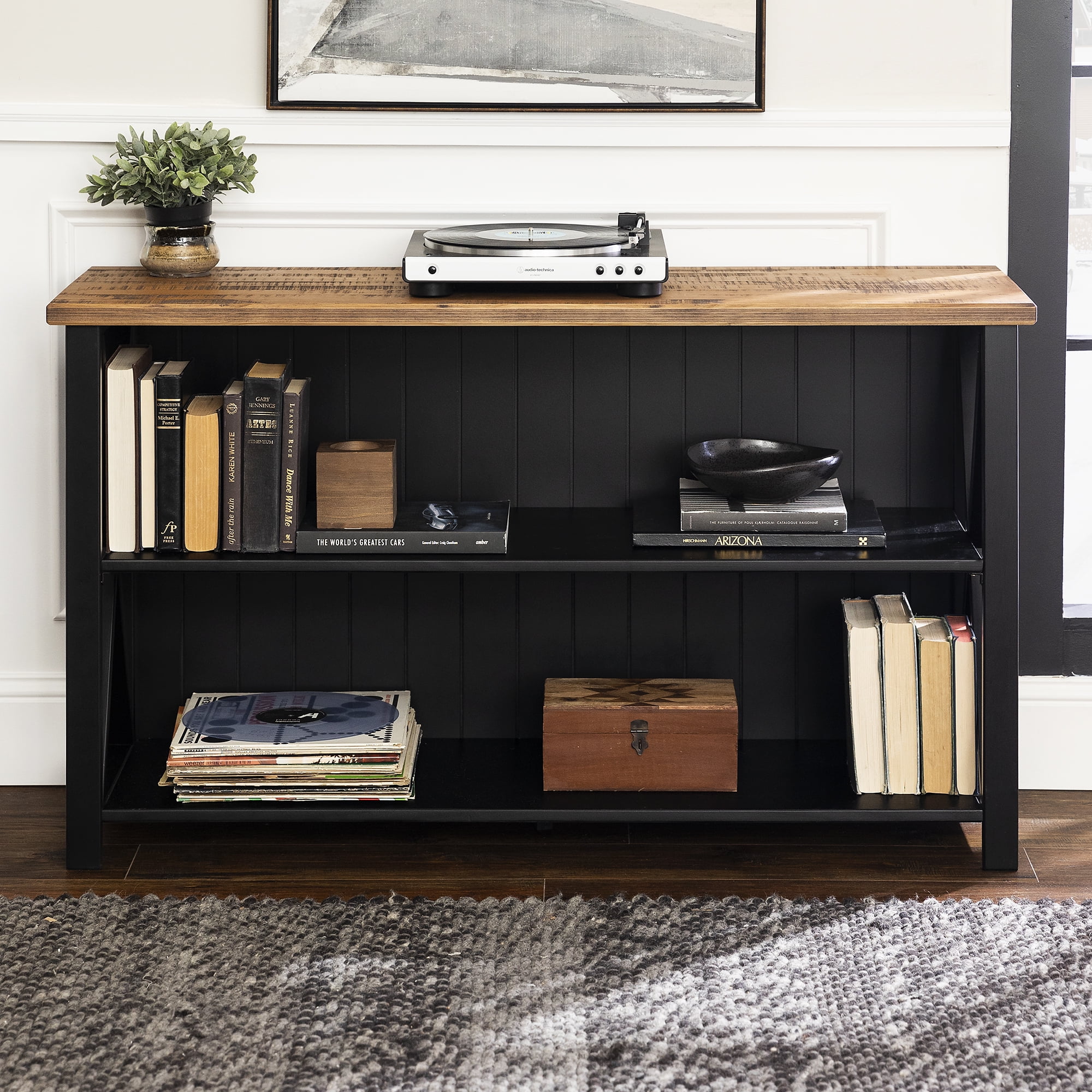 Modern farmhouse style Black and Reclaimed Barnwood finish Two fixed shelves Classic X-framed sides Featuring a beadboard-style back Stylish two-tone design Ships ready to assemble with step-by-step instructions Assembled dimensions: 30″ H x 52″ L x 17″ W Packaged dimensions: 6″ H x 58″ L x 37″ W
