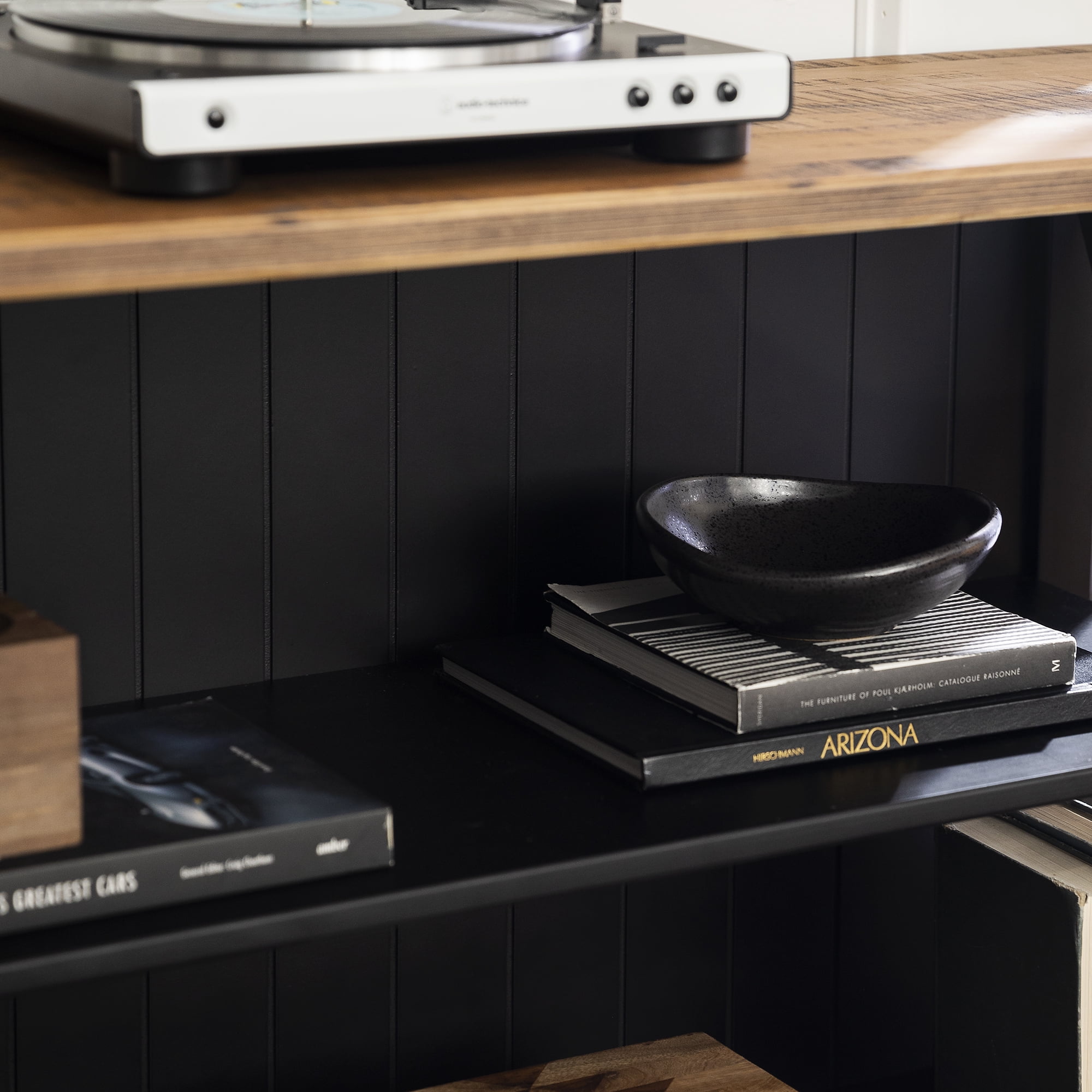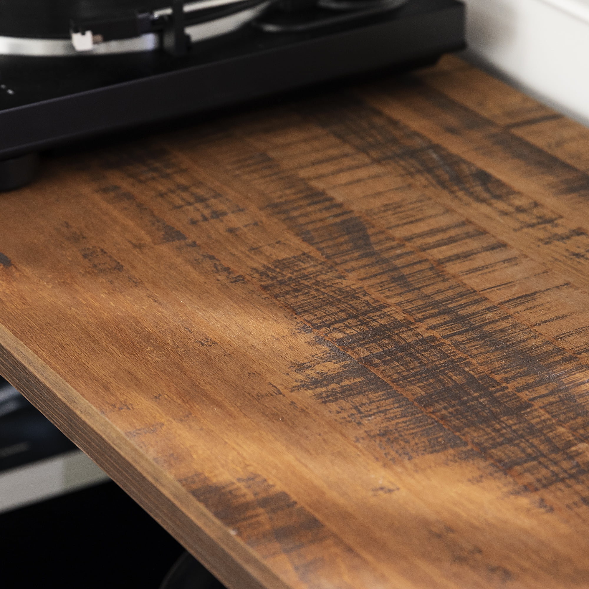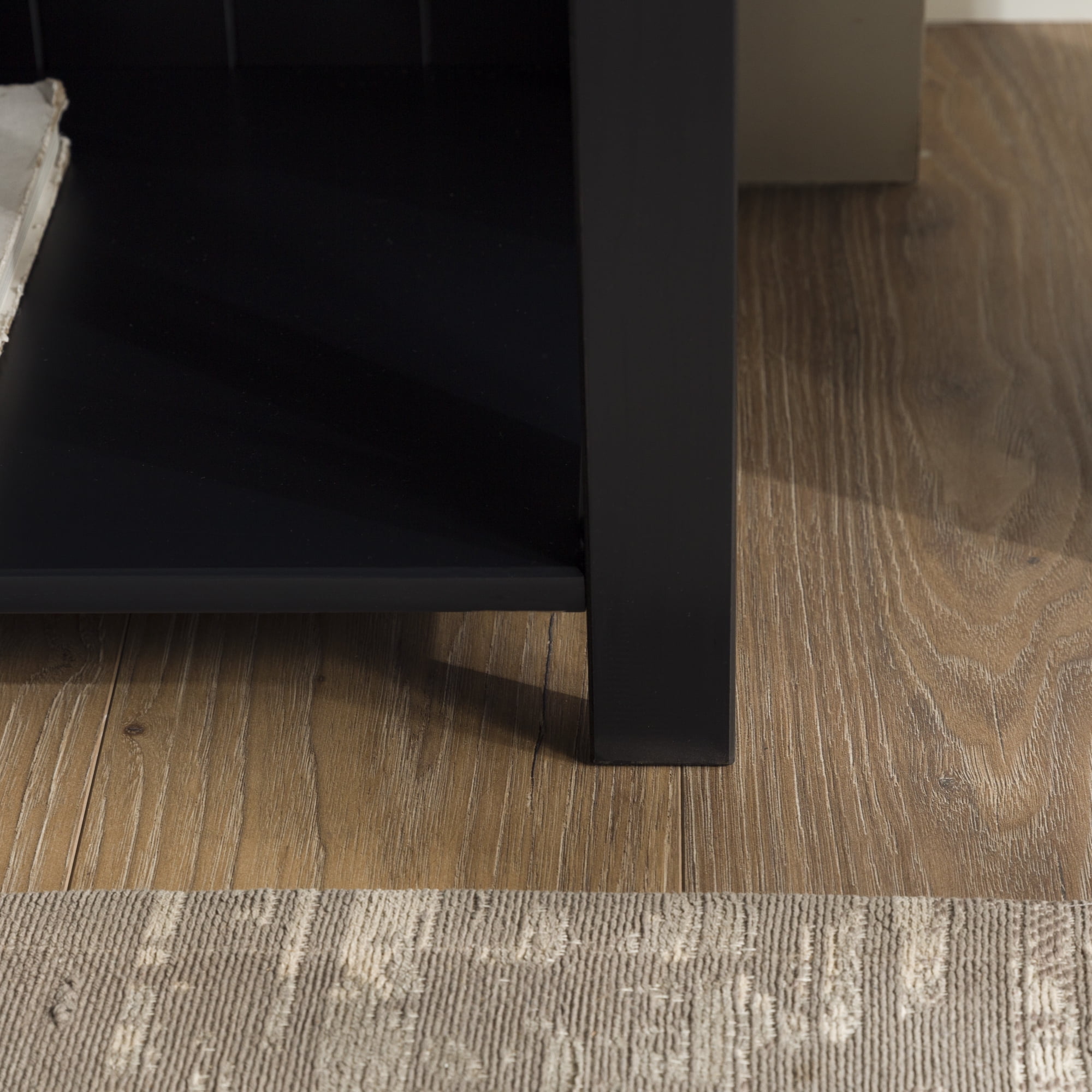 Modern farmhouse style Black and Reclaimed Barnwood finish Two fixed shelves Classic X-framed sides Featuring a beadboard-style back Stylish two-tone design Ships ready to assemble with step-by-step instructions Assembled dimensions: 30″ H x 52″ L x 17″ W Packaged dimensions: 6″ H x 58″ L x 37″ W