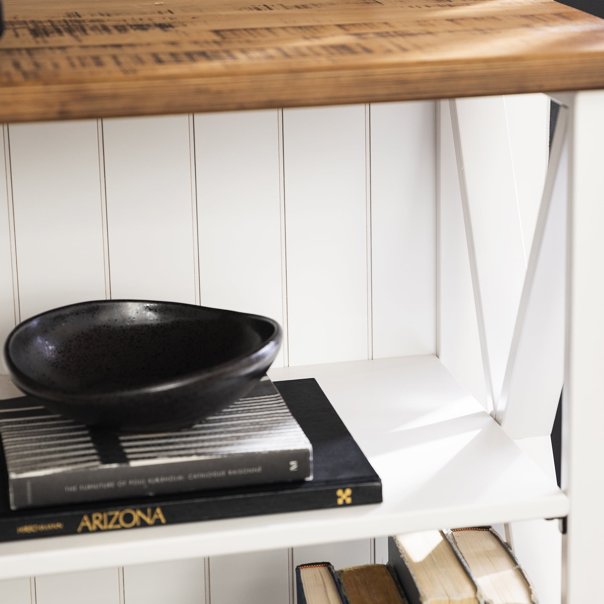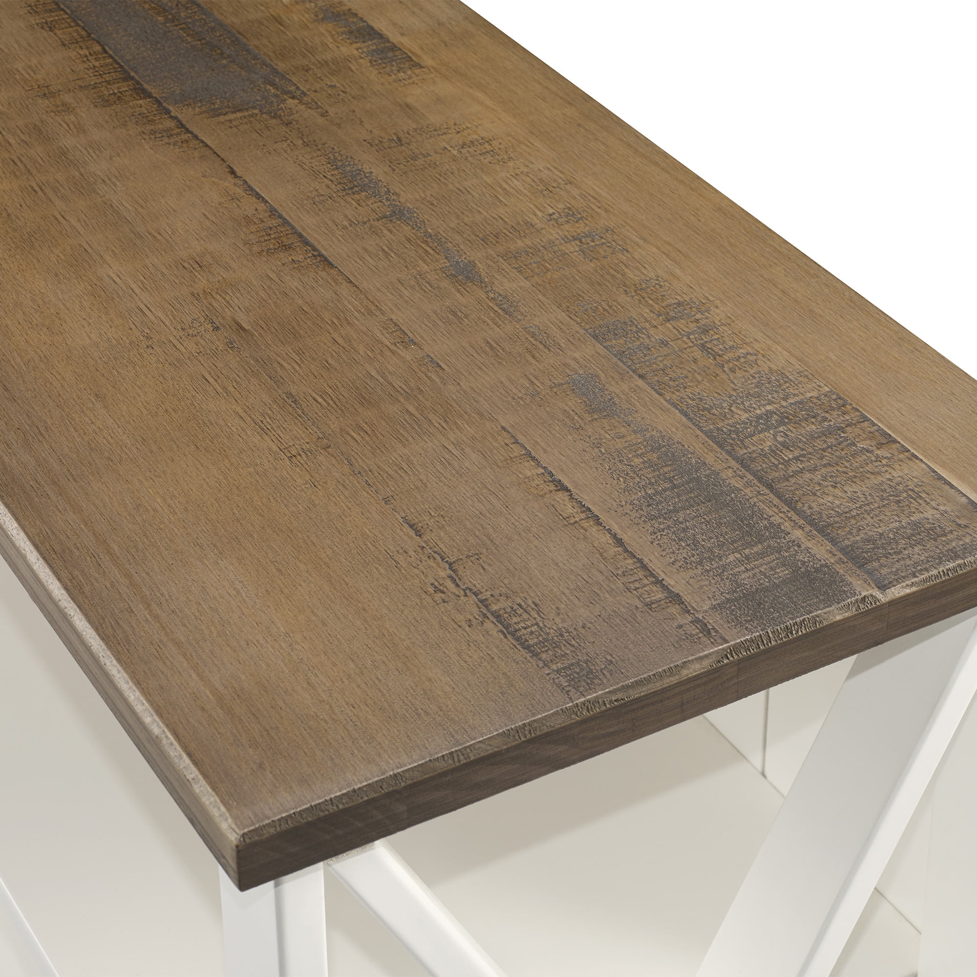 Modern farmhouse style White and Reclaimed Barnwood finish Two fixed shelves Classic X-framed sides Featuring a beadboard-style back Stylish two-tone design Ships ready to assemble with step-by-step instructions Assembled dimensions: 30″ H x 52″ L x 17″ W Packaged dimensions: 6″ H x 58″ L x 37″ W