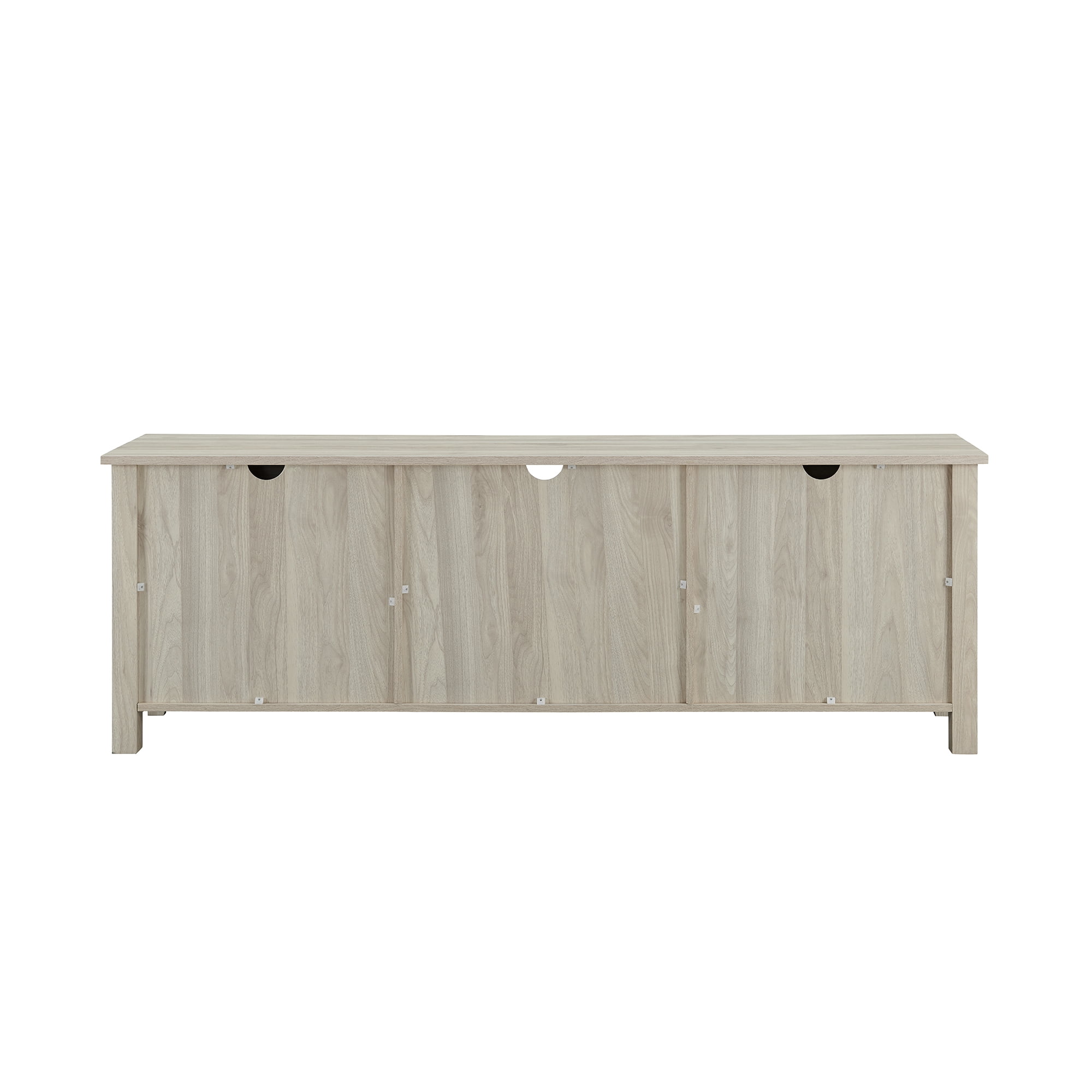 Packaged dimensions: 5″ H x 75″ L x 23″ W Assembled Dimensions: 24” H x 70” L x 16” W Materials: Warp-resistant MDF, tempered glass, and durable laminate Assembly required with step-by-step instructions Birch finish Coastal TV stand 3 adjustable shelves 2 doors with adjustable metal spring-loaded hinges Window pane glass door fronts Cord management holes Metal hardware Accommodates TVs up to 80”