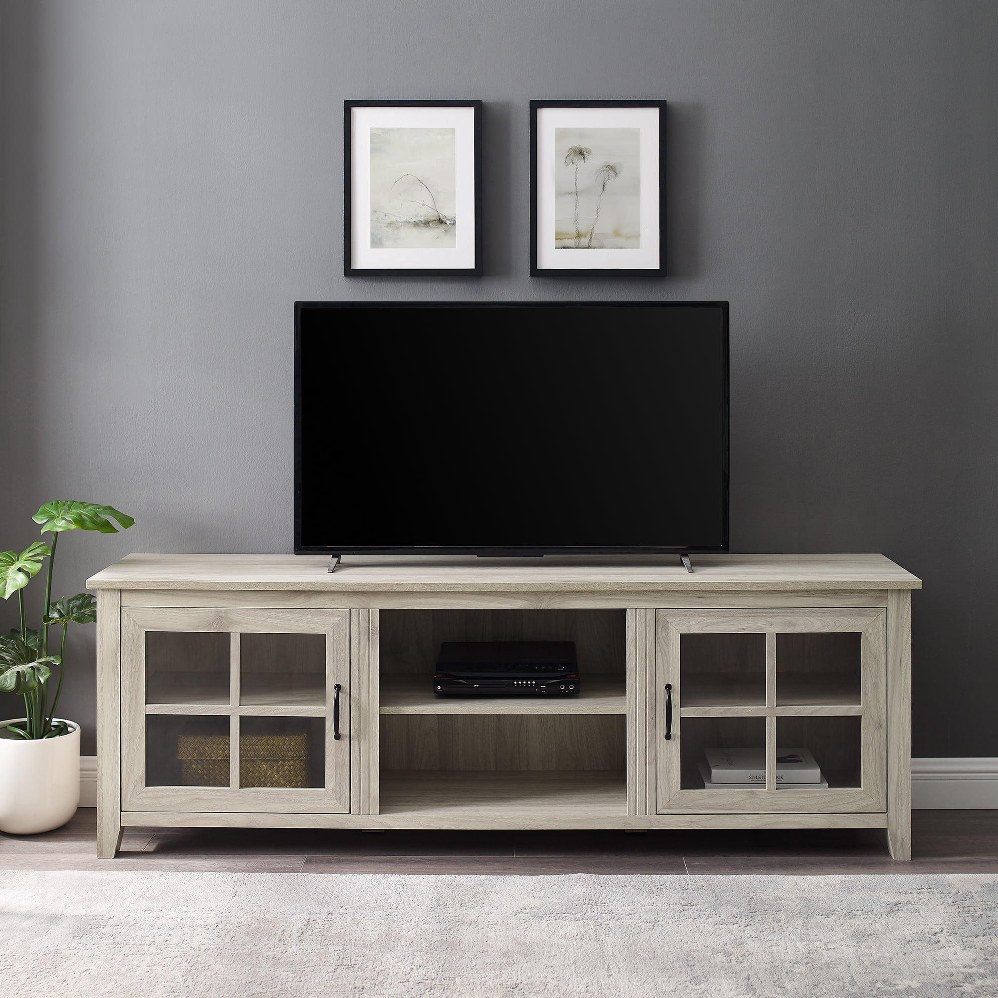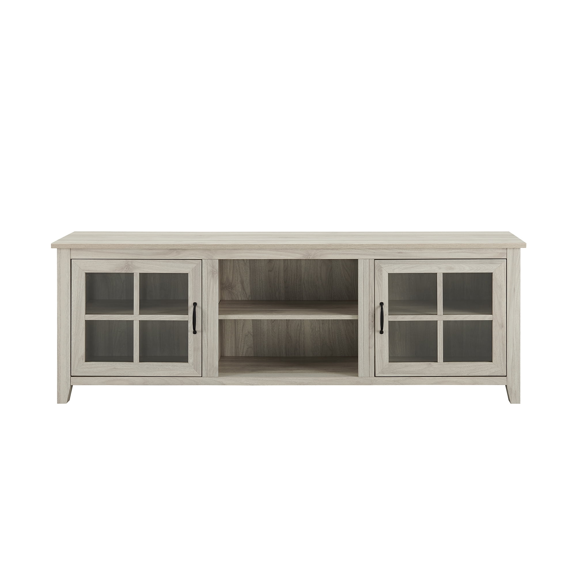 Display decor, gaming system, and more in style with this wood TV stand from Walker Edison. Window pane side cabinets feature tempered safety glass for coastal vibes. For a timeless addition to your home, this entertainment center includes both open and closed storage space. Center open shelving provide room for electronics, with cord management to keep wires looking tidy. Including adjustable shelving, this storage cabinet makes it simple to organize your essentials in an intuitive way. Use as a TV stand in your living room to accommodate up to an 80-inch TV or as a buffet in your dining room for tablecloths, plates, and glassware.
