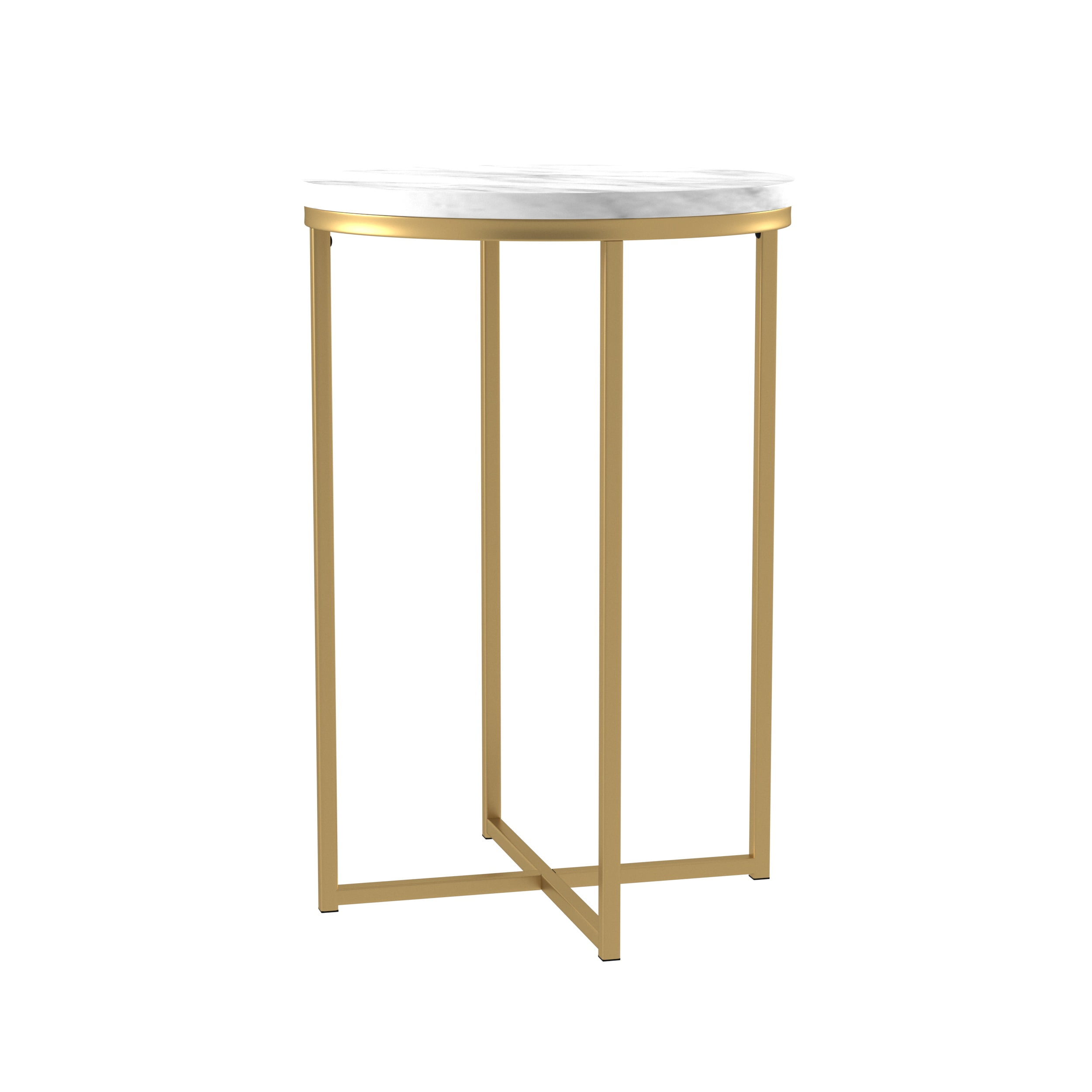 Packaged dimensions: 4″ H x 27″ L x 20″ W Assembled Dimensions: 24” H x 16” L x 16” W Materials: High-quality MDF, durable laminate, and painted metal Assembly: Some assembly required Faux marble tabletop and gold leg finish Modern glam style side table X-base for stability Round tabletop and base