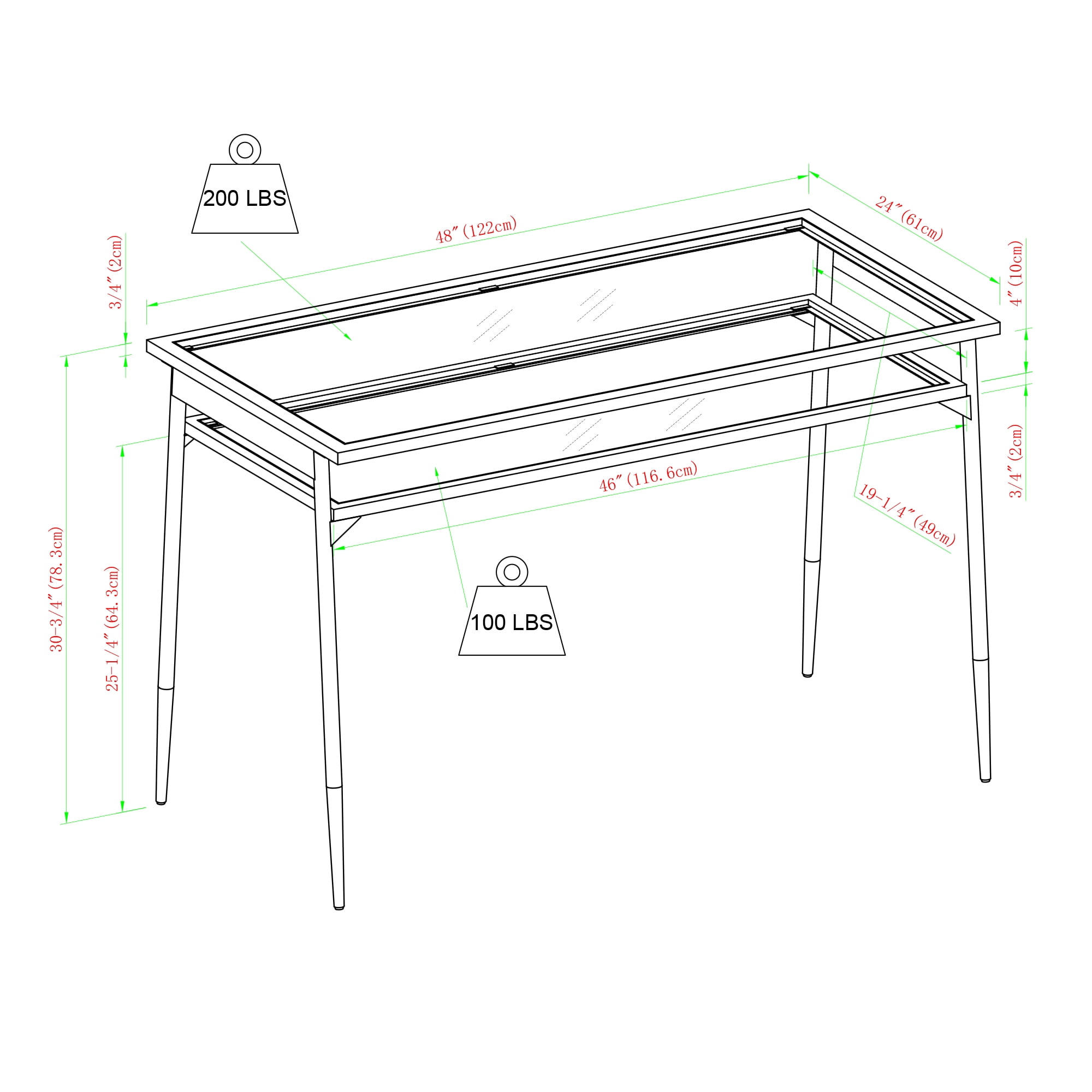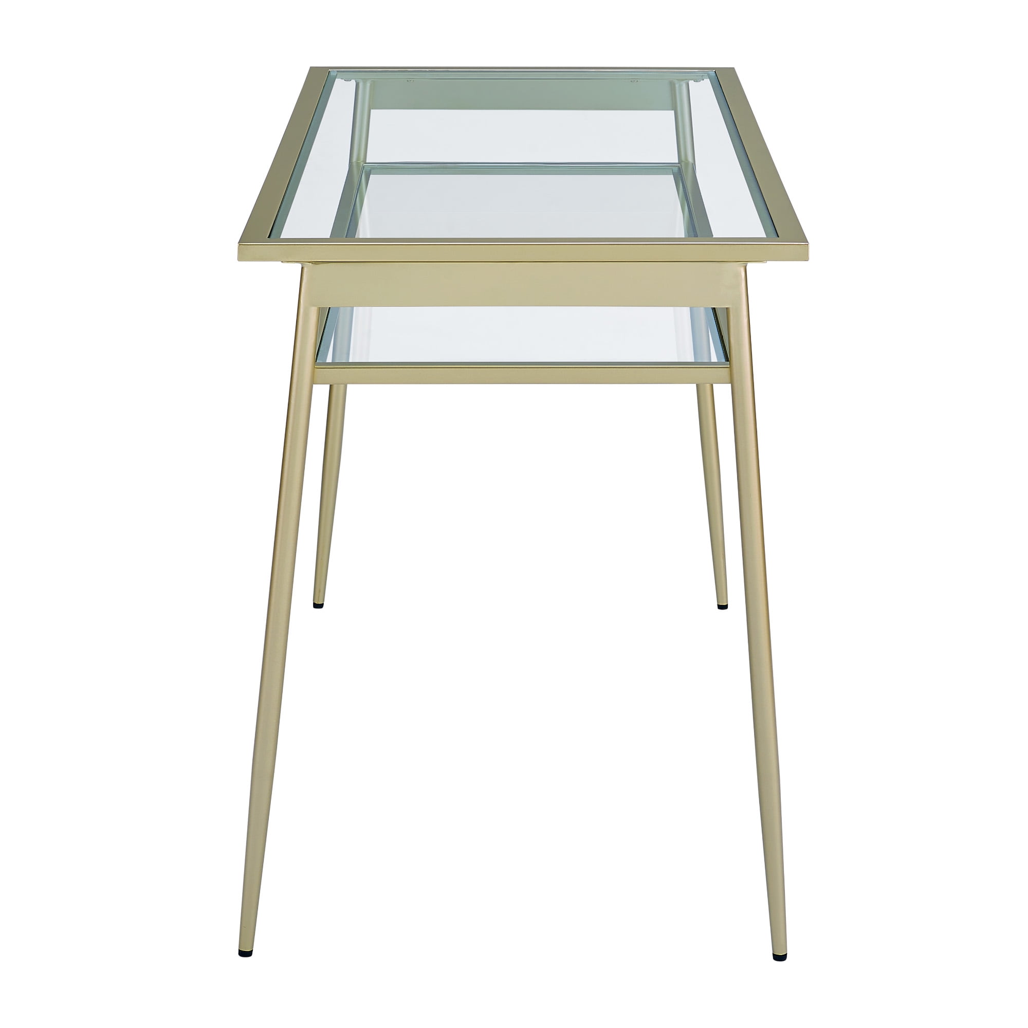 Modern contemporary style Gold finish Sleek glass tabletop and lower shelf Strong, painted steel frame Attractive metal tapered legs Use as a vanity in the bedroom or writing desk in the office Ships ready-to-assemble with step-by-step instructions Capped feet protect floors from scratching Assembled Dimensions: 30.5” H x 48” L x 24” W Packaged Dimensions: 6” H x 50.5” L x 26” W