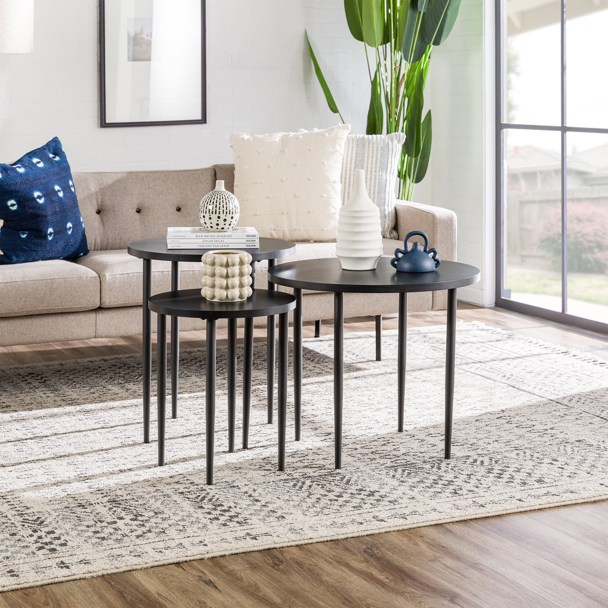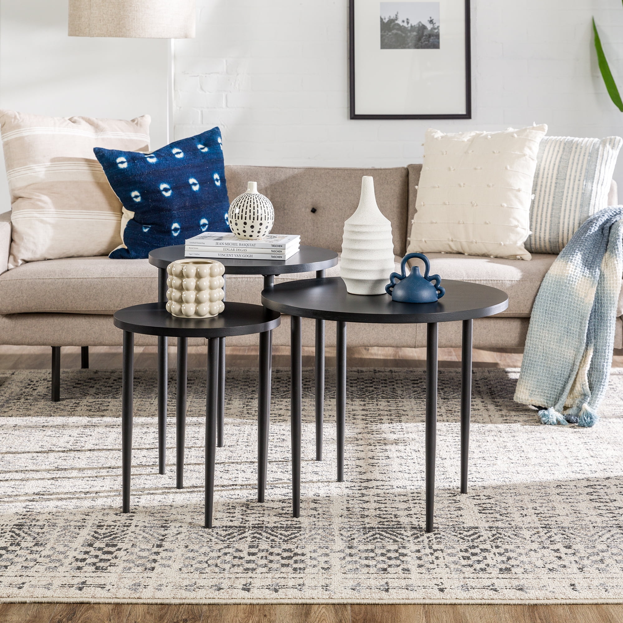 A versatile living room starts with Walker Edison Modern Round Nesting Coffee Tables with Tapered Legs. The three tables can tuck underneath one another create more room in front of the couch or accommodate small spaces. Spread the tables apart to fill out the area and add more surfaces to place drinks, snacks, or decorations. This trio of occasional tables features tapered metal legs for a subtle Mid-century modern touch to your contemporary living room.