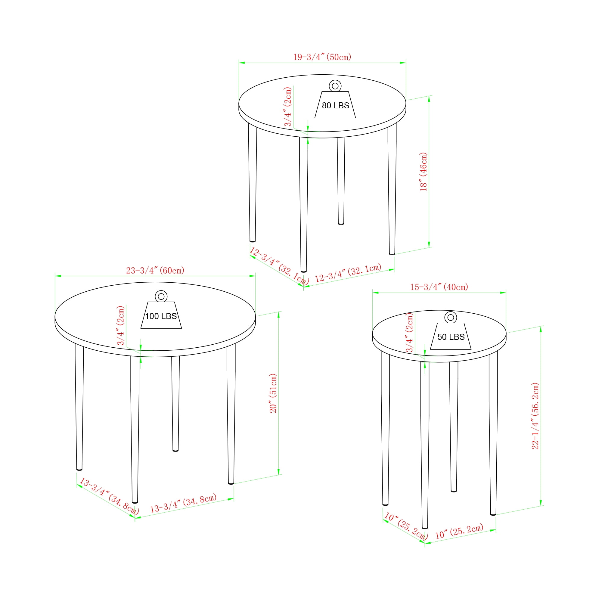 Contemporary, Industrial style Black tabletop finish Choose from 3 attractive finishes to match your style Nesting tables slide underneath each other Mid-century modern style tapered legs Made from warp-resistant MDF wood, durable laminate, and powder-coated steel Ships ready-to-assemble with step-by-step instructions Assembled Dimensions: Tallest table – 22″ H x 15.5″ L x 15.5″ W; Middle table – 25″ H x 23.5″ L 23.5″ W; Shortest table: 18″ H x 19.6″ L 19.6″ W Packaged Dimensions: 5″ H x 27″ L x 27″ W