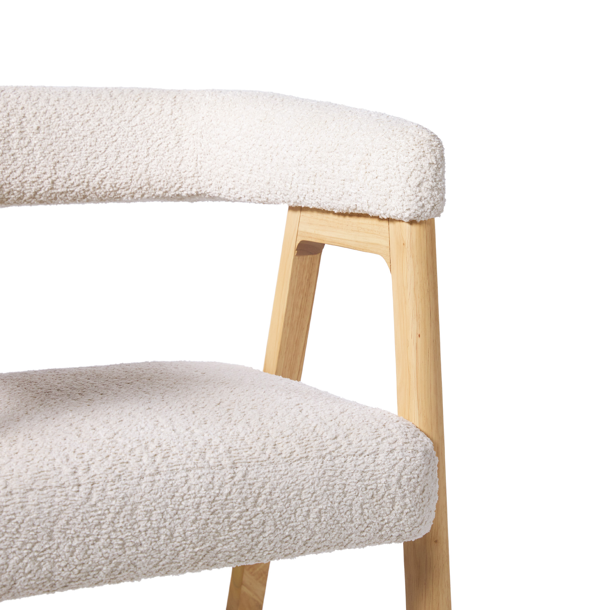 Clean, modern-inspired design style Ivory finish On-trend curved back design Comfortable armrests Sophisticated boucle fabric adds texture Made from solid rubberwood Ships ready-to-assemble with step-by-step instructions Assembled dimensions 35 ¼” H x 23 ¼” L x 23” W Packaged dimensions 9.375” H x 34.75” L x 25.375” W