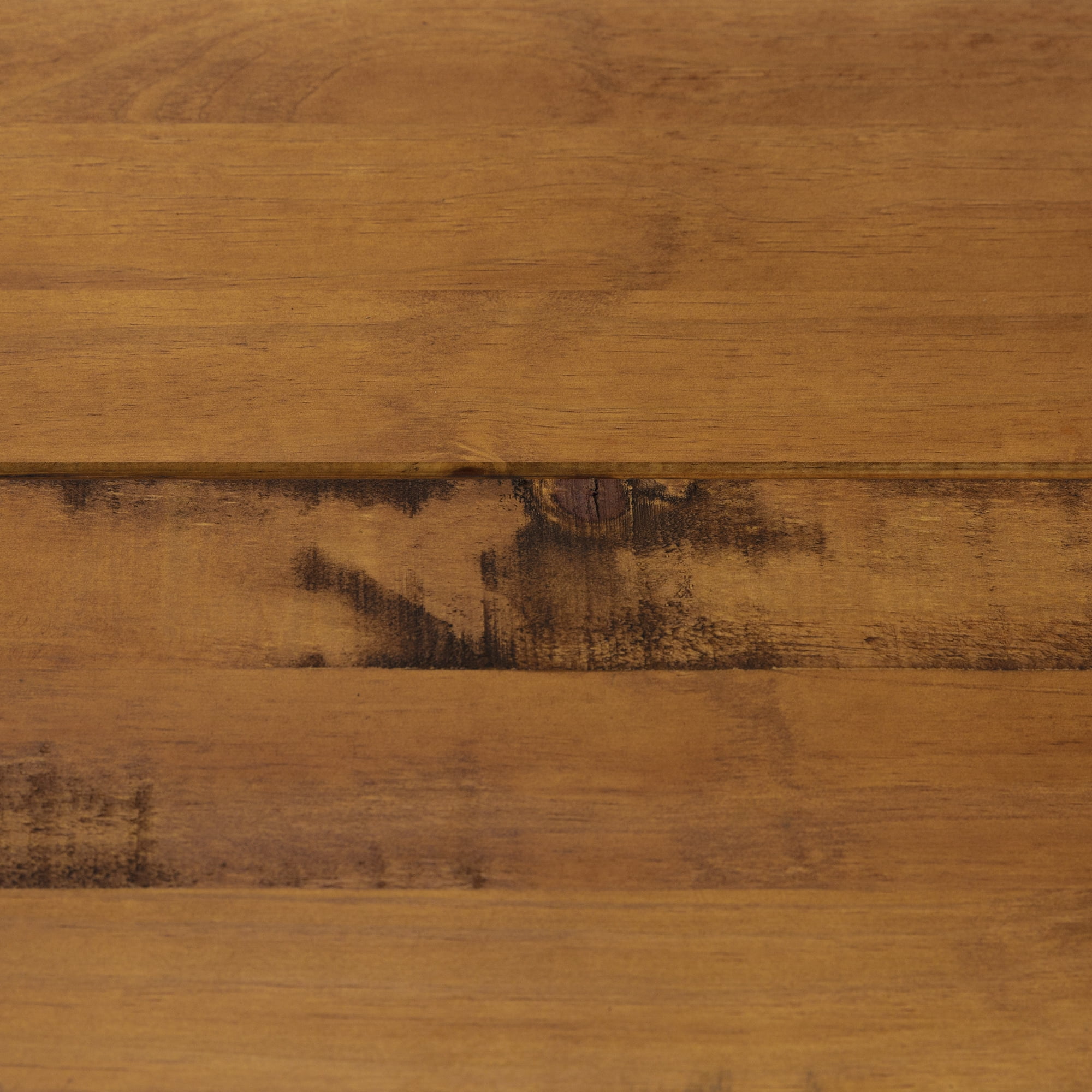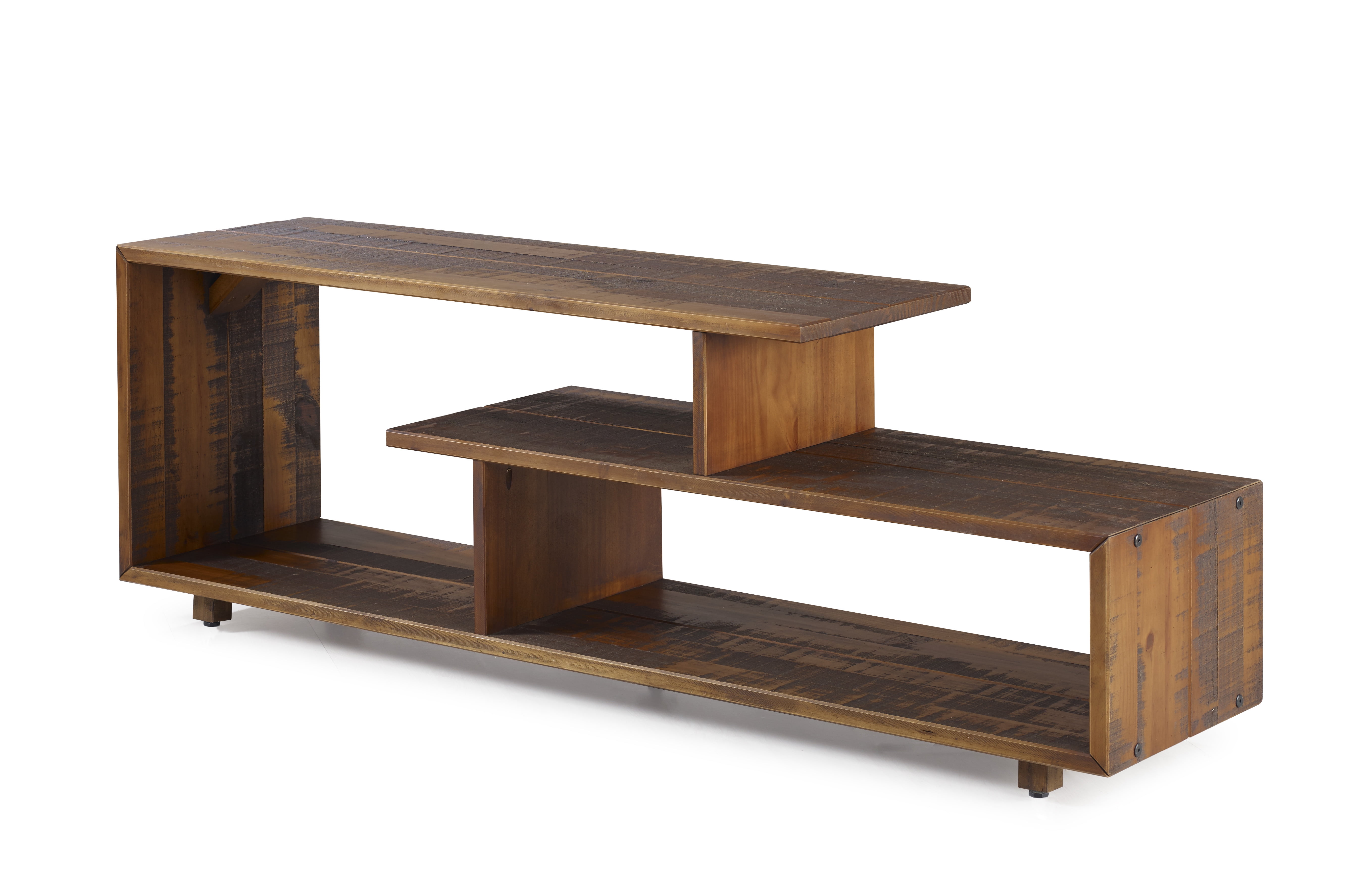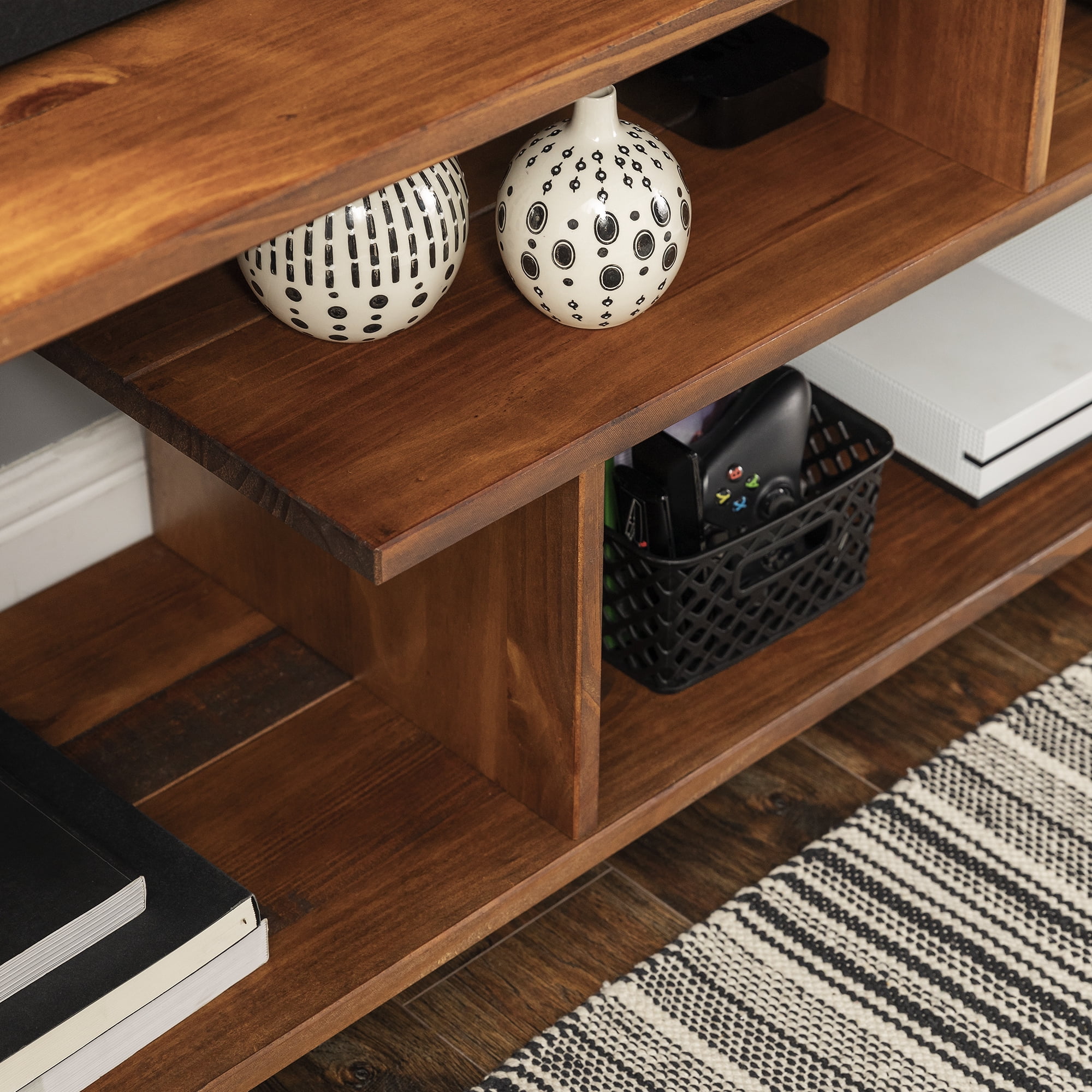 Packaged dimensions: 5″ H x 71″ L x 18″ W Assembled Dimensions: 23″ H x 60″ L x 15″ W Materials: Solid pine wood that is responsibly harvested from renewable forests Assembly: Some assembly required Amber finish Rustic console Milter joint corners Asymmetrical frame Adjustable feet 3 shelf spaces separated in 5 open storage areas