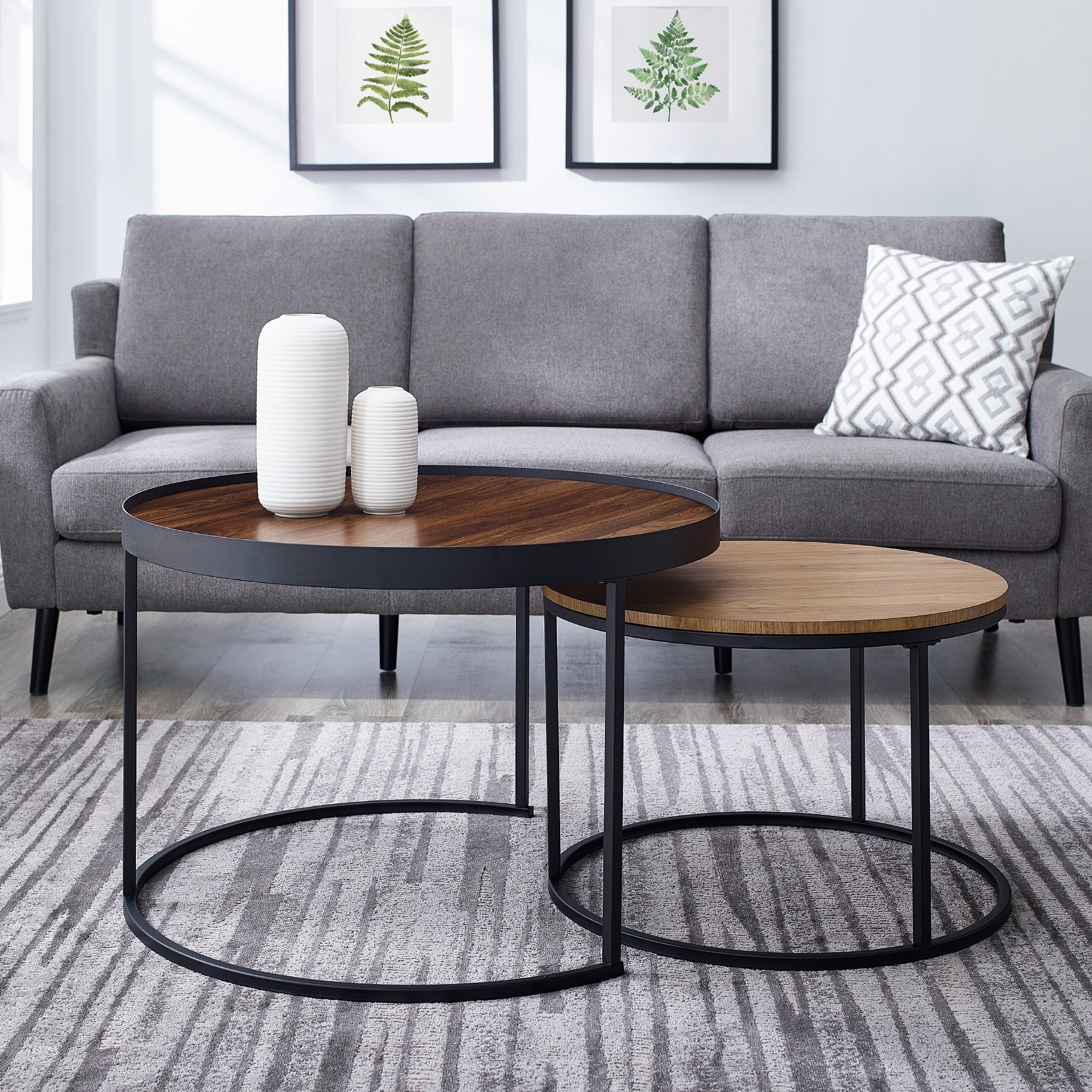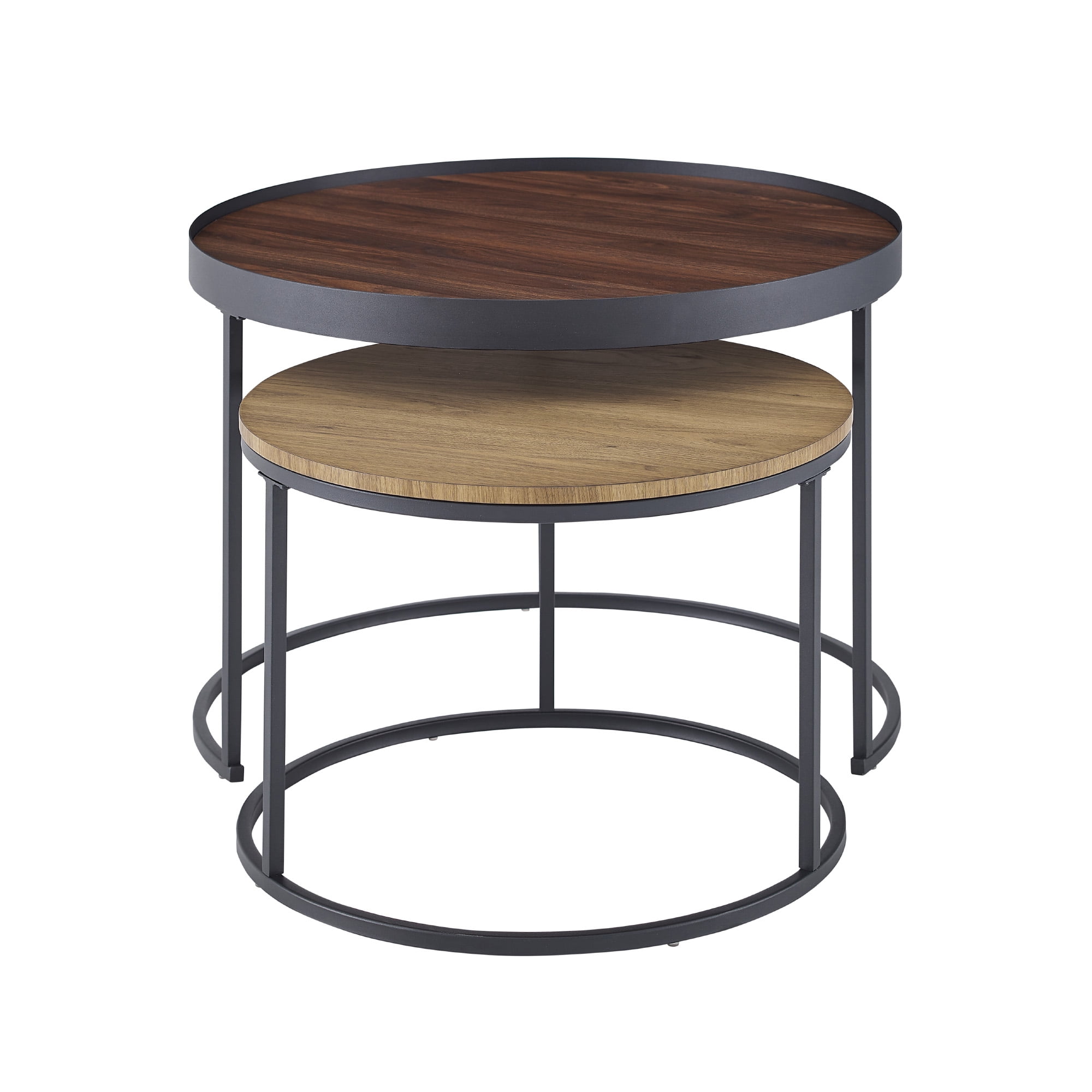 Packaged Dimensions: 4.5” H x 32.5” L x 32.5” W Assembled Large Table Dimensions: 20.25” H x 30.25” L x 30.25” W Assembled Small Table Dimensions: 16” H x 23.5” L x 23.5” W Materials: Warp resistant MDF, durable laminate, powder coated steel Assembly: Some assembly required Industrial style true nesting coffee tables Dark walnut finish on large table English oak finish on small table Concrete finish on small table Small space friendly Metal tray around tabletop Rubber feet