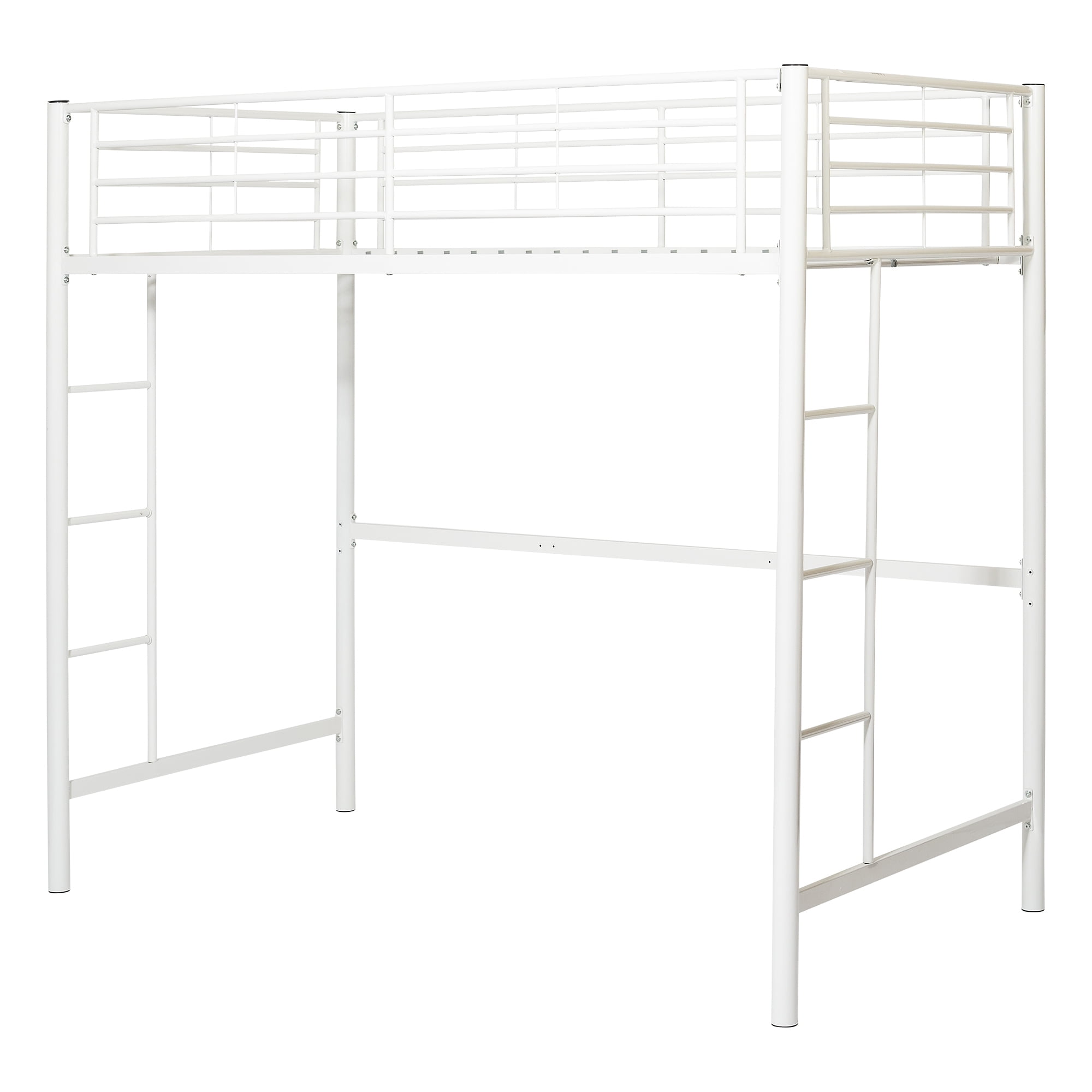 Maximize floor space in a bedroom with help from this Walker Edison Twin Metal Loft Bed. The handy piece features an elevated sleeping platform, leaving an open area beneath that’s just right for a desk, shelf or other essential furnishings. This twin-size loft bed has a sturdy steel frame for stability and function to support a weight of up to 250 lbs. It features full-length guardrails and two integrated ladders, one on each end. Support slats are included, so no box spring is necessary. Choose from three different colors to match your child’s room decor. A powder coating also helps the finish stay fresh for longer. This kid’s metal loft bed comes ready-to-assemble with step-by-step instructions. It conforms to the latest consumer product safety standards.