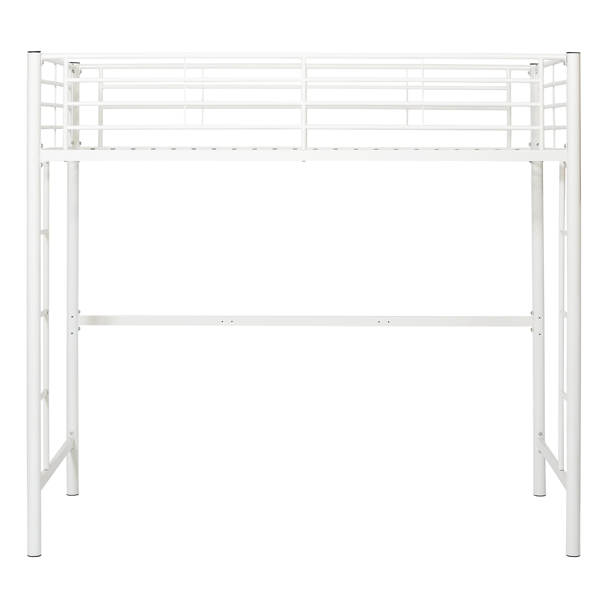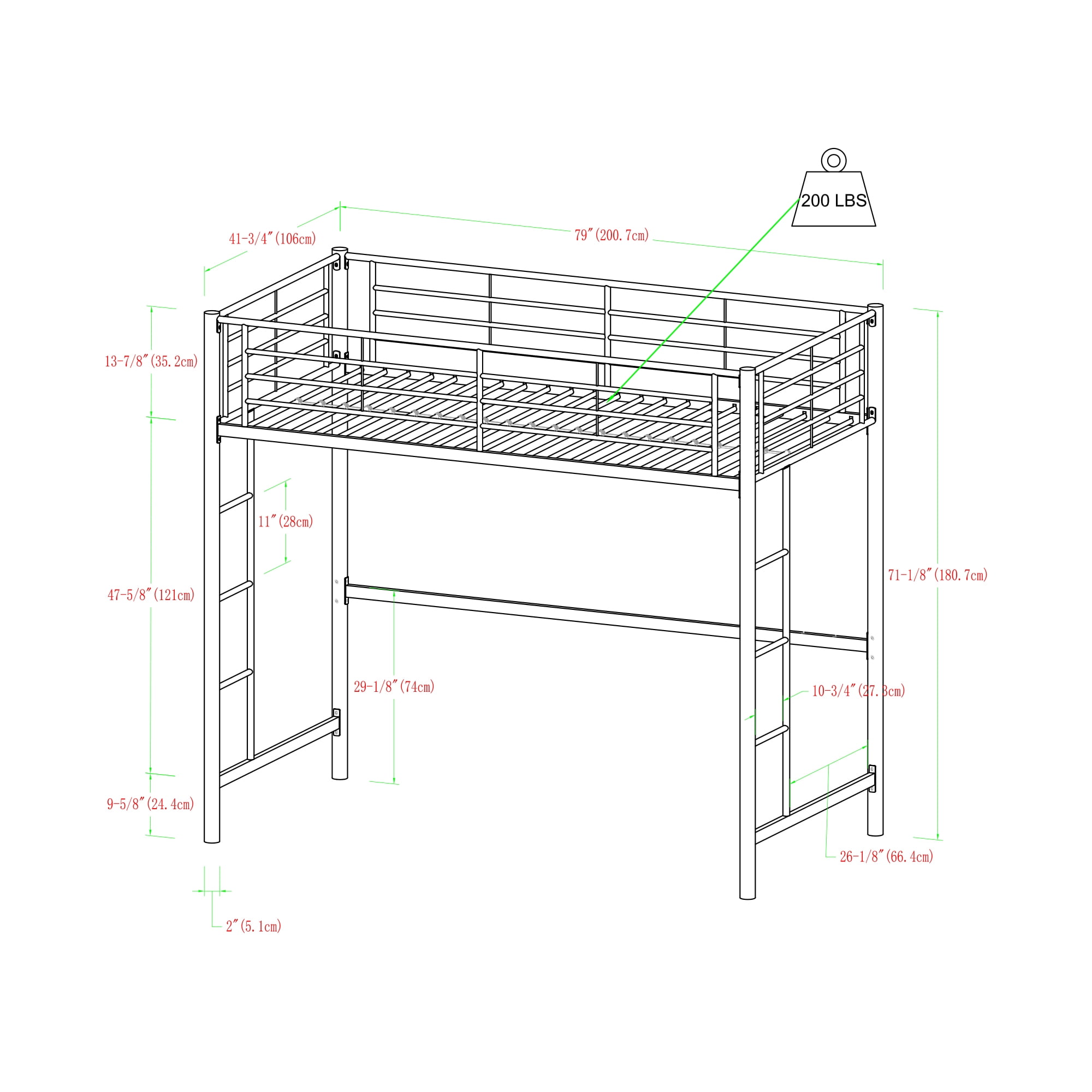 Twin loft bed made of powder-coated metal Supports 250 lbs Twin Loft bed accommodates a standard twin mattress The twin loft bed accommodates a variety of options below the loft Meets the latest consumer product safety standards Suited for rooms with limited floor space Space underneath can double as a play or study area Support slats included, no box spring needed ships ready-to-assemble with step-by-step instructions Product Dimensions: 79″ W x 42″D x 71″ H Shipping dimensions: 78″ L x 17″ W x 6″ H Weight: 80 lbs Mattresses are sold separately