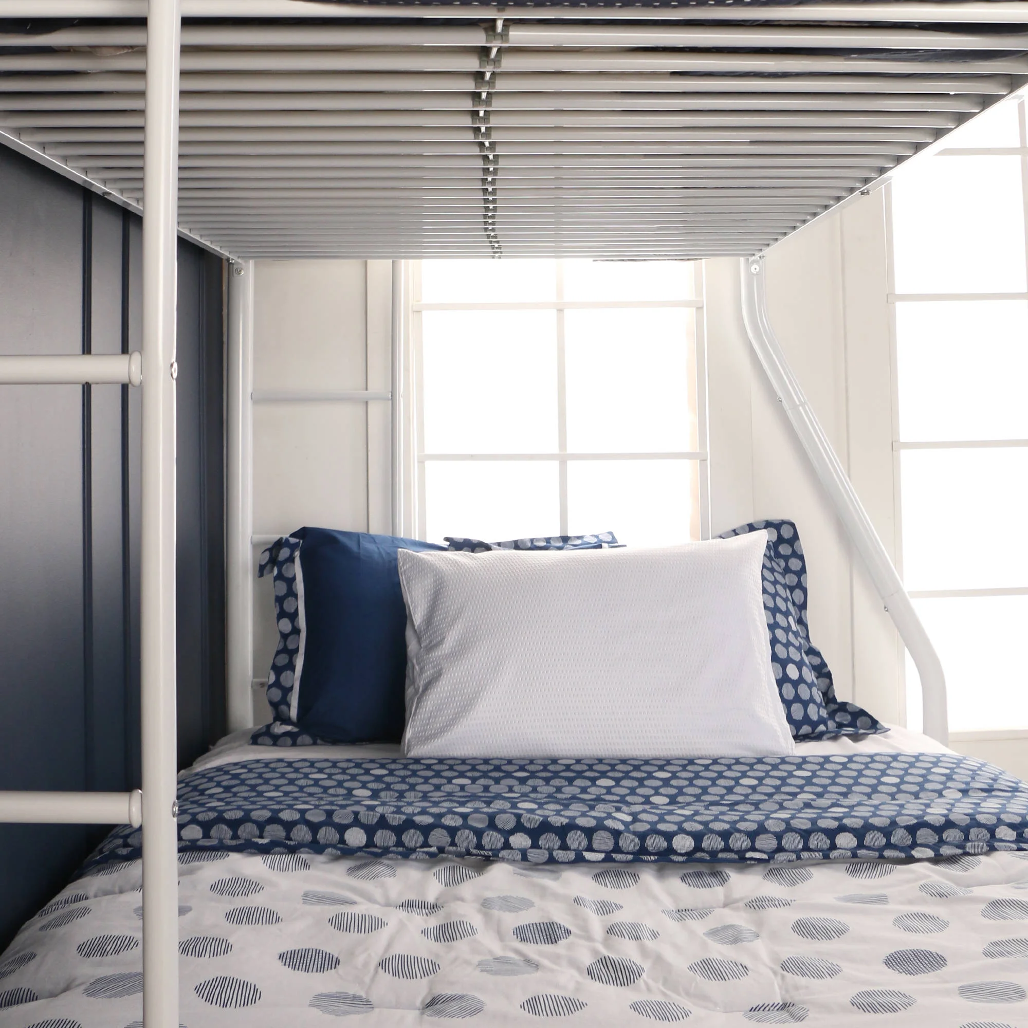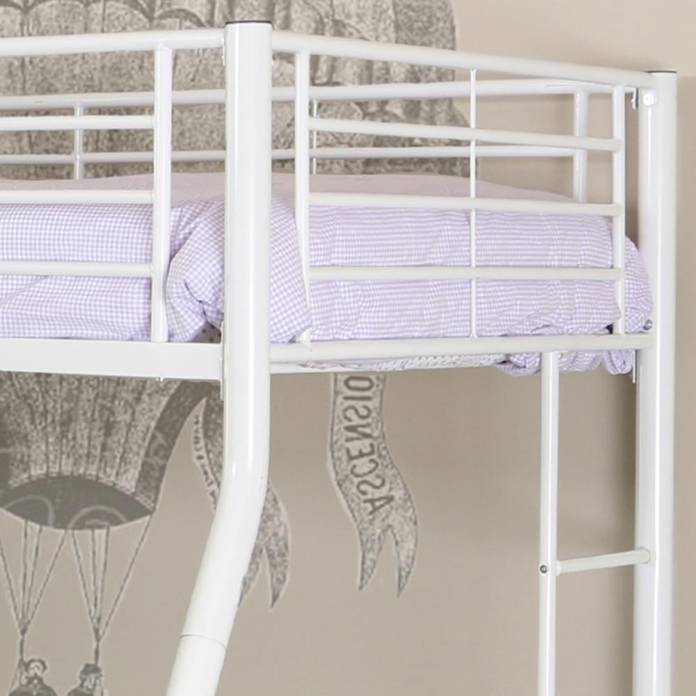 This Premium Twin-Over-Full Bunk Bed will brighten your child’s room. It is constructed of steel with a powder-coated finish for long-lasting durability. This children’s bunk bed fits twin- and full-size mattresses. It also does not require a box spring thanks to the included support slats. This white metal bunk bed also features full-length guardrails and two integrated ladders for exceptional safety. It is the ultimate solution for adding extra sleeping space to small rooms. This bunk bed conforms to consumer product safety standards. Its maximum recommendation for upper mattress thickness is 9″. It also comes ready to assemble and includes instructions. Each bunk supports 250 lbs.