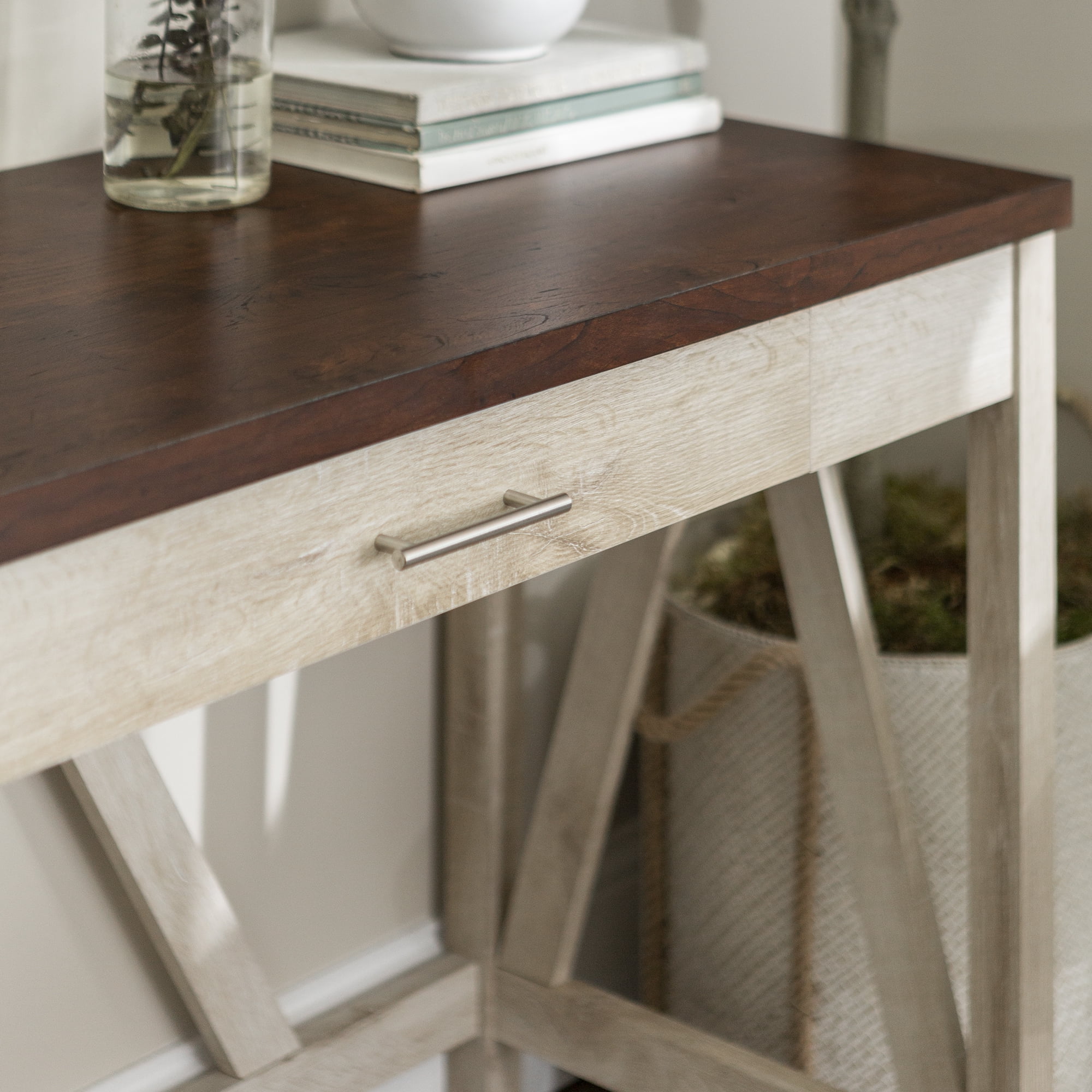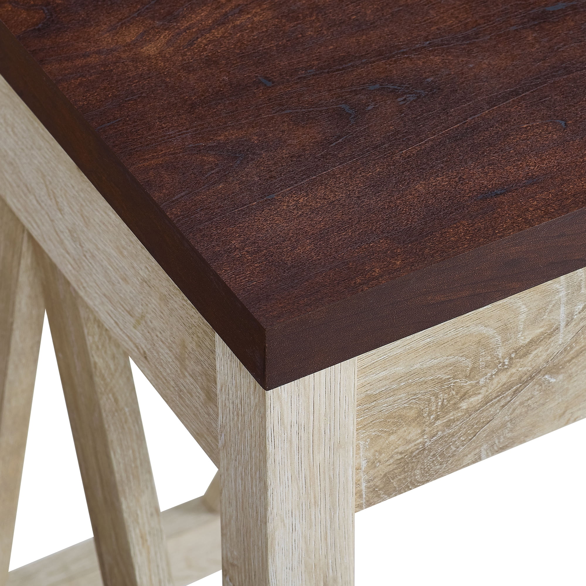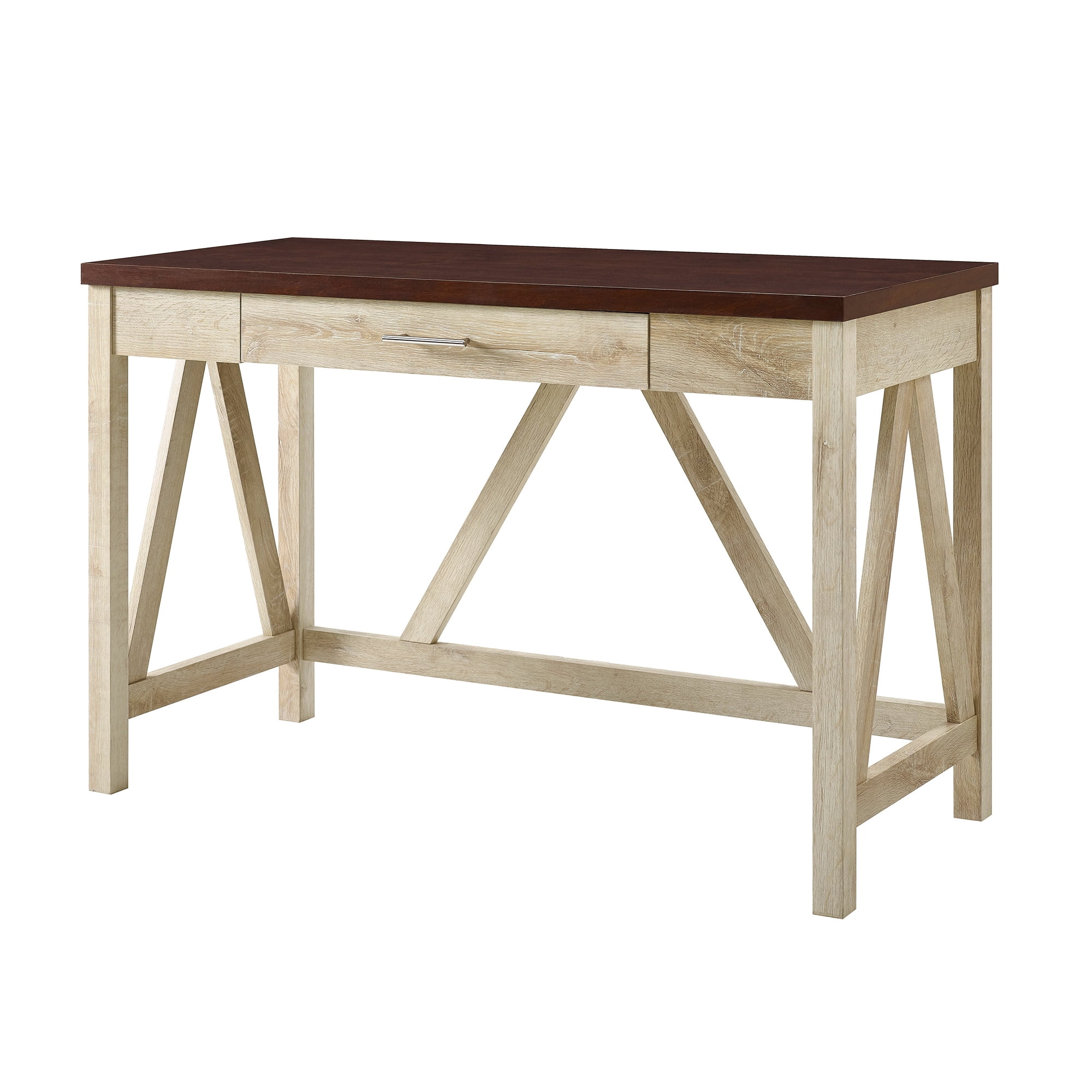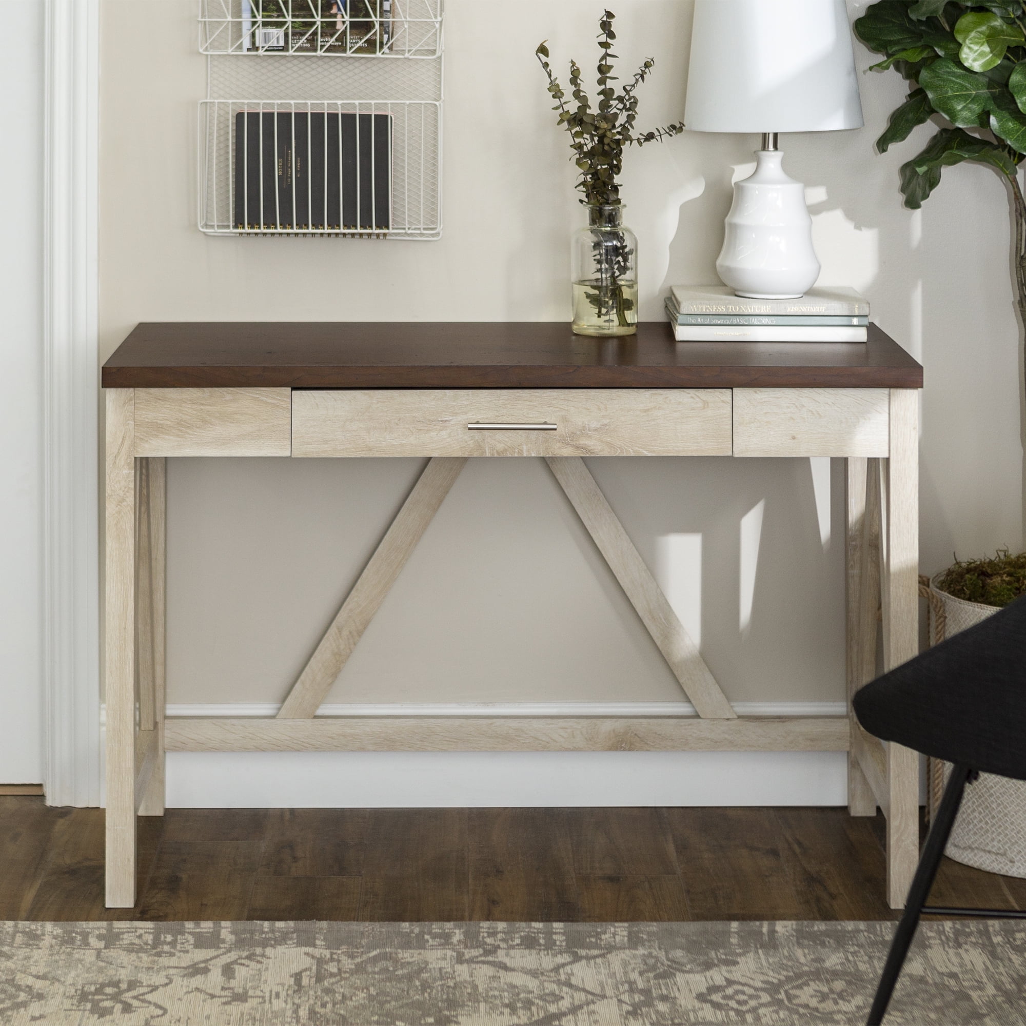 Recharge your home office space with this attractive farmhouse desk by Walker Edison. The A-frame details and two-tone design complement any style of decor. Pull your favorite swivel chair up to this computer desk for a complete set. Express your great taste by placing your favorite art or family photos on the tabletop. Place important documents, electronic accessories, or office supplies in the center drawer for easy access. Made from high-grade MDF and durable laminate, this desk will stand through all of your late night study sessions or busy business seasons for years to come. Find the motivation to write your big essay or stop procrastinating all those edits with this modern desk.