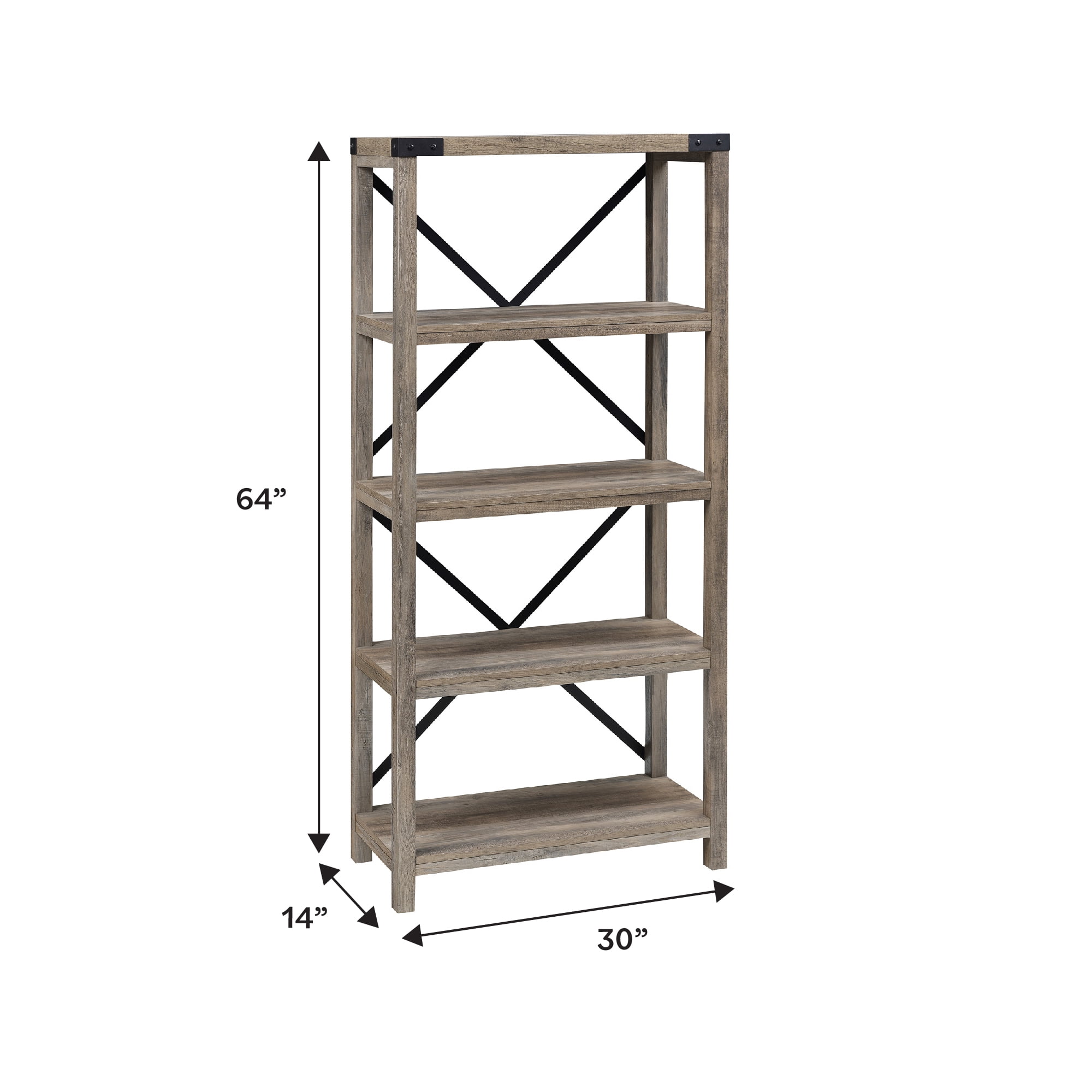 Packaged dimensions: 8″ H x 68″ L x 18″ W Assembled Dimensions: 64” H x 30” L x 14” W Materials: High quality laminate, high grade MDF, and powder coated metal Assembly: Some assembly required Four fixed open storage shelf areas Natural boho style bookcase Grey Wash finish Metal X detailing on the back Metal brackets on top corners