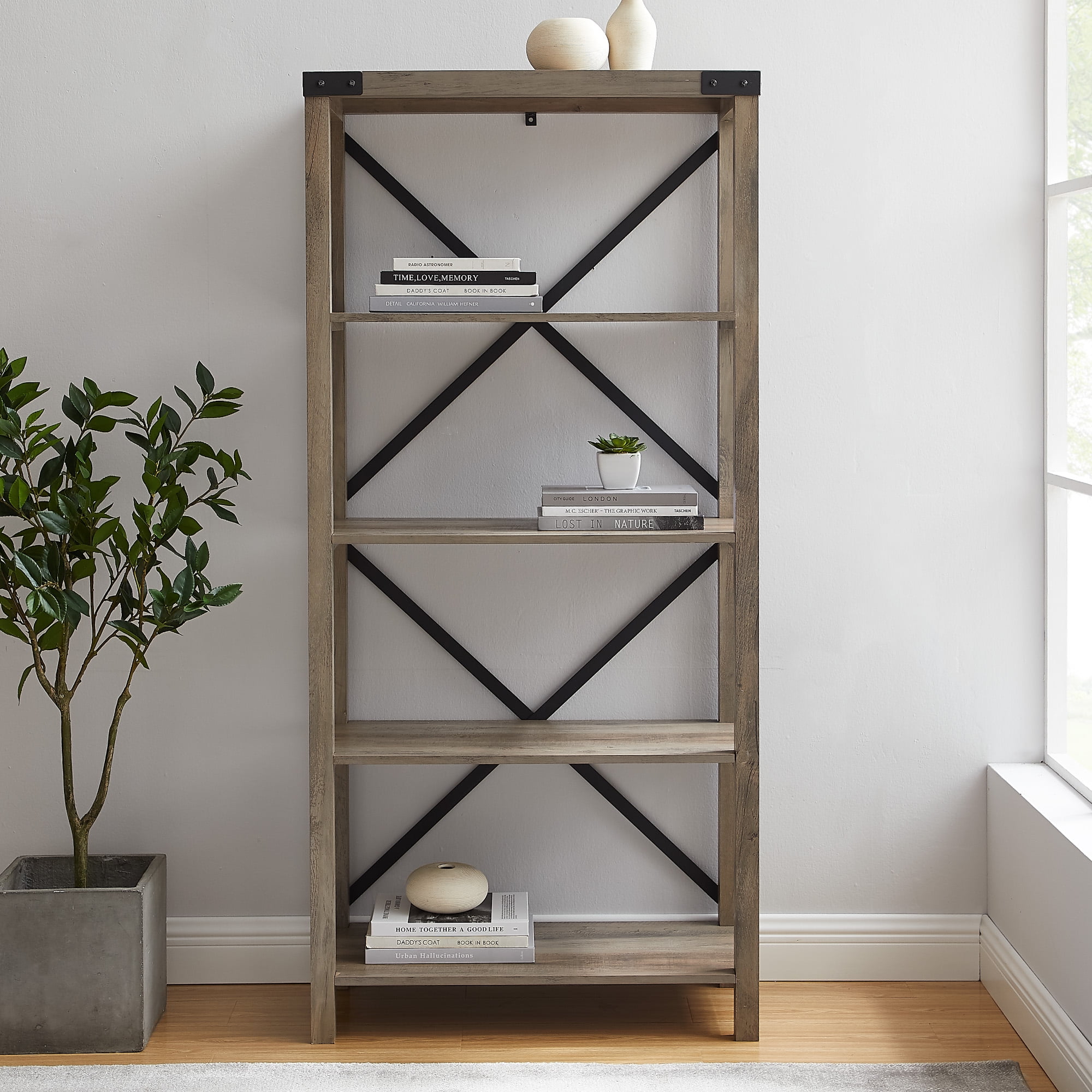 Want to show off your best books, house plants, or other decorations? The Magnolia 4-Shelf Grey Wash Bookshelf by Walker Edison is the perfect place to display all your photos, art, and more. The bookcase features several embellishments, including a metal X detail on the back of the case and metal brackets on each top corner. The natural boho concept will bring a light and organized feel to whatever approach your home embodies. This bookcase will look great propped against an accent wall or holding your most recent travel souvenirs. Let this storage space be the eye-catching piece you have always dreamed of.