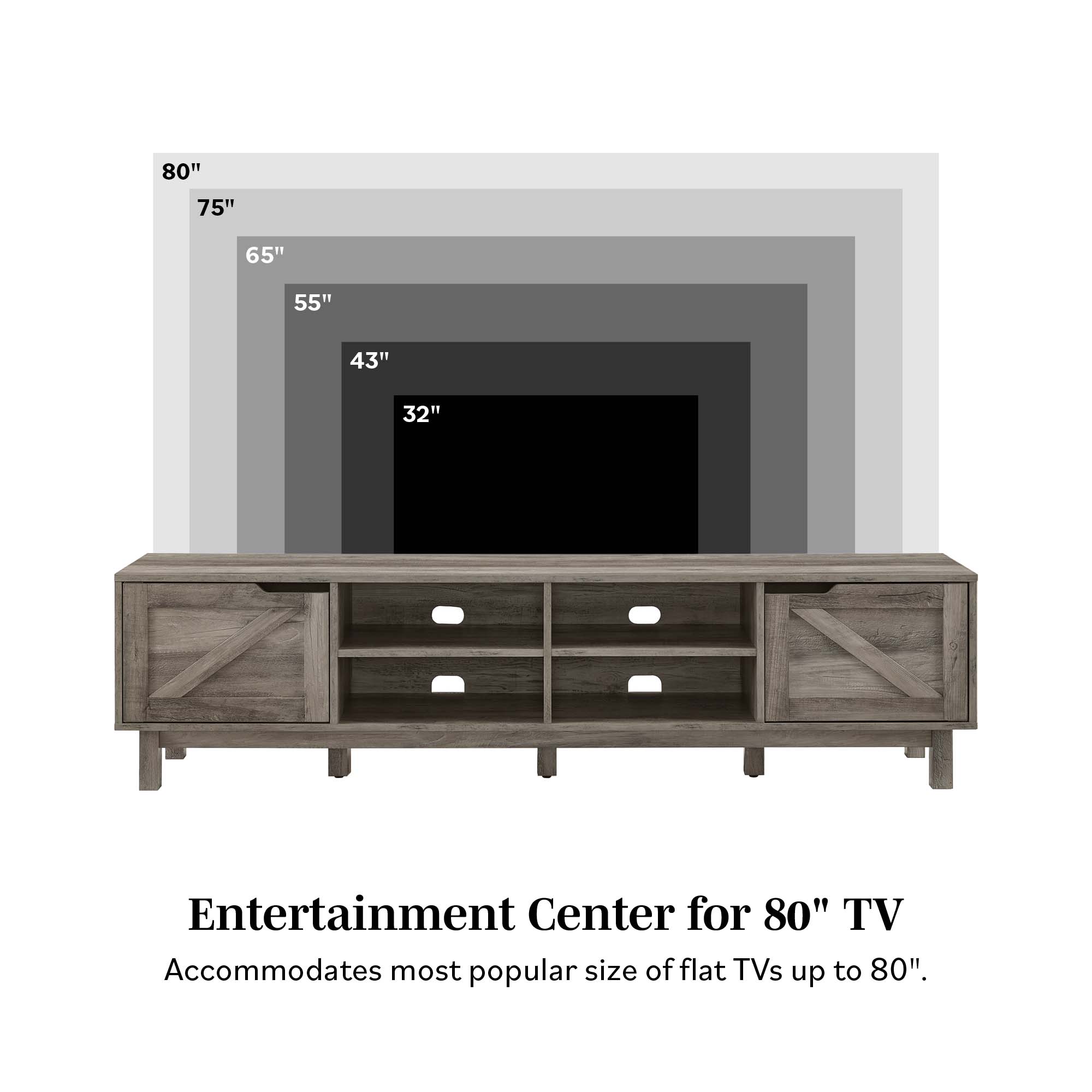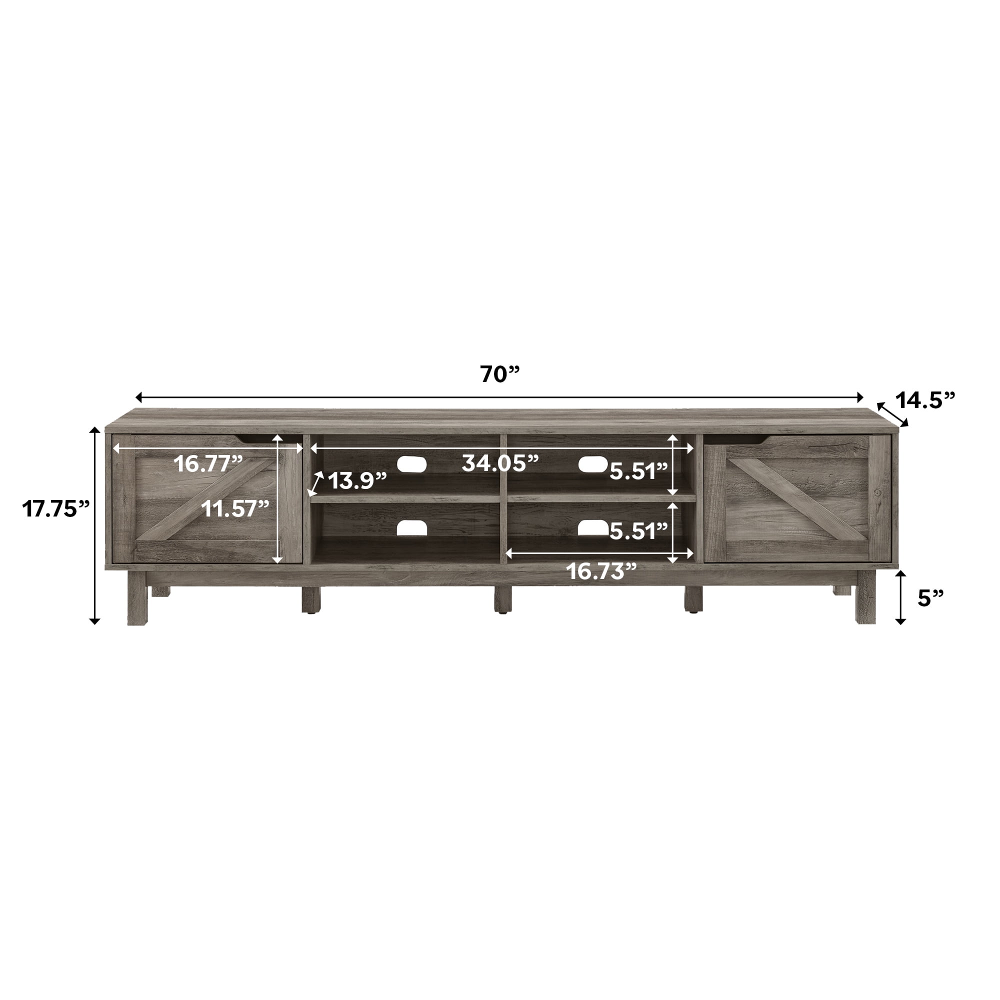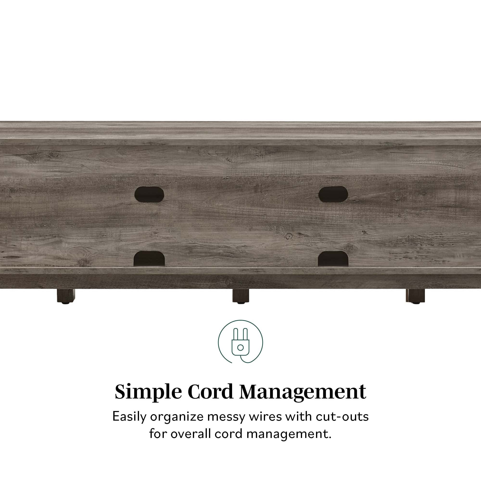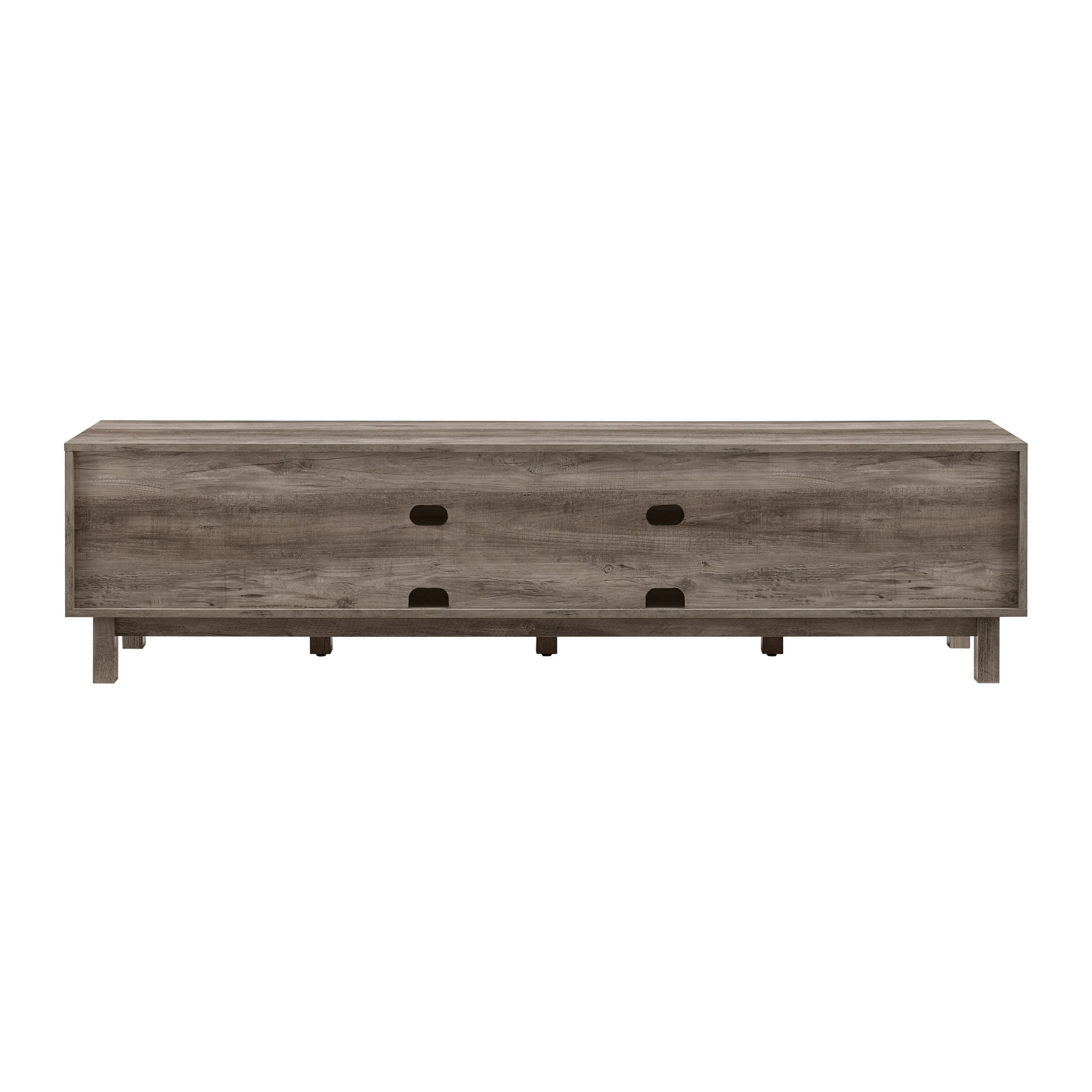 Rustic style Grey wash finish 4 cubbies for open display space 2 doors for closed storage compartments Cord management ports keep tech organized Made from warp-resistant MDF and durable laminate Ships ready-to-assemble with step-by-step instructions Assembled dimensions: 17” H x 70” L x 14.5” W Packaged dimensions: 6” H x 77” L x 19” W