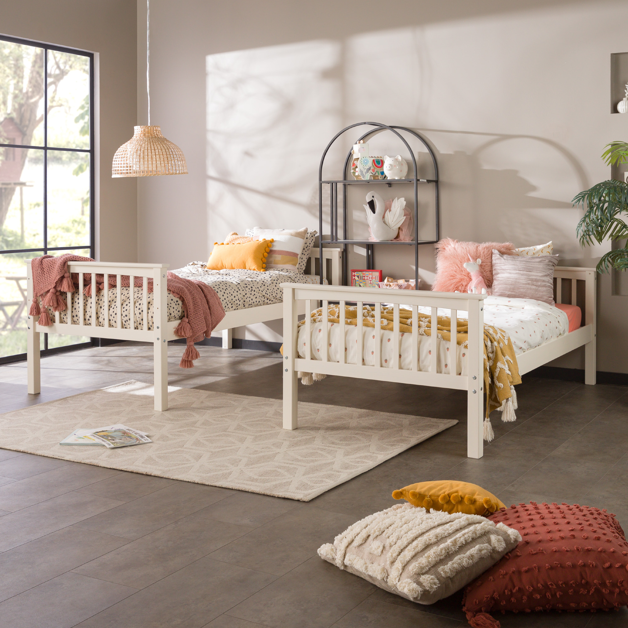With mission style slats as accents for a classic appeal Showcasing a transitional, cottage design style Made of solid pine wood in a painted finish for a reliable construction Bunks can be separated into two twin beds Perfect for small space living Ships ready-to-assemble with step-by-step instructions Dimensions: 62″ H x 44″ W x 80″ L