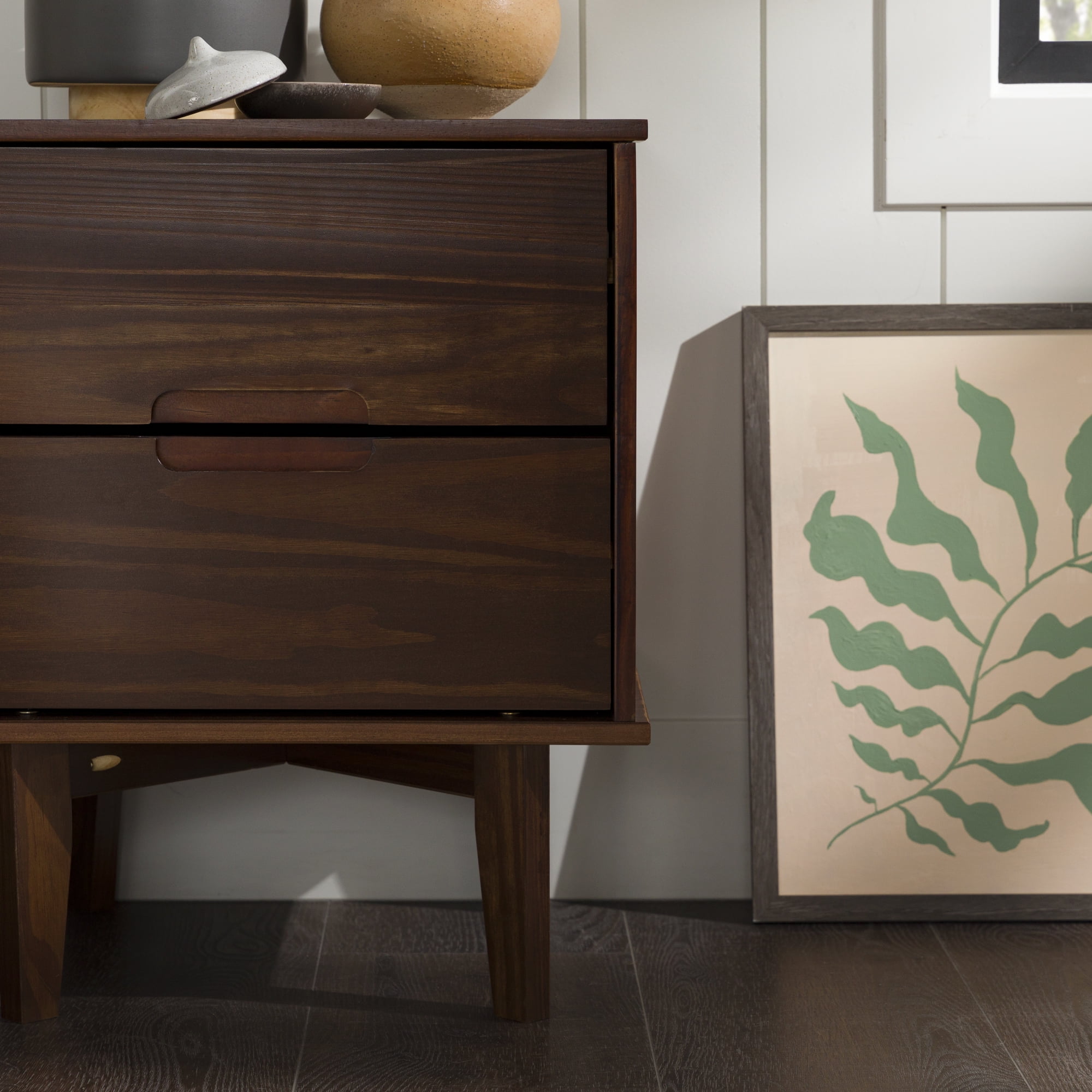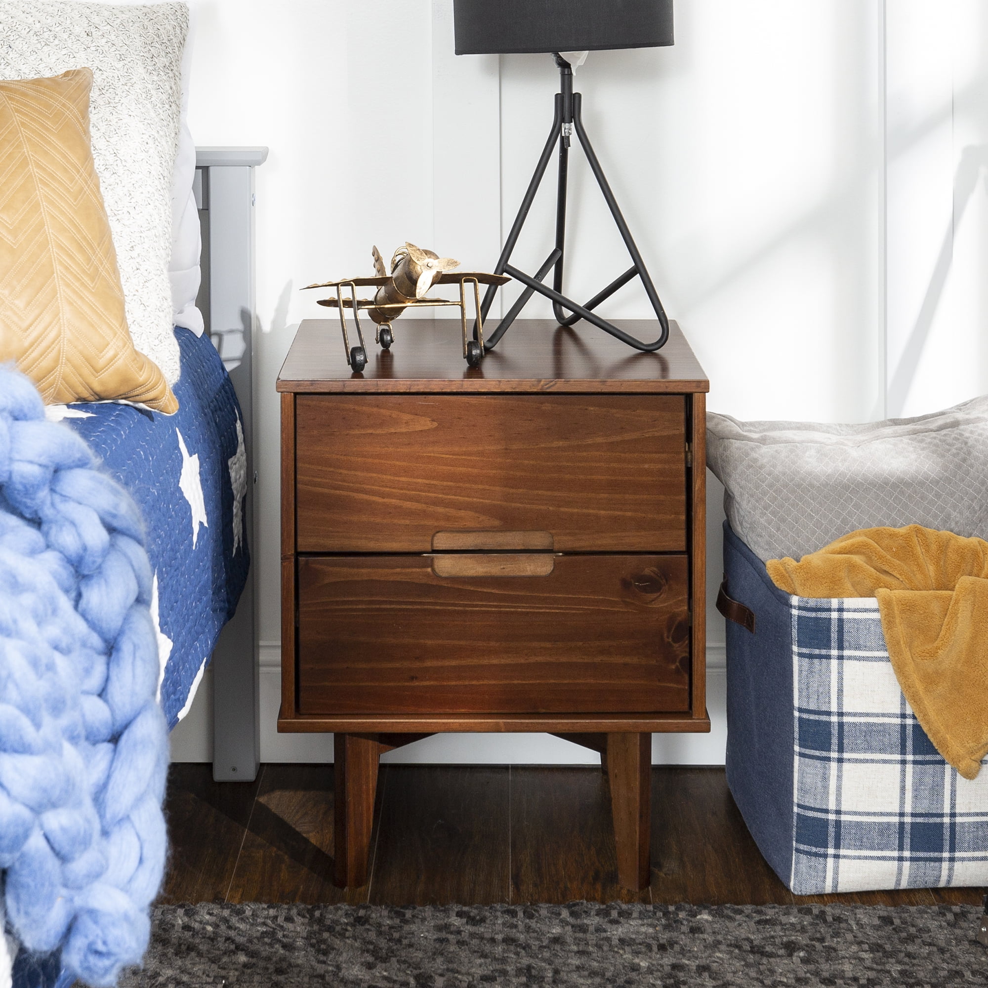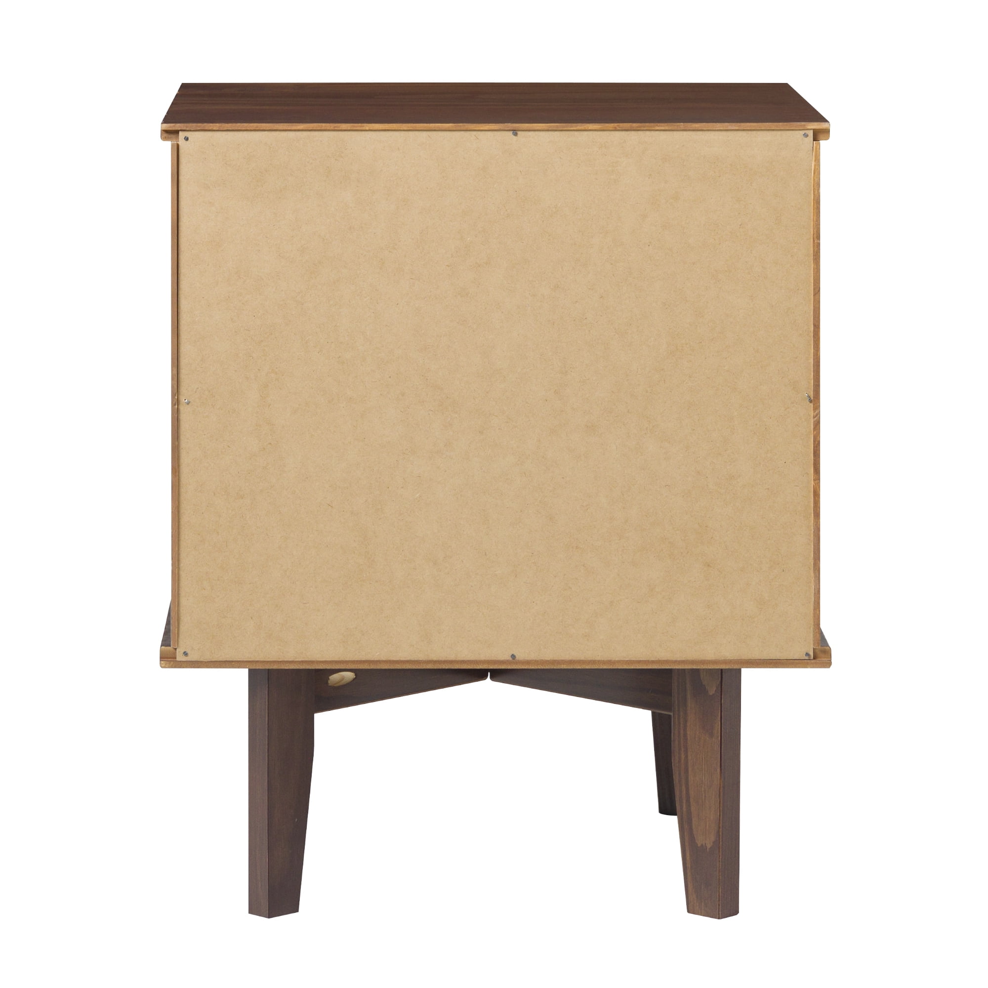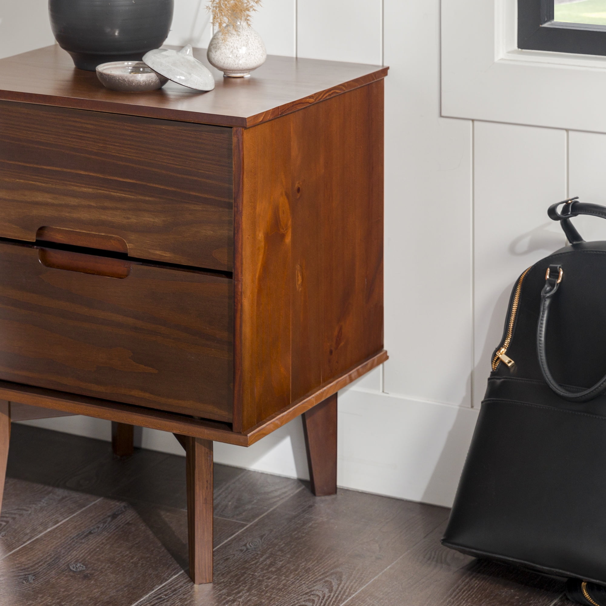Mid-century modern style Walnut finish Grooved handles Use as a side, accent, or bedside table Retro-inspired tapered legs Featuring 2 spacious drawers Versatile design that fits right at home with mid-century modern, contemporary, or bohemian aesthetics Made from responsibly harvested solid pine wood Ships ready-to-assemble with step-by-step instructions Assembled dimensions: 24” H x 20” W x 16” L Packaged dimensions: 6″ H x 23″ L x 18″ W