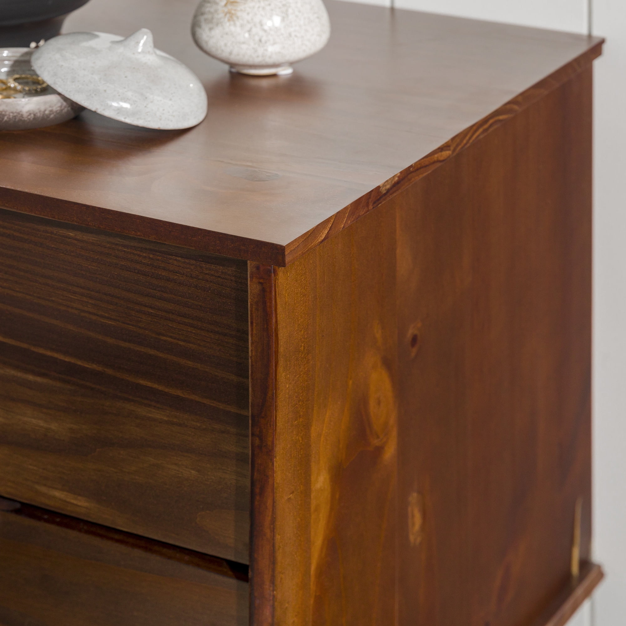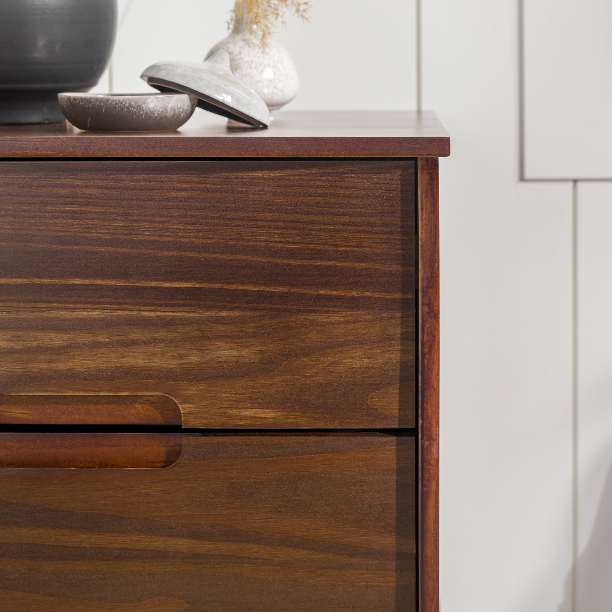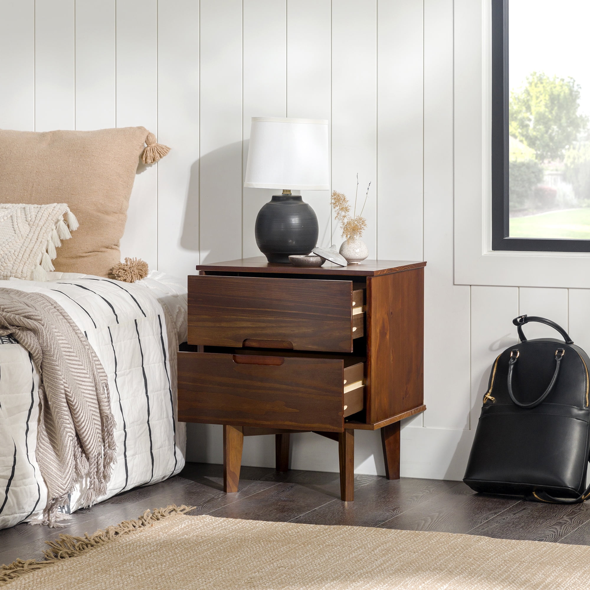 Mid-century modern style Walnut finish Grooved handles Use as a side, accent, or bedside table Retro-inspired tapered legs Featuring 2 spacious drawers Versatile design that fits right at home with mid-century modern, contemporary, or bohemian aesthetics Made from responsibly harvested solid pine wood Ships ready-to-assemble with step-by-step instructions Assembled dimensions: 24” H x 20” W x 16” L Packaged dimensions: 6″ H x 23″ L x 18″ W