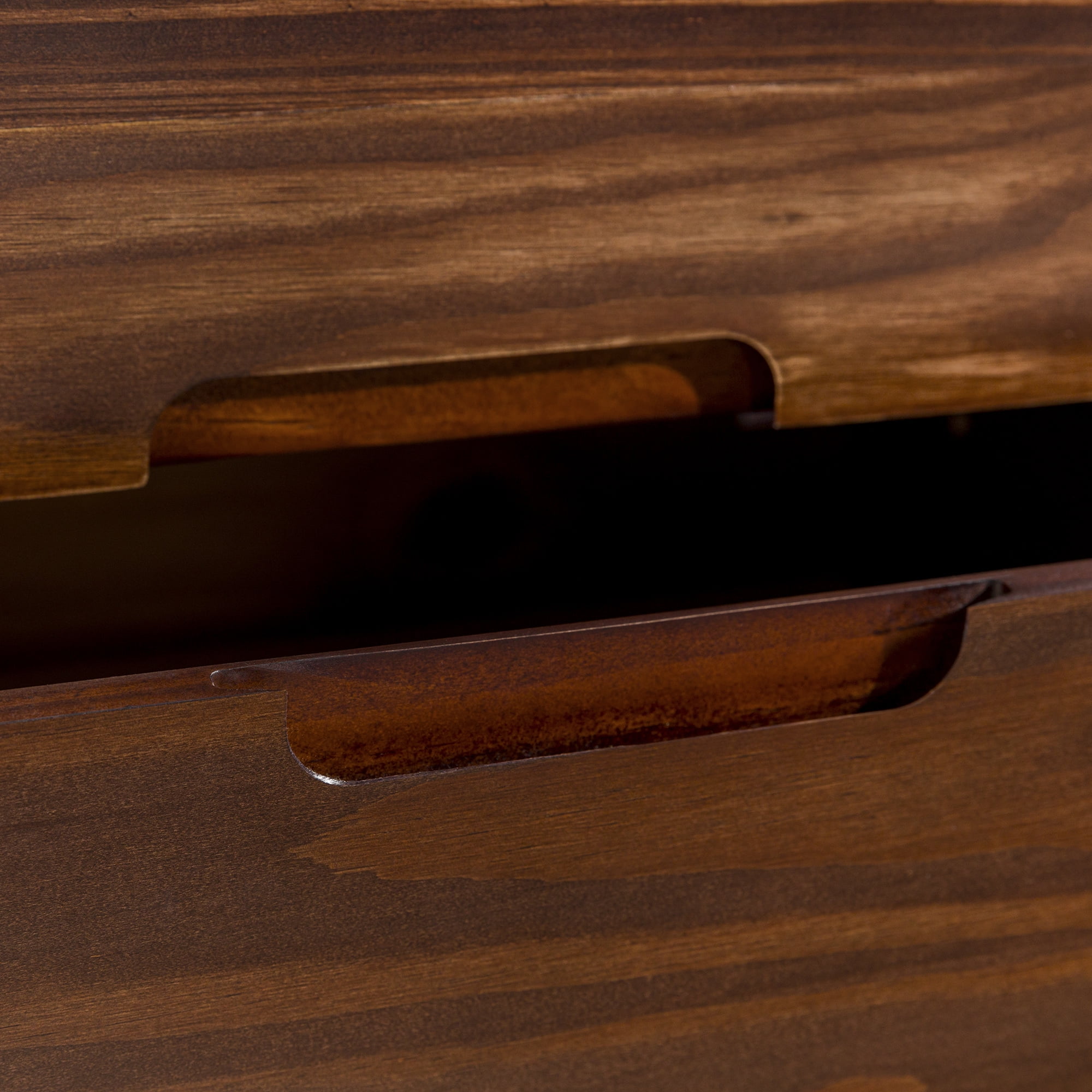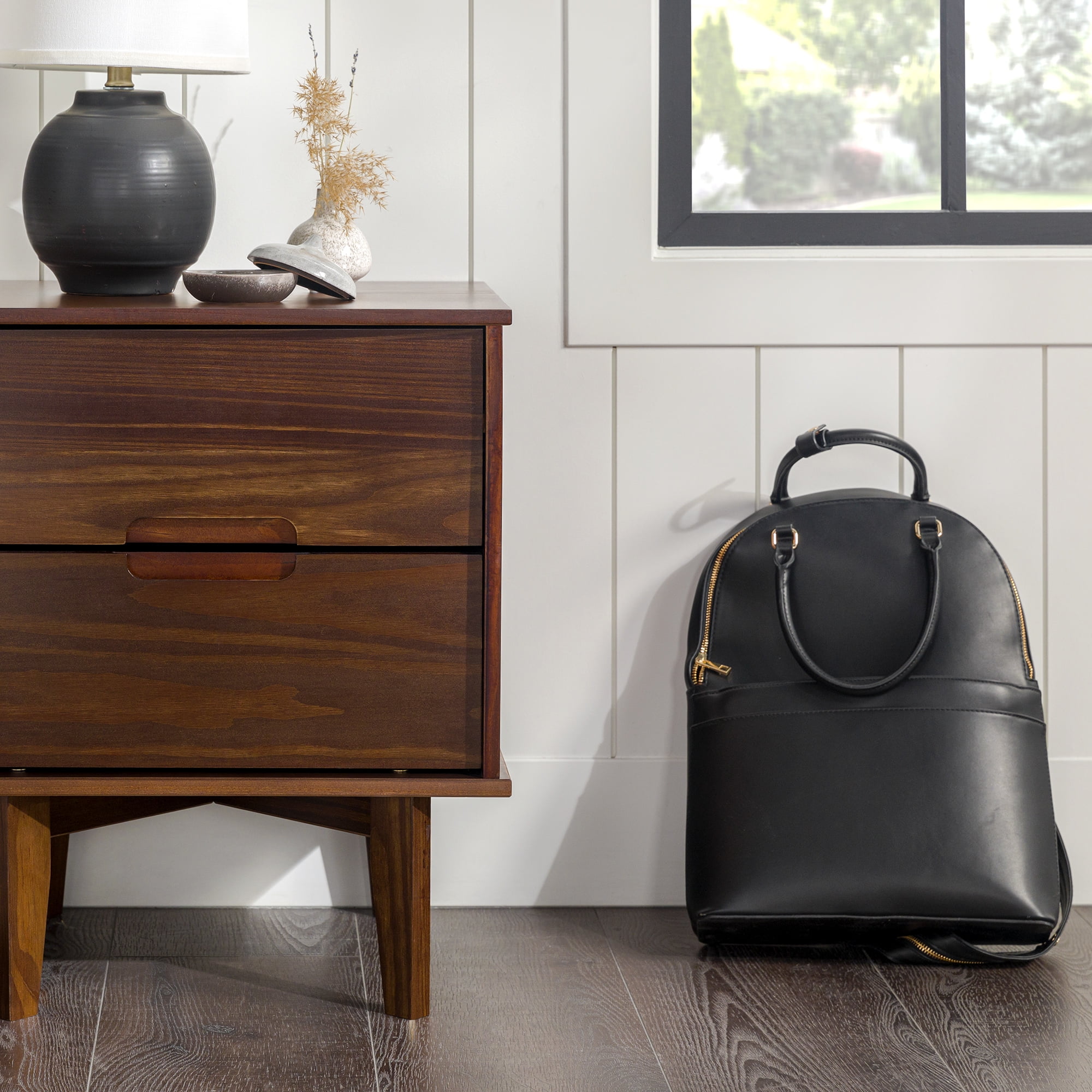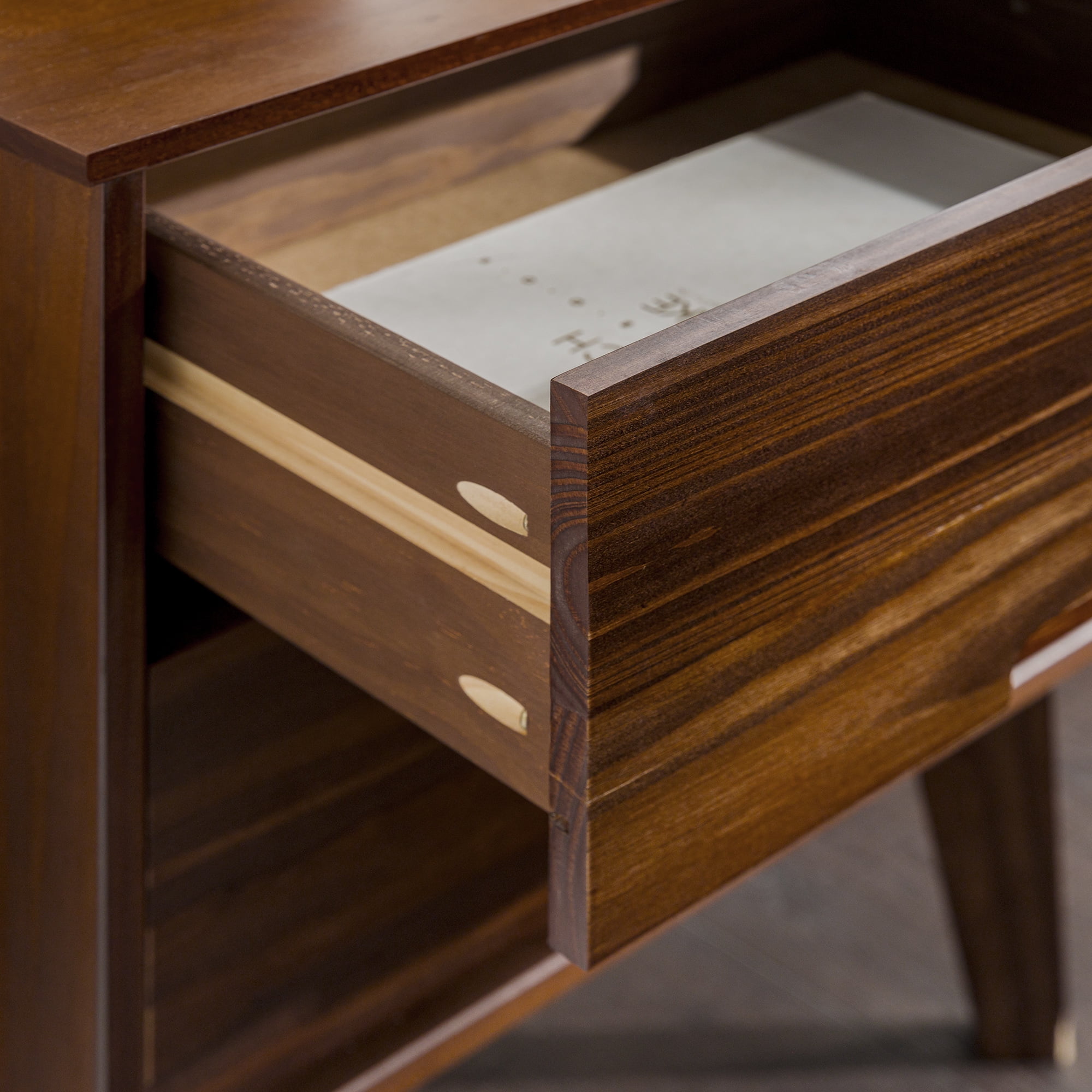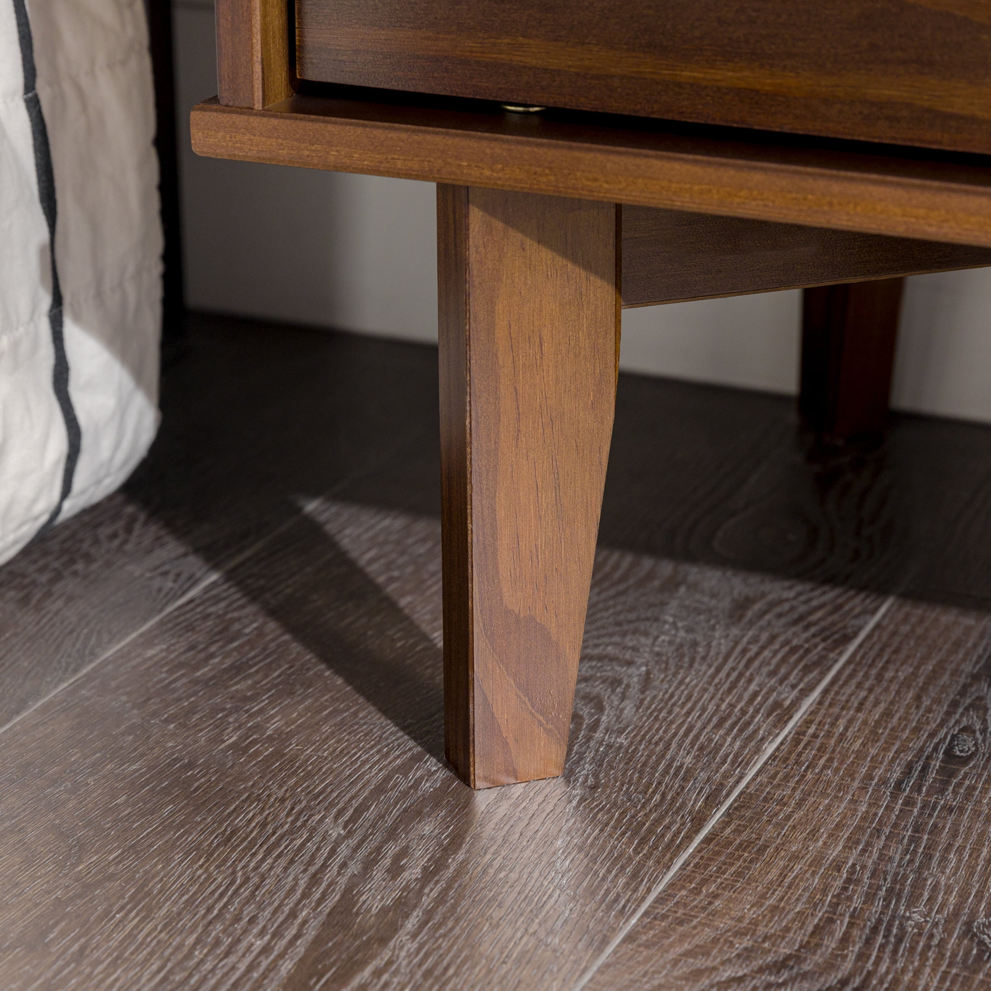 Mid-century modern style Walnut finish Grooved handles Use as a side, accent, or bedside table Retro-inspired tapered legs Featuring 2 spacious drawers Versatile design that fits right at home with mid-century modern, contemporary, or bohemian aesthetics Made from responsibly harvested solid pine wood Ships ready-to-assemble with step-by-step instructions Assembled dimensions: 24” H x 20” W x 16” L Packaged dimensions: 6″ H x 23″ L x 18″ W