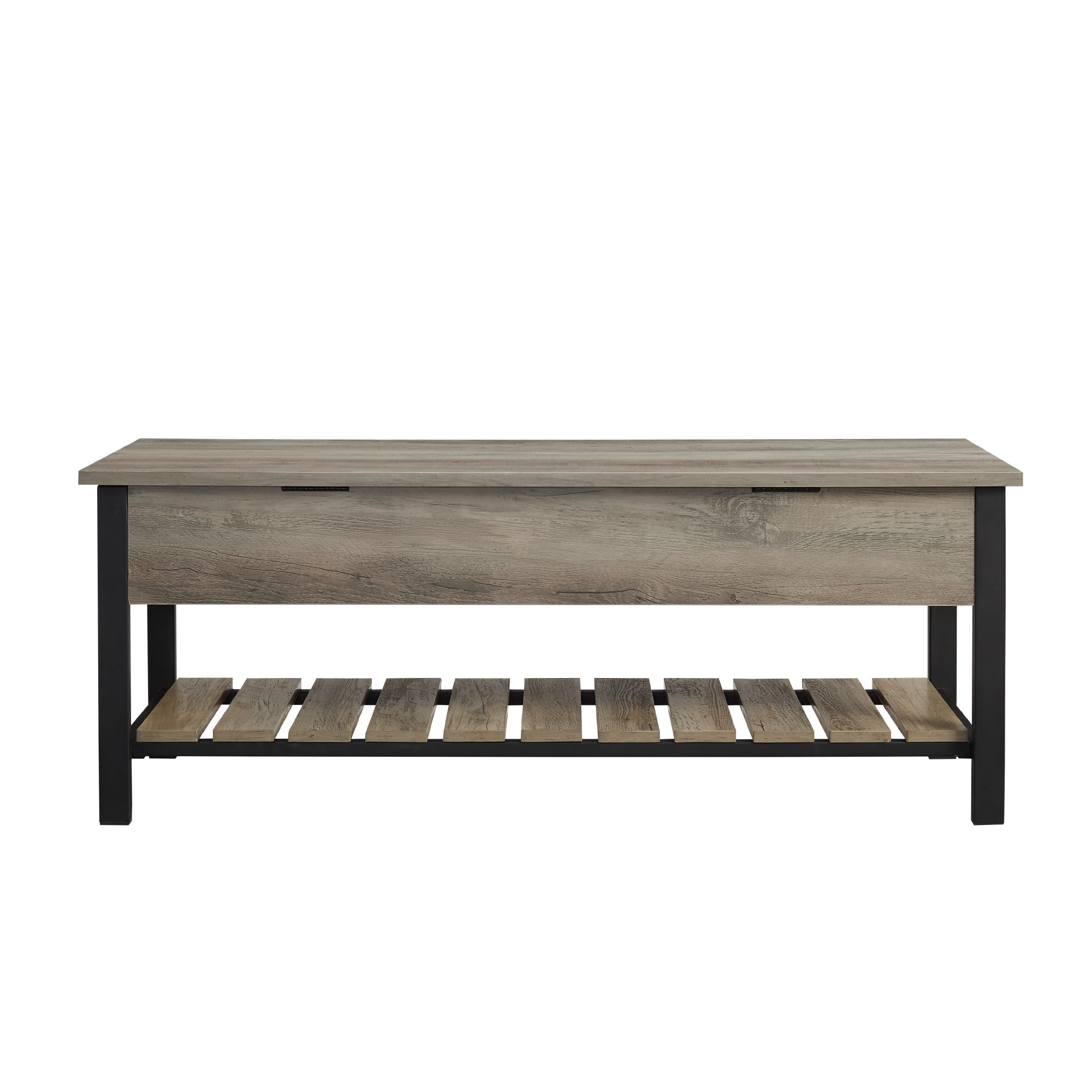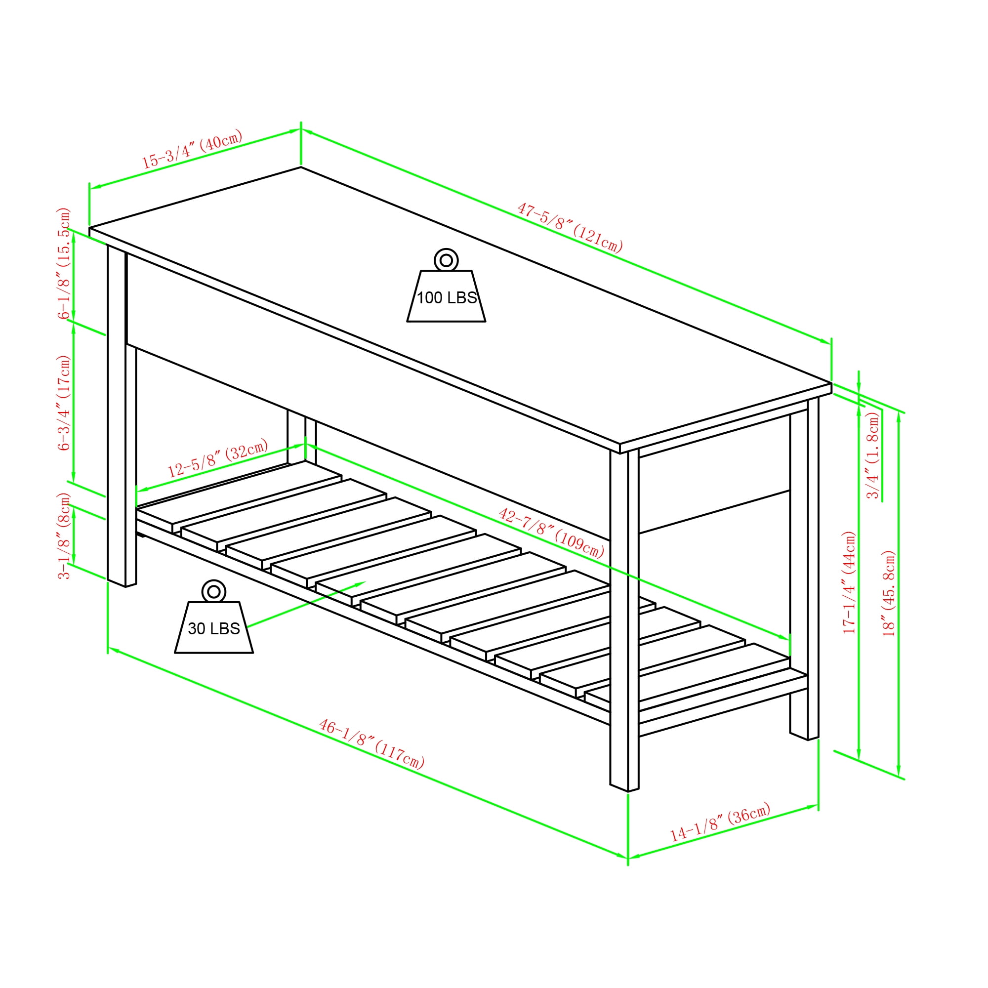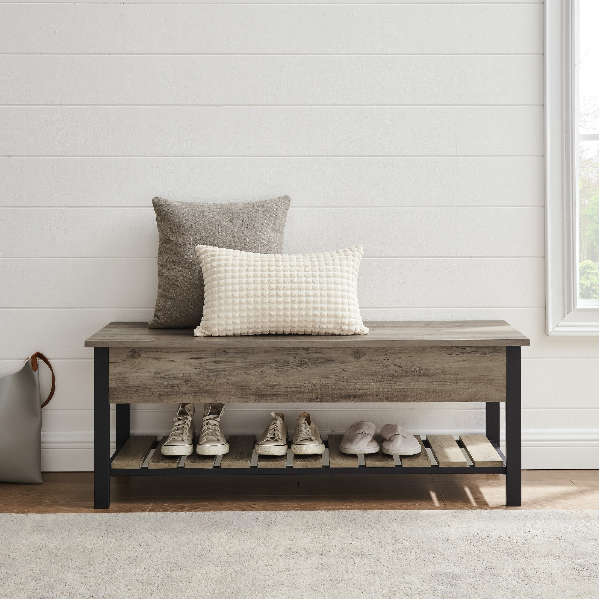 Slatted bottom shelf for shoes Top opens for more storage Mixed material park bench Made from warp-resistant MDF Use in entryway, mudroom, or bedrooms Ships ready-to-assemble with step-by-step instructions