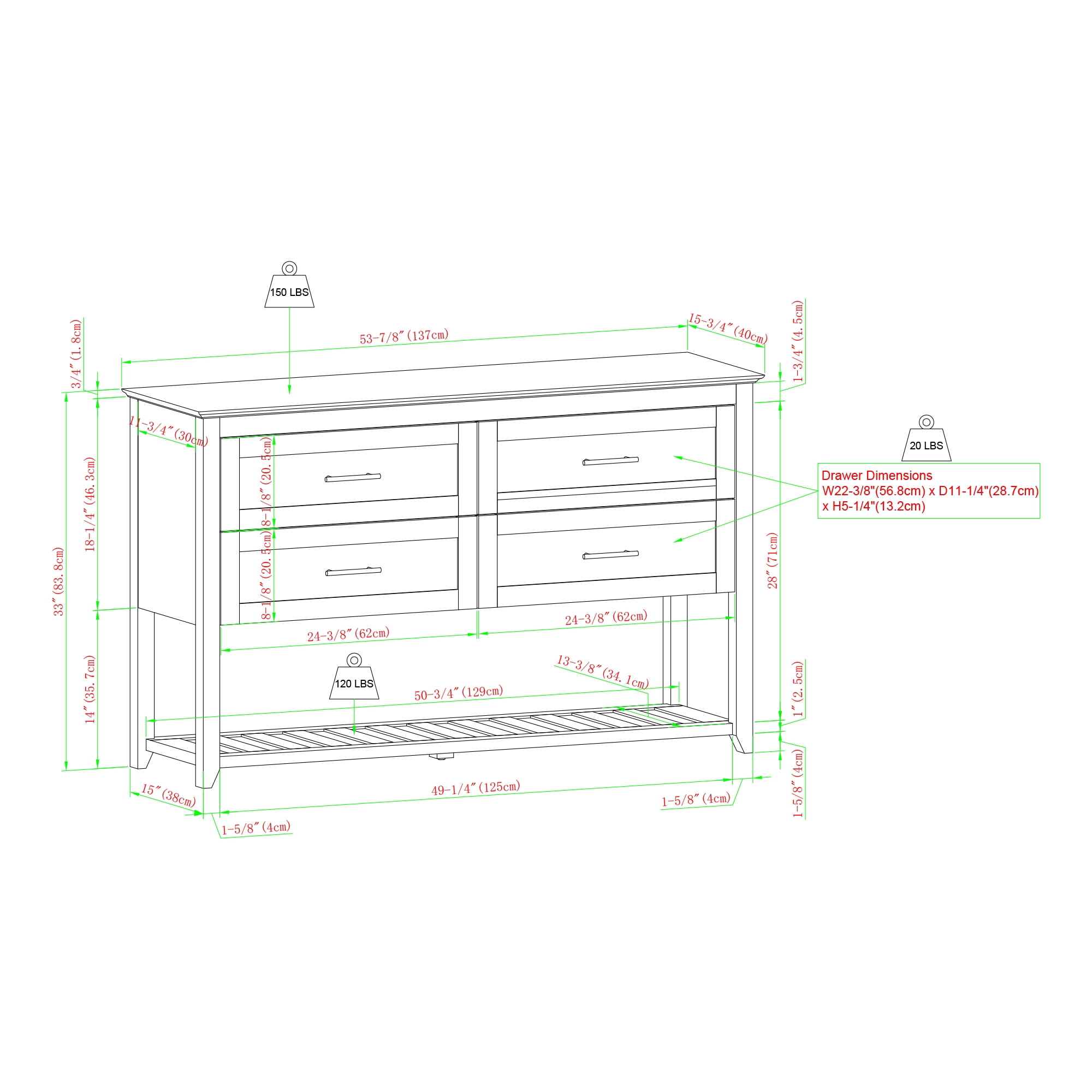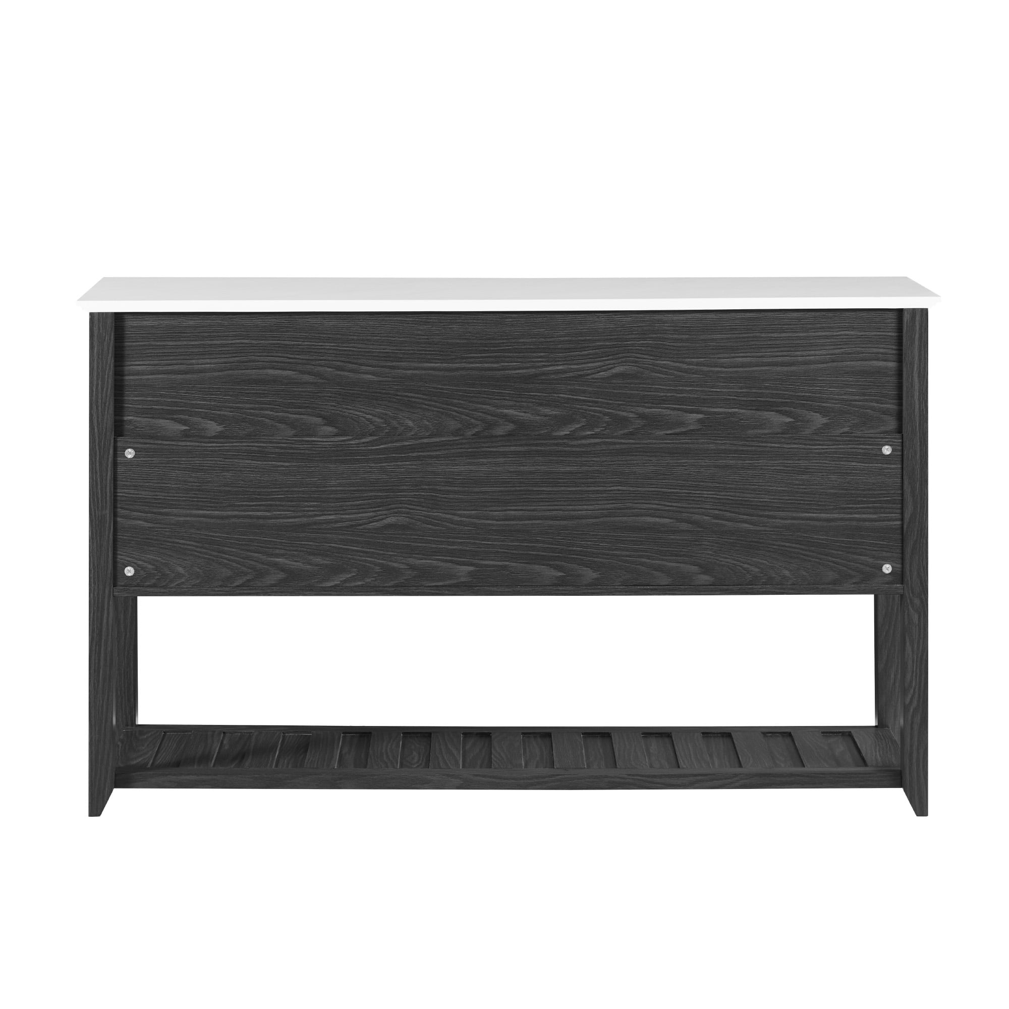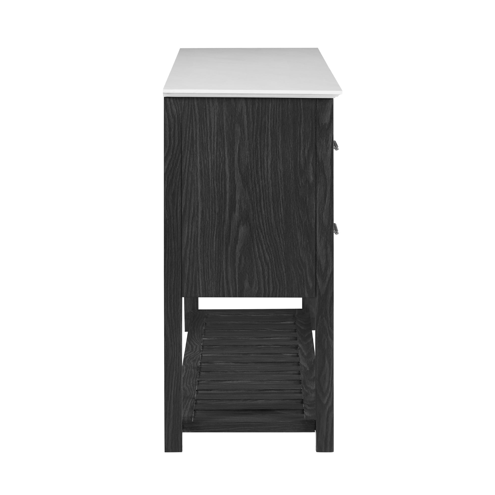 Transitional style Graphite and white marble finishes 4 spacious drawers for plenty of storage Smooth, telescoping metal slides Contemporary and sophisticated hardware Lower open shelving for displaying wine bottles Made from warp resistant MDF wood and durable laminate Ships ready-to-assemble with step-by-step instructions Assembled dimensions: 33” H x 54” L x 16” W Packaged dimensions: 8” H x 59” L x 21” W