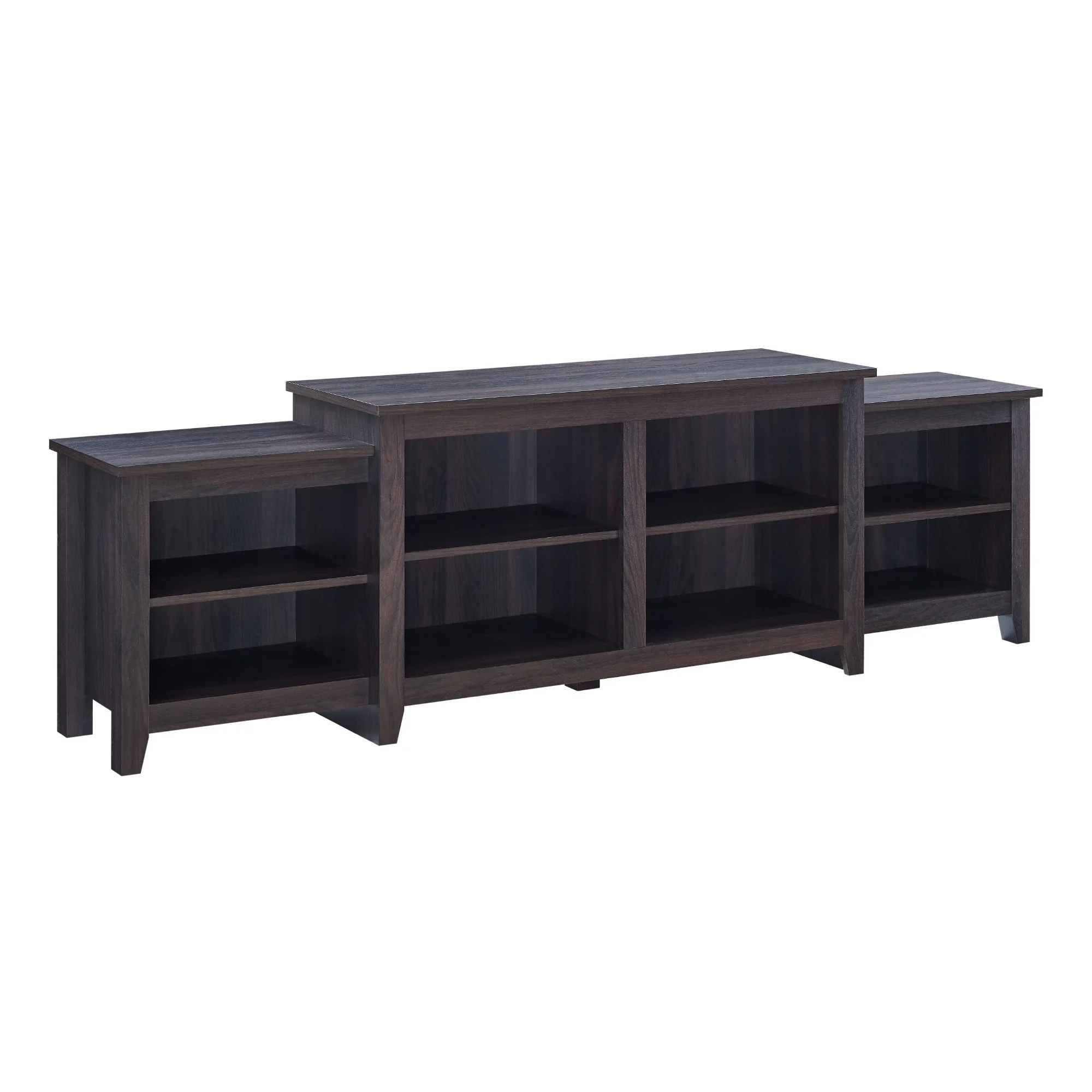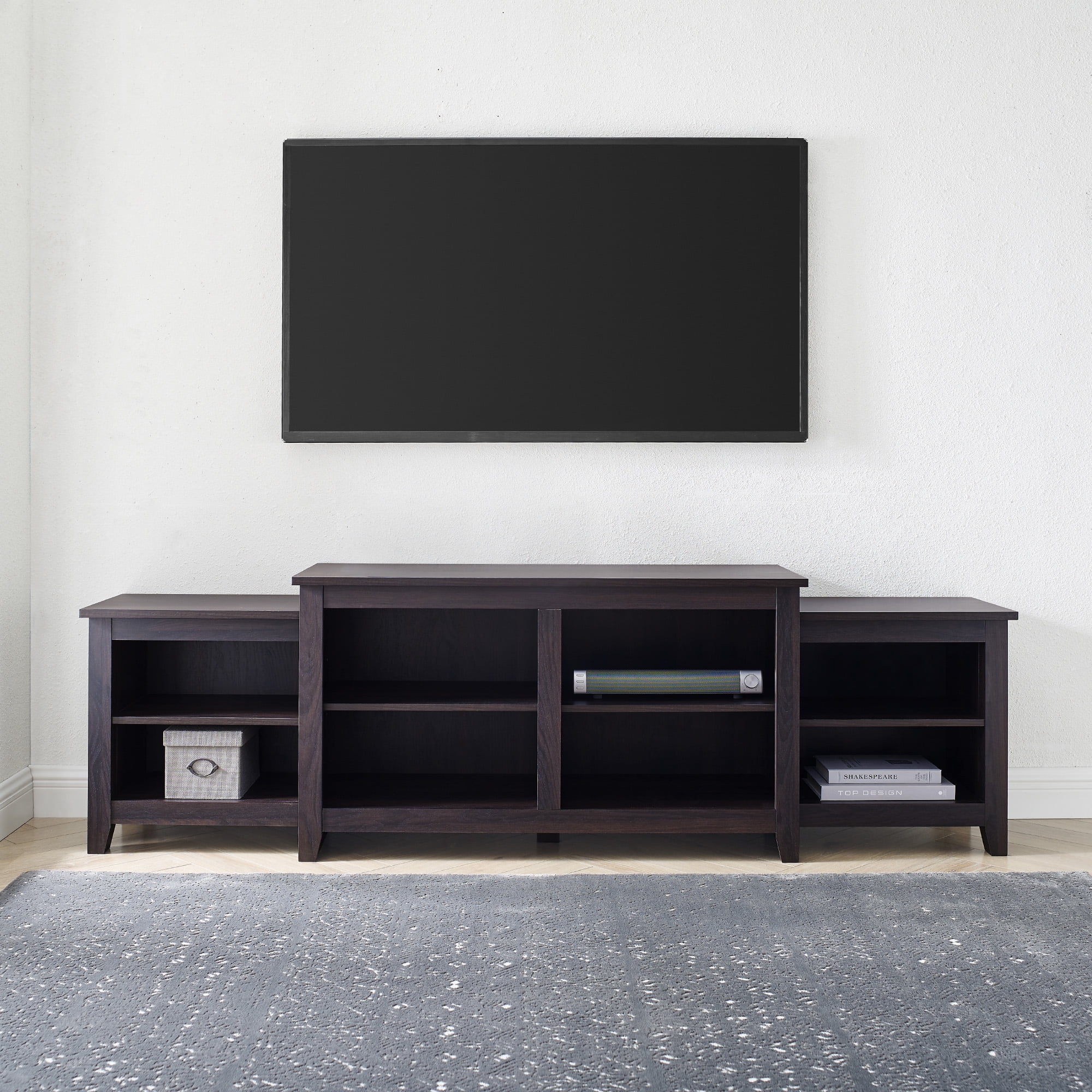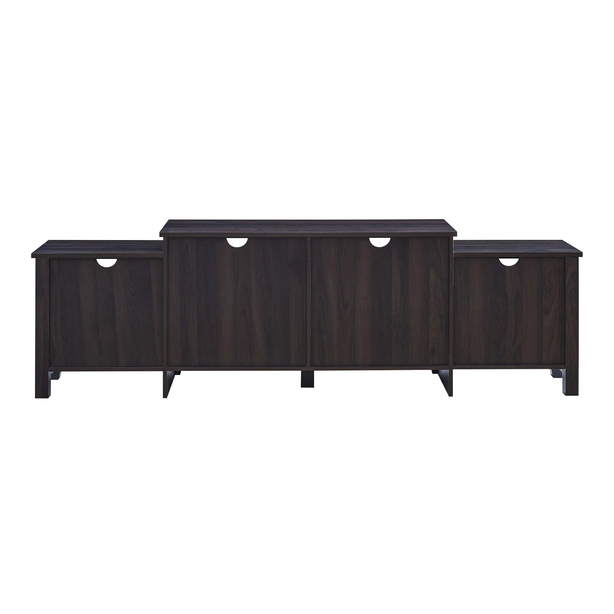Transitional farmhouse style Dark roast espresso finish Attractive, tiered frame 2 fixed shelves 4 cord management ports to keep cables tidy 2 adjustable shelves Simple design for a versatile piece Made with warp-resistant MDF and durable laminate Assembled Dimensions: 24″ H x 80″ L x 15.75″ W Packaged Dimensions: 8″ H x 49″ L x 20.25″ W