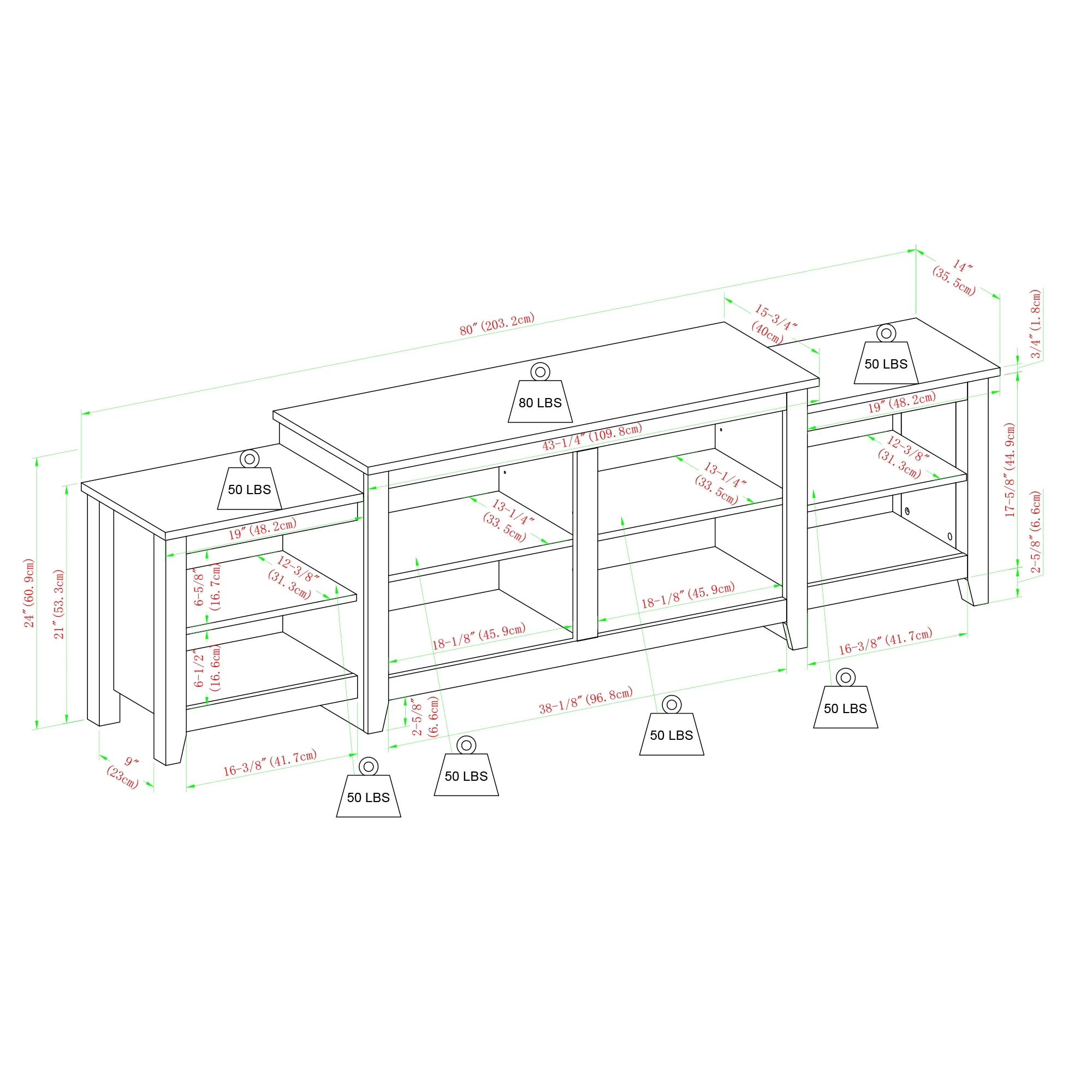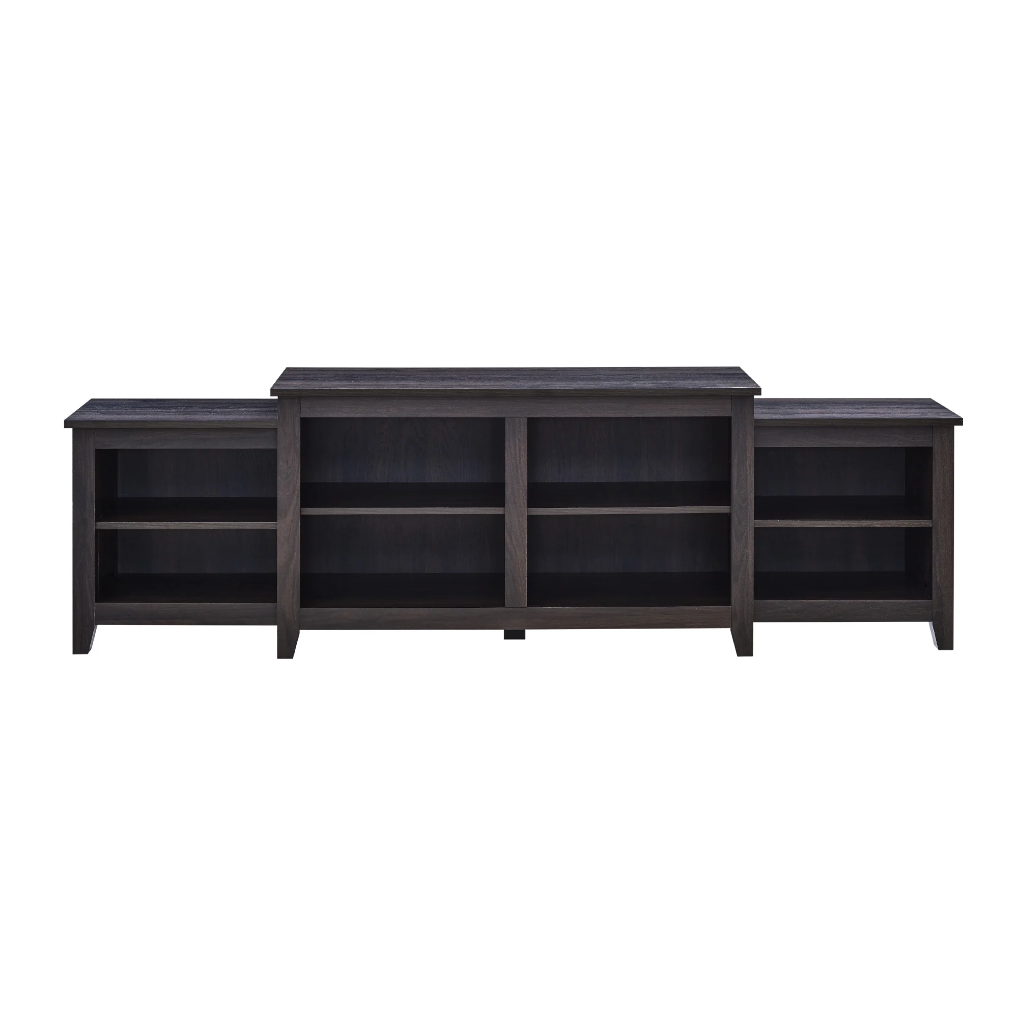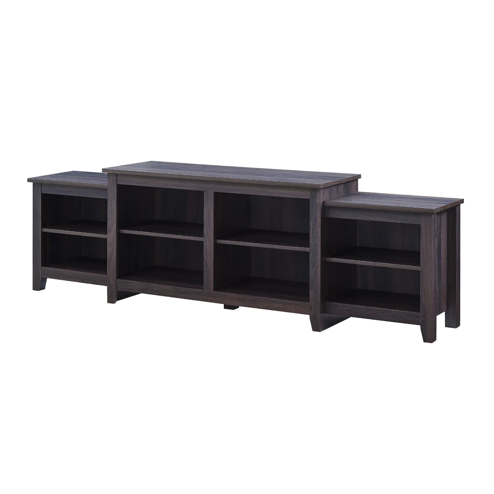 Transitional farmhouse style Dark roast espresso finish Attractive, tiered frame 2 fixed shelves 4 cord management ports to keep cables tidy 2 adjustable shelves Simple design for a versatile piece Made with warp-resistant MDF and durable laminate Assembled Dimensions: 24″ H x 80″ L x 15.75″ W Packaged Dimensions: 8″ H x 49″ L x 20.25″ W