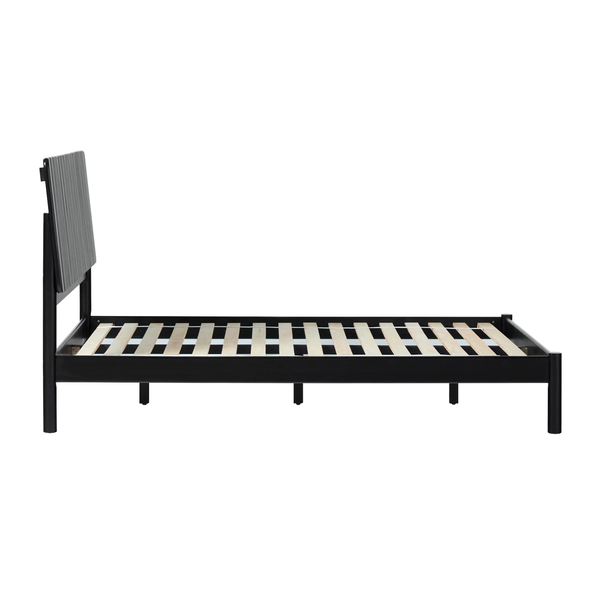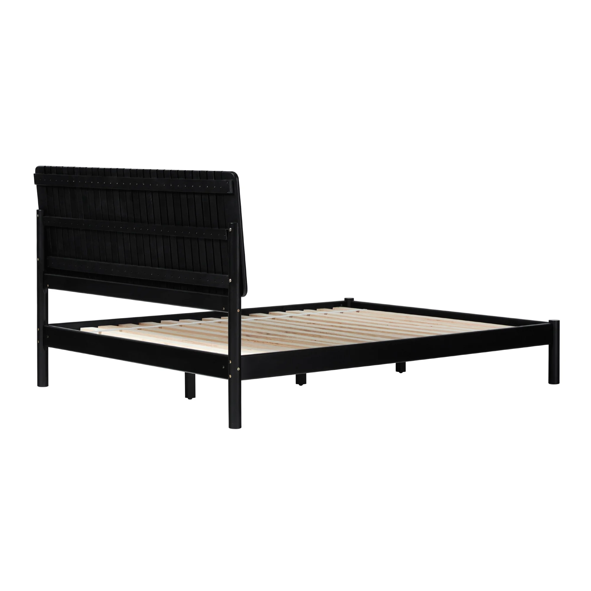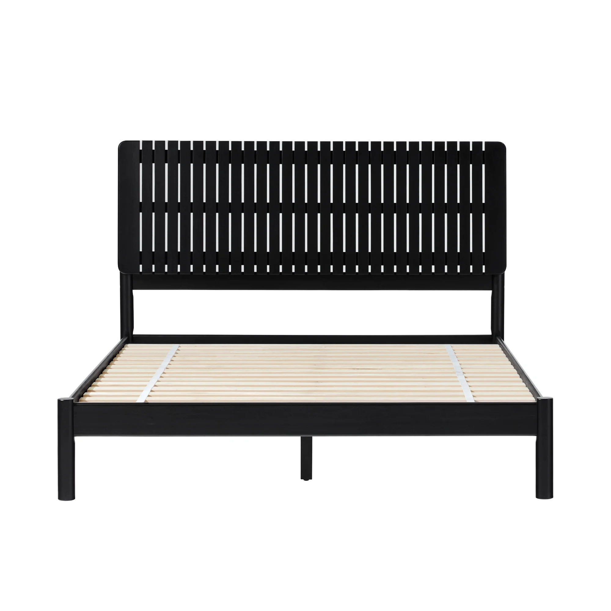 Transitional style Black stain Unique vertical slat headboard Platform design (no box spring required) Quick set up Made with durable solid wood Ships ready-to-assemble with step-by-step instructions Assembled dimensions 44 ⅞” H x 84 ¼ ” L x 64 ⅝” W Packaged dimensions 7.28” H x 86.22” L x 25.79” W