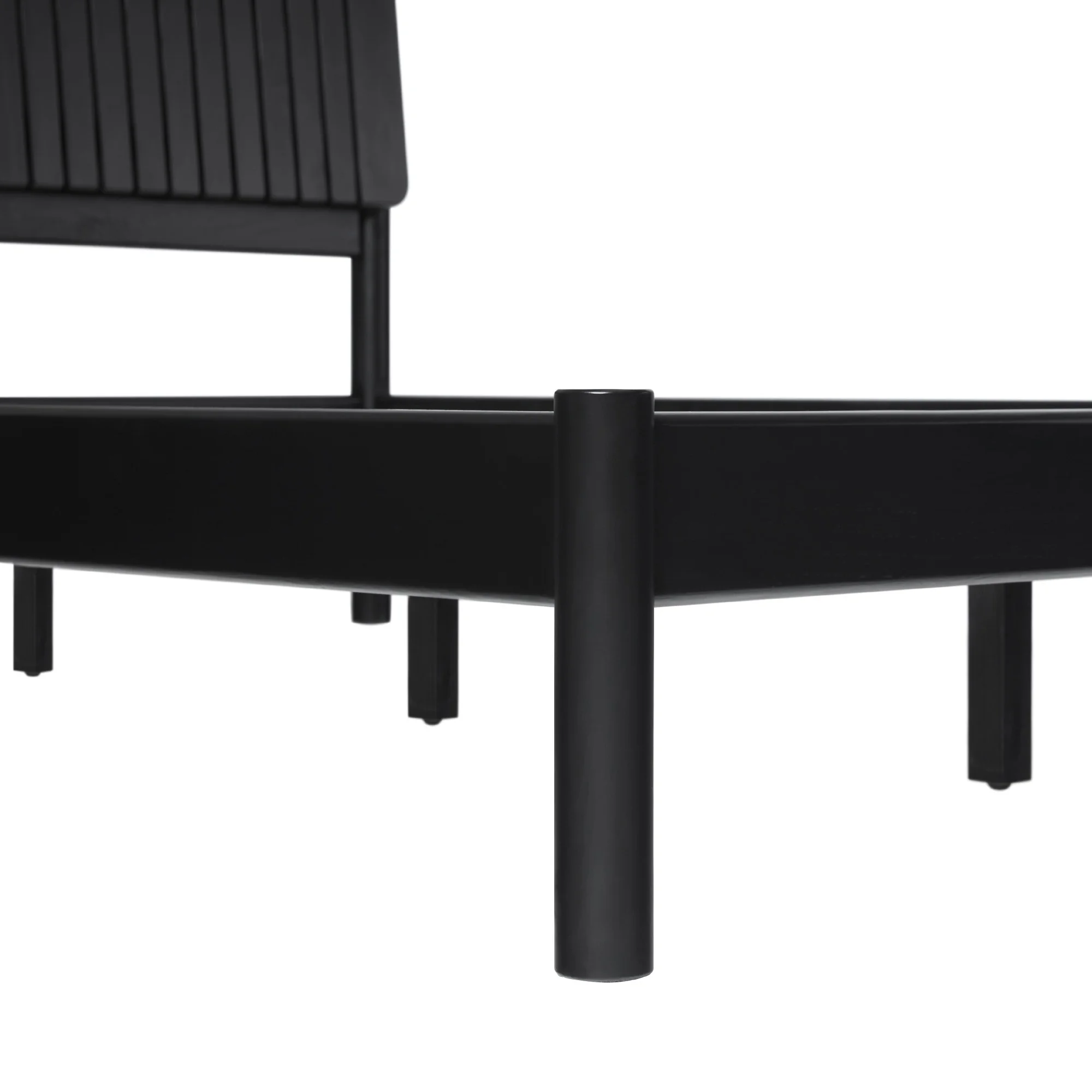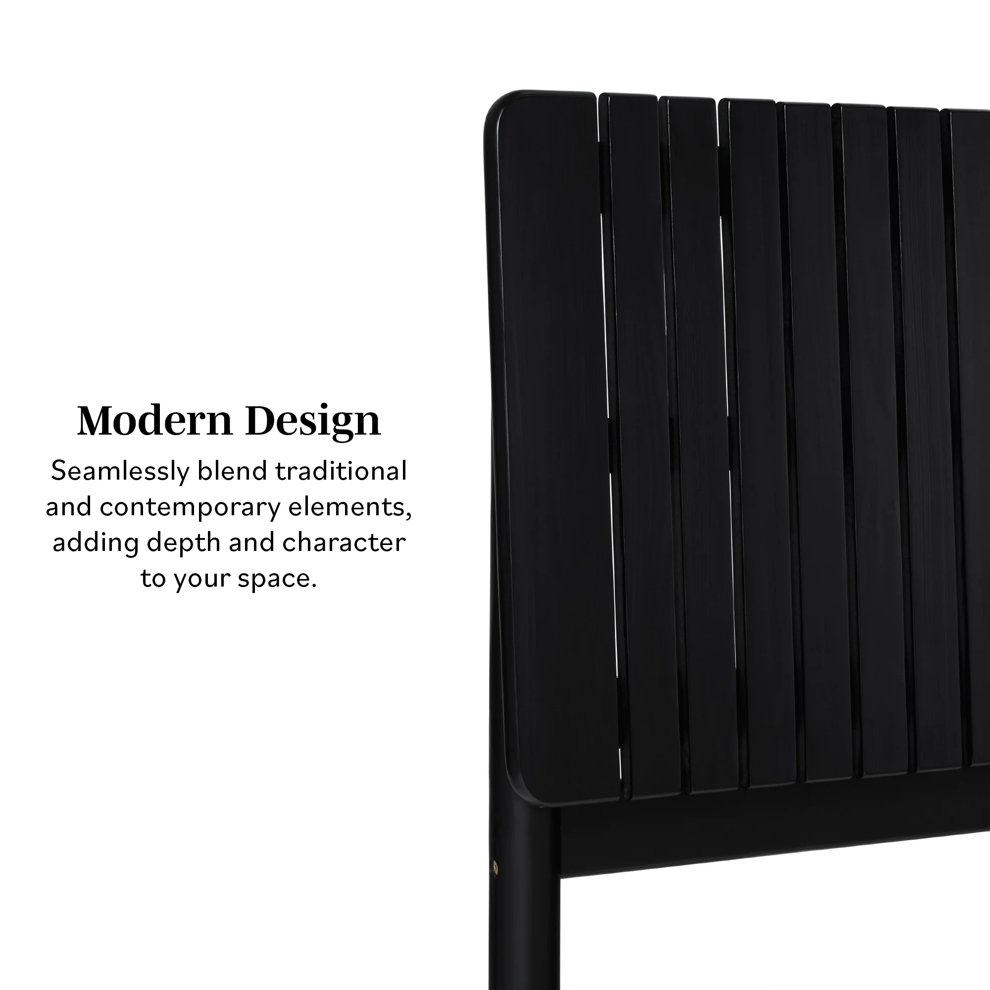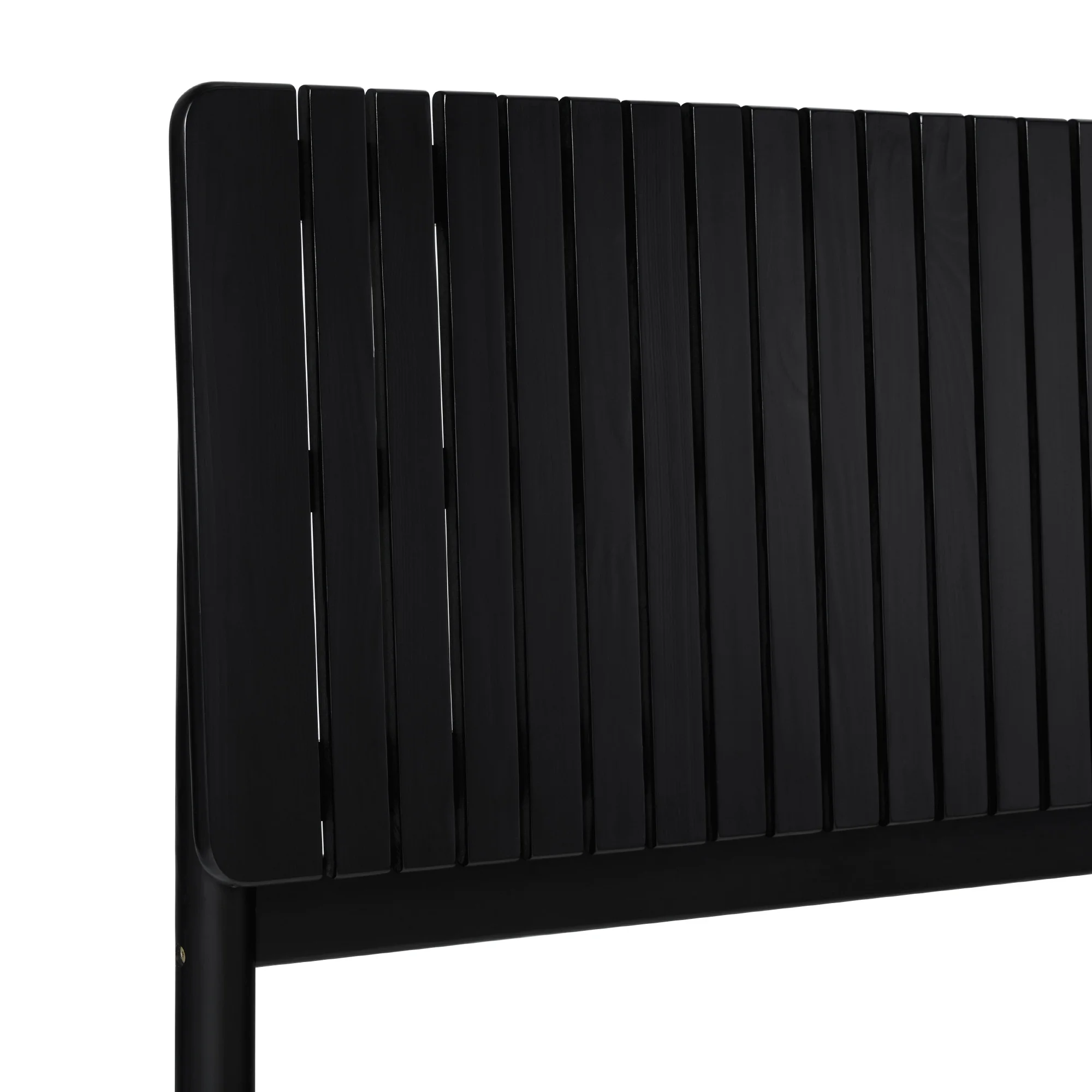 Transitional style Black stain Unique vertical slat headboard Platform design (no box spring required) Quick set up Made with durable solid wood Ships ready-to-assemble with step-by-step instructions Assembled dimensions 44 ⅞” H x 84 ¼ ” L x 64 ⅝” W Packaged dimensions 7.28” H x 86.22” L x 25.79” W