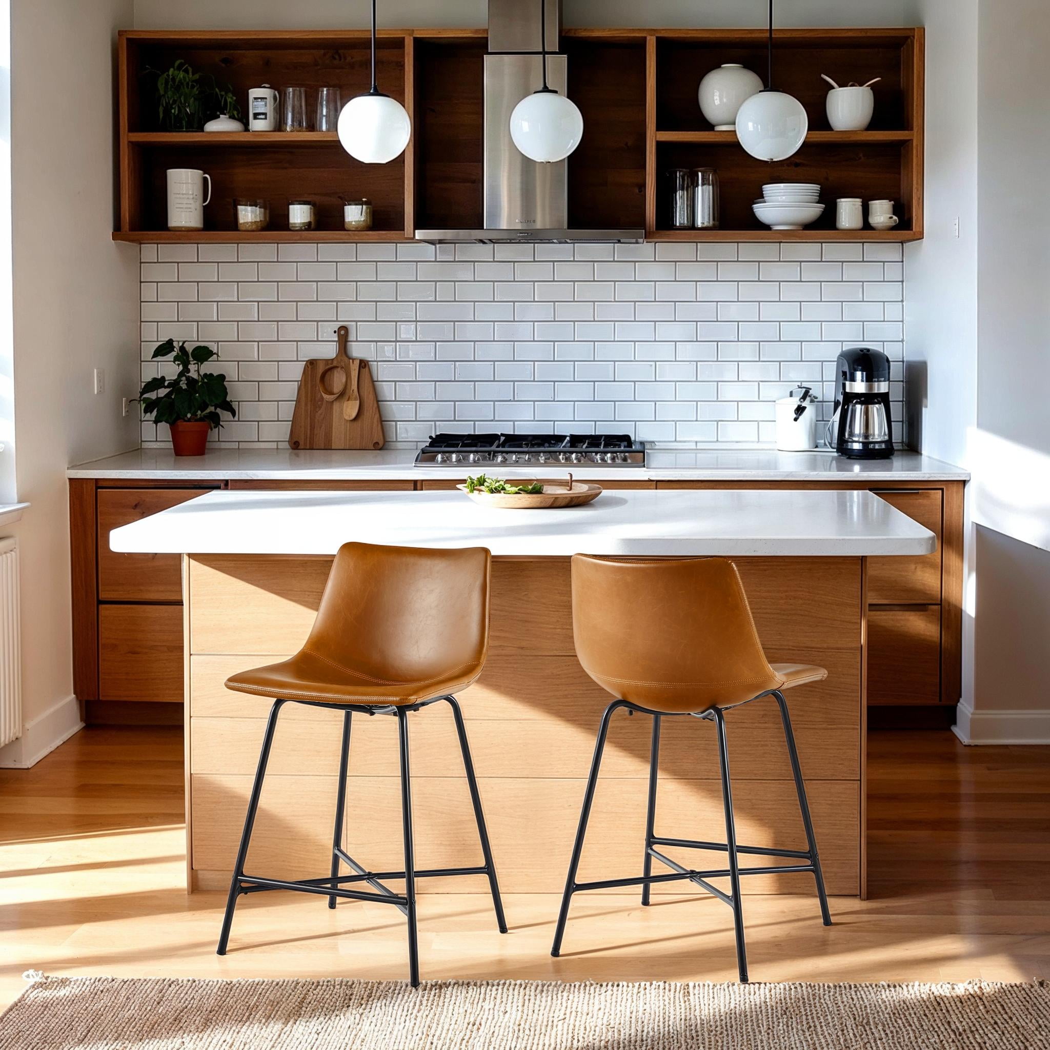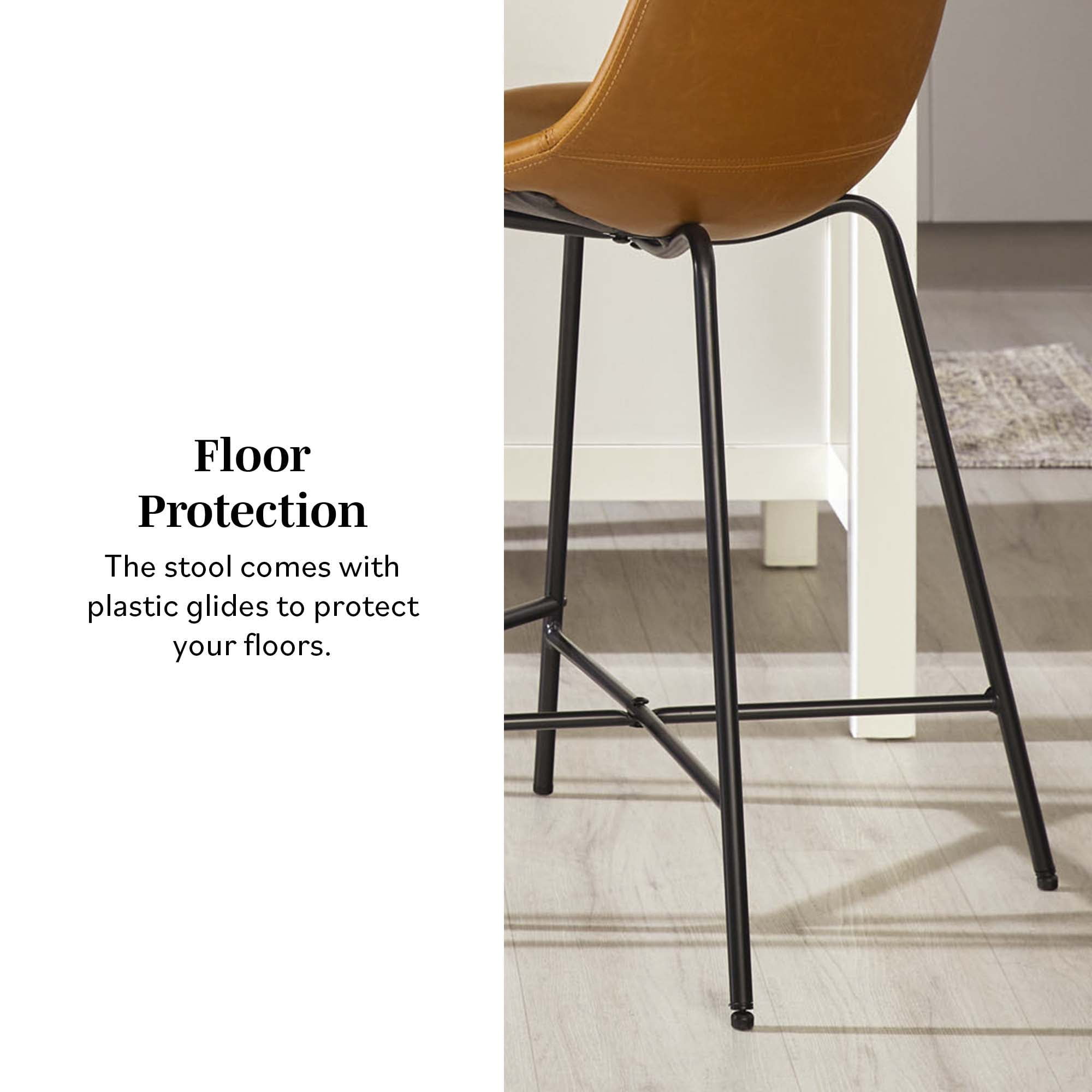 Refresh your dining space or kitchen setup with this set of two faux leather counter stools—where modern design meets everyday comfort. Featuring a clean, minimalist silhouette, these stools instantly elevate your space while offering the kind of durability that works for real life (think grab-and-go dinners or homework nights). The high-performance faux leather upholstery not only looks sleek but also makes post-meal cleanup a breeze, so daily use feels effortless – don’t worry about cleaning up after kids, a quick wipe down takes a few seconds. Supported by a sturdy steel X-base, these stools offer lasting strength and a modern edge that stands out in all the right ways. Each stool includes adjustable foot levelers to help keep them steady on uneven surfaces—perfect for hardwood, tile, or rugs. Whether you’re lining them up at your kitchen island, pulling them up to a high-top table, or adding flexible seating near your sofa, these counter-height stools are designed to keep things stylish, comfortable, and totally functional.