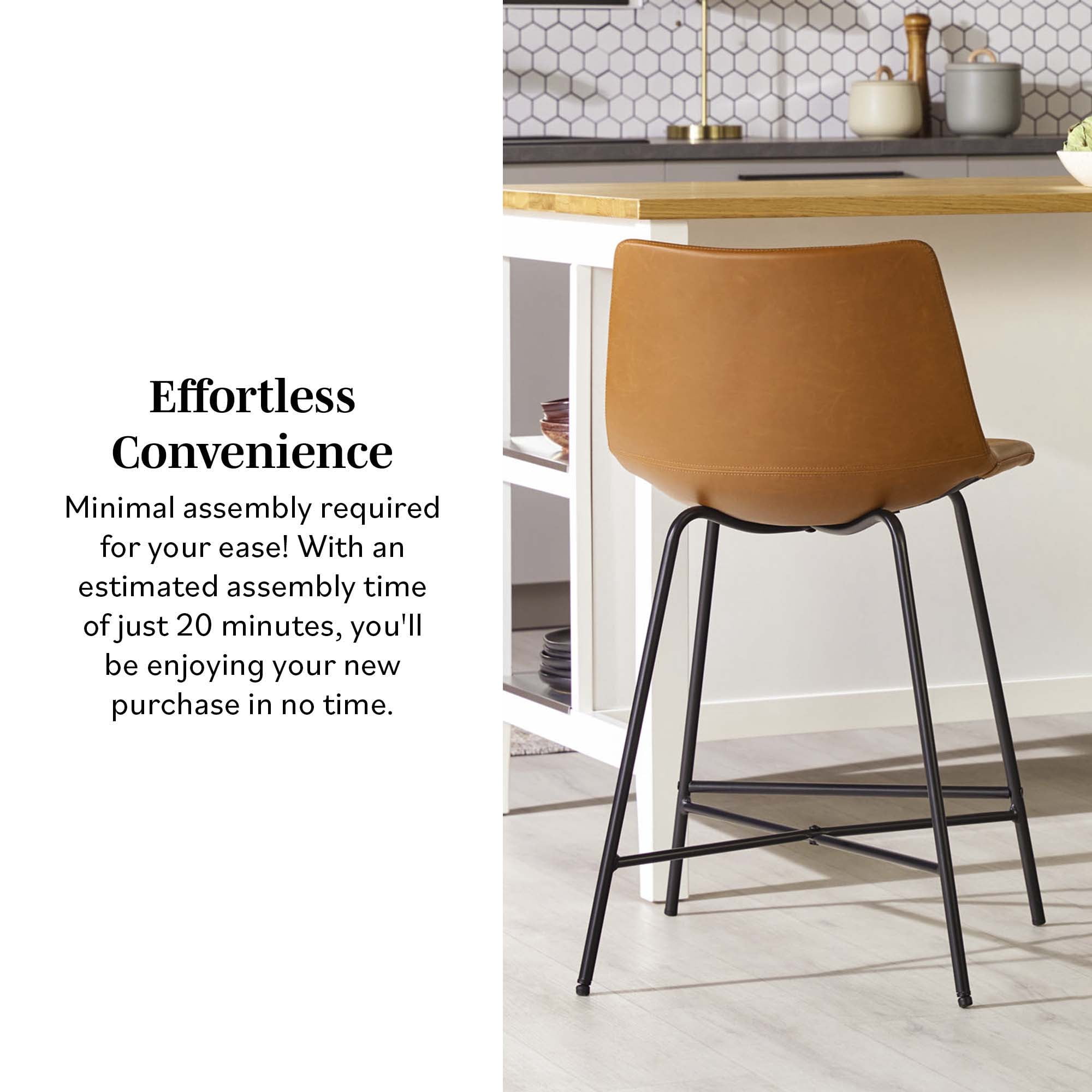 Set of two modern counter chairs Easy to clean faux leather Adjustable foot levelers on a durable metal base Minimal assembly and quick setup Comfortable seat construction Versatile design for dining tables, islands, or additional seating Seamlessly fits under standard counter height countertops