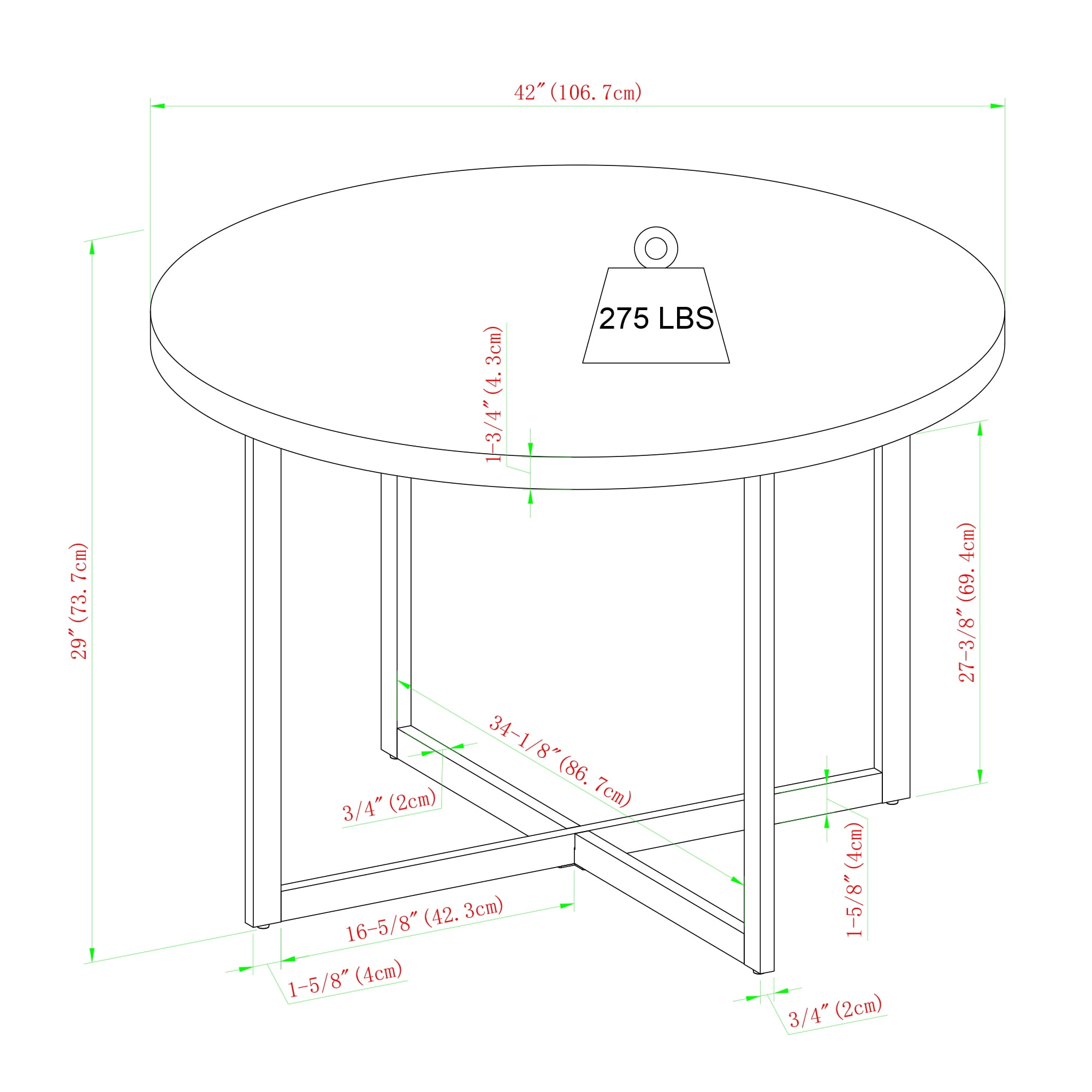 Urban industrial style Coastal Oak finish Comfortably seats up to 4 people Sturdy metal-x base creates a modern feel Versatile silhouette complements a wide variety of aesthetics Perfect for small-space living Made from warp-resistant MDF, durable laminate, and steel Ships ready-to-assemble with step-by-step instructions Assembled dimensions: 29” H x 42” L x 42” W Packaged dimensions: 4″ H x 45″ L x 45″ W