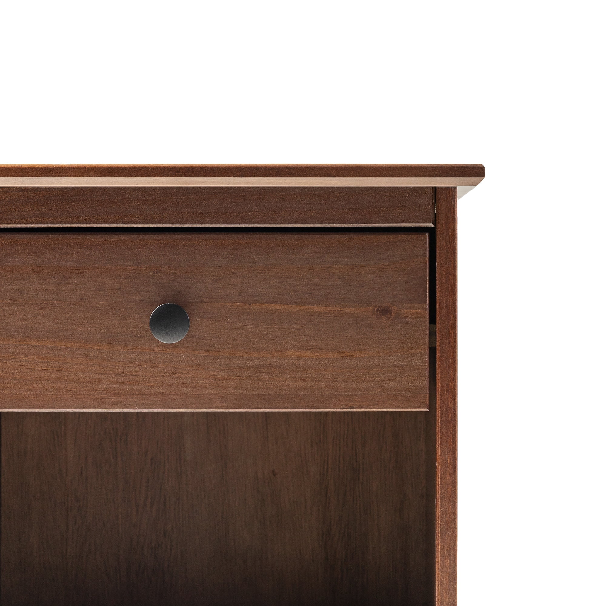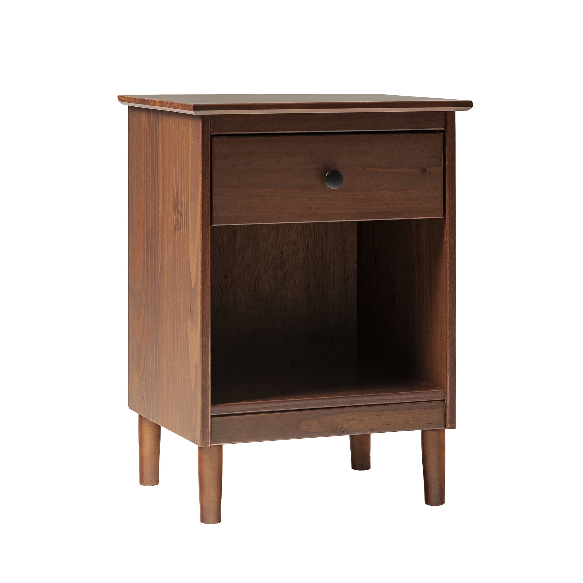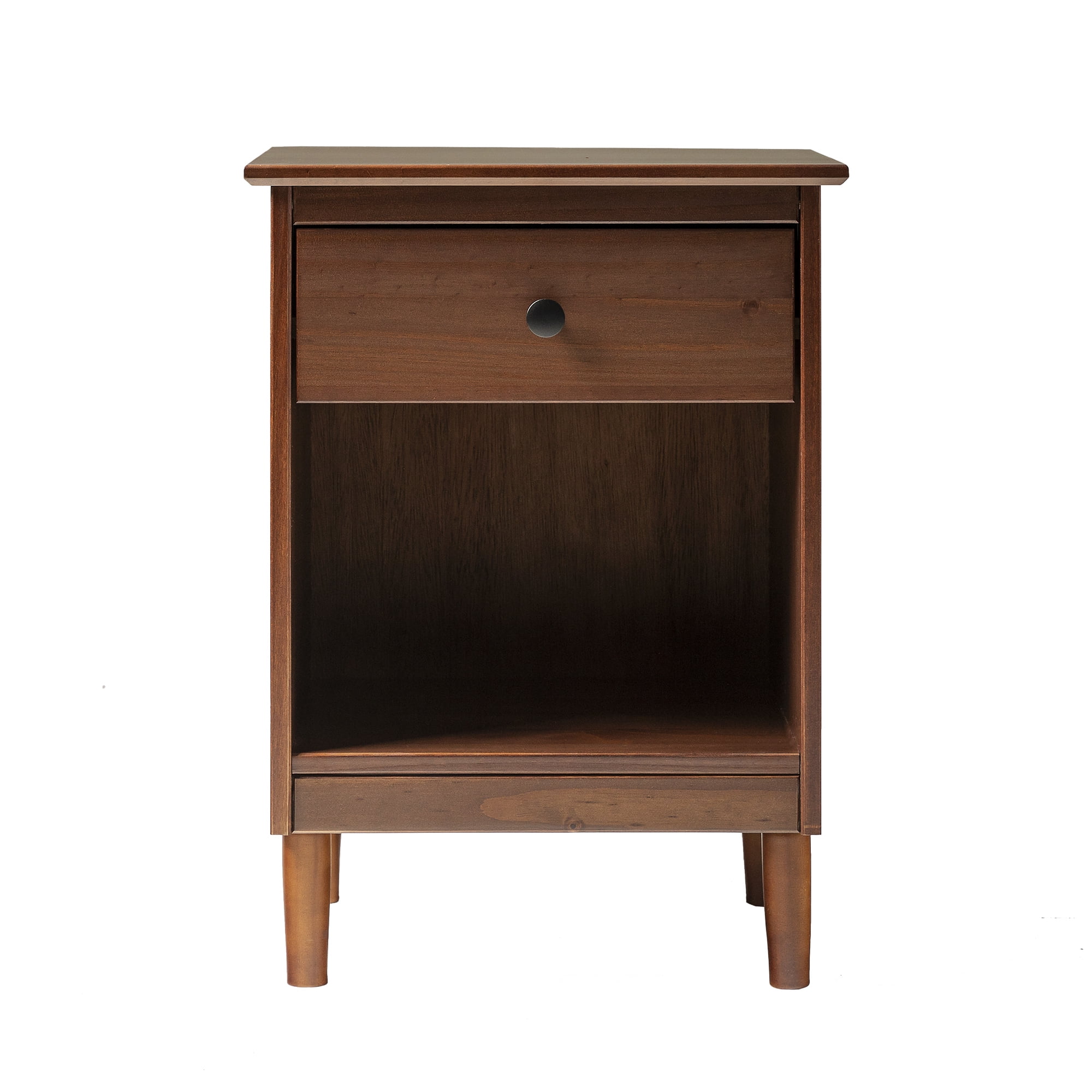 Clean lines and simple silhouettes abound in this 25” mid-century 1-drawer nightstand. A combination of open and closed storage, this bedside table can hold a variety of bedside accessories whether that’s a journal or speakers to play white noise from to help you fall asleep. Tapered legs are a modern take on a classic look that allows this accent stand to function just as well as an end table where you can store the TV remote or books to read. The solid pine wood that is used in the piece is responsibly harvested from renewable forests, finished in a beautiful walnut color and paired with a black hardware handle.