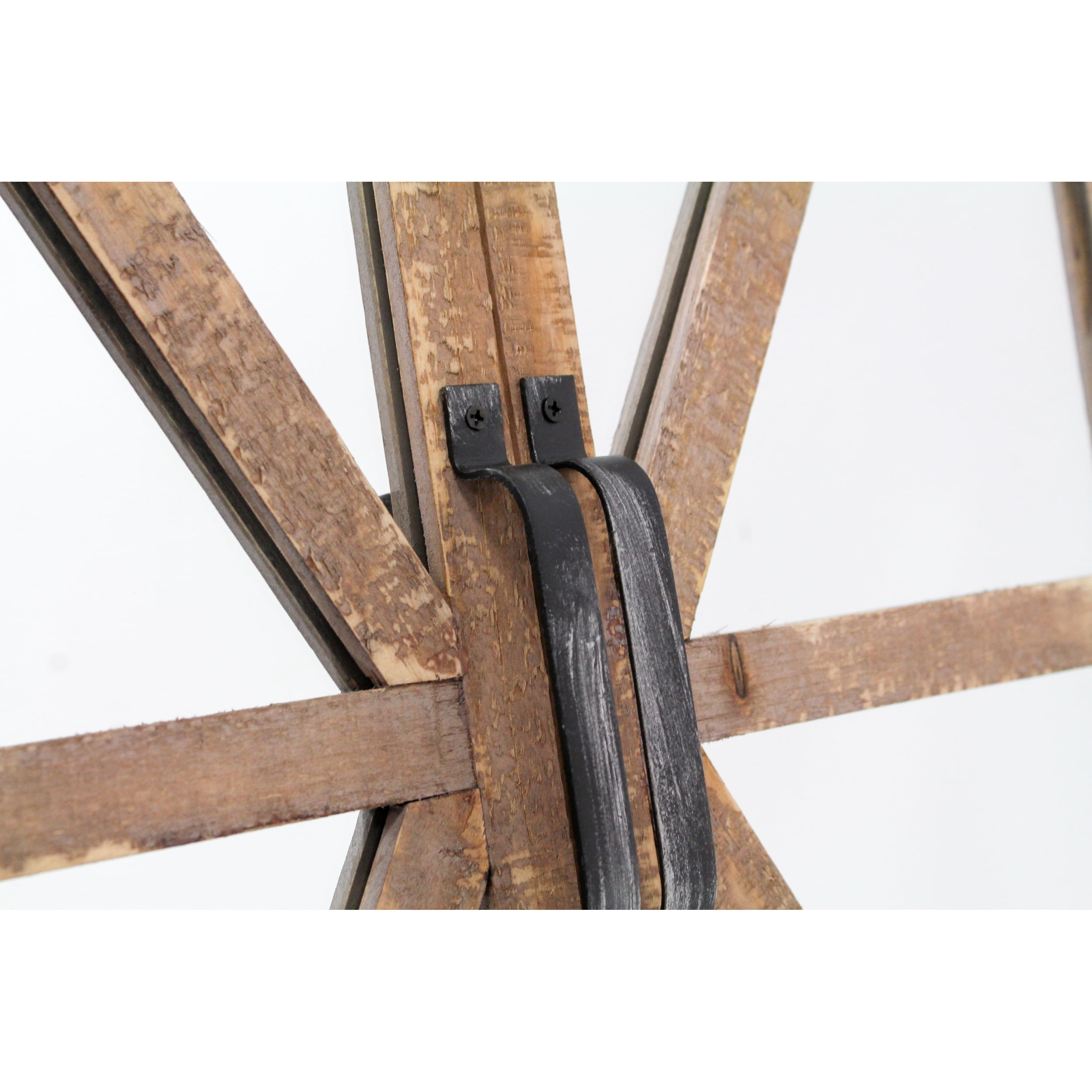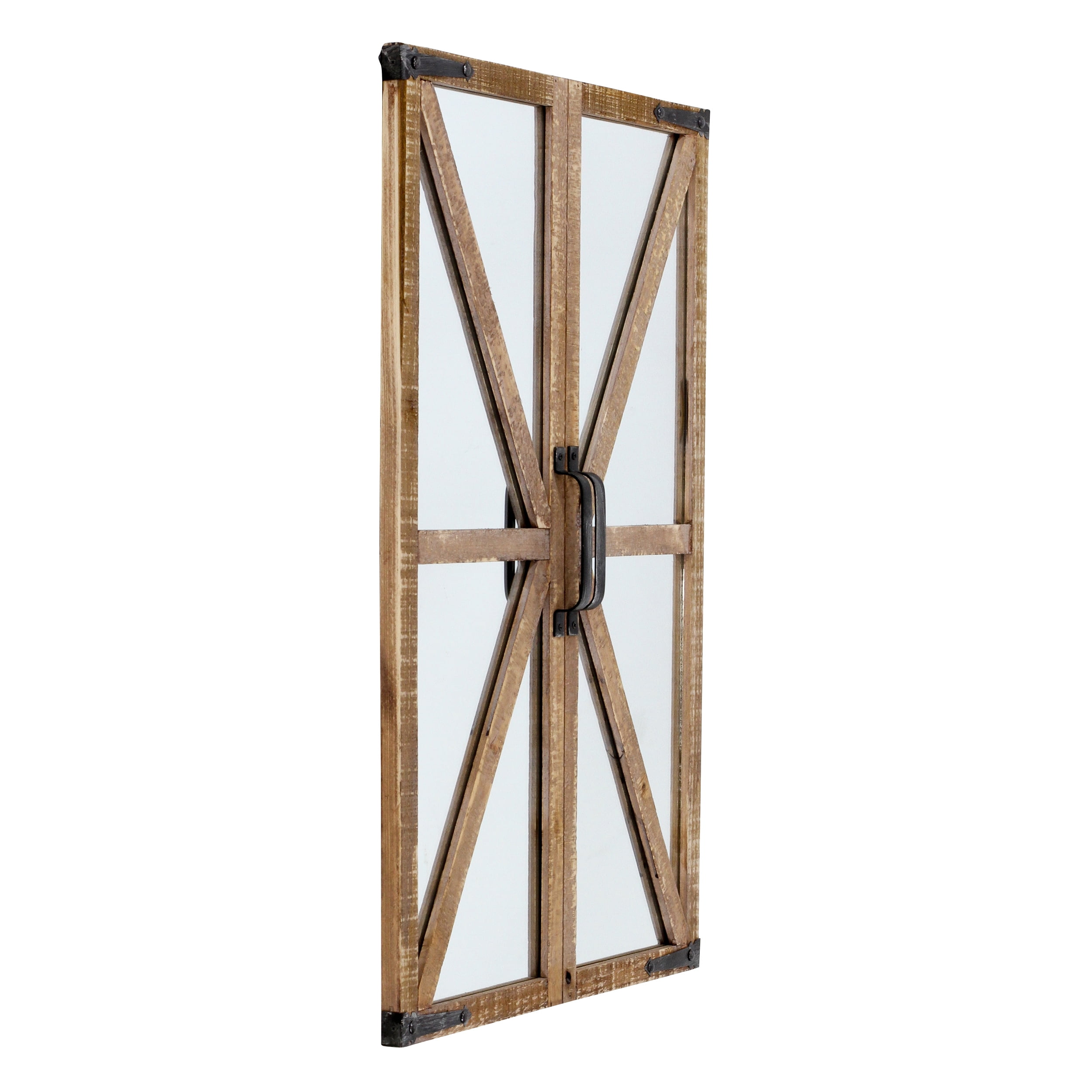 Crafted from wood Nutmeg finish with black metal accents Hardware is decorative, doors do not swing open Perfect for farmhouse or rustic styles Hangs easily using 2 nails or screws
