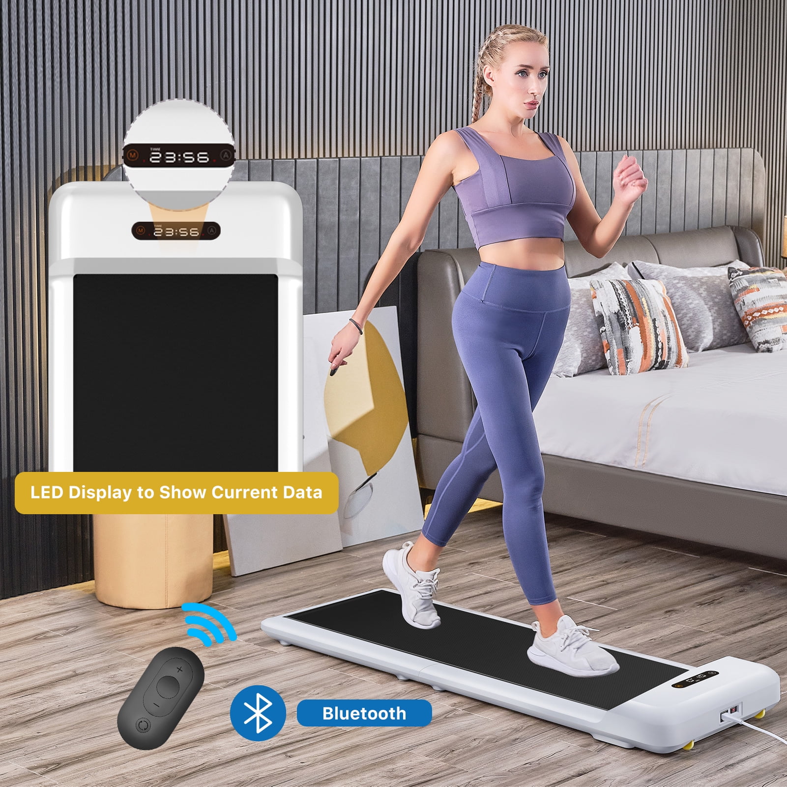 The C2 Walking Pad Fold and Stow with Smart Walk Sensors is perfect for simple daily exercise at home or in the office. Maintain and improve your health by engaging in light exercise in short bursts of time throughout the day. This WalkingPad can fit under a stand desk to provide you with a great way to increase activity and avoid pain from sitting while you work. Patented double folding technology reduces the amount of storage space needed when not in use, making this an ideal space saving solution for home exercise equipment. Effortlessly move and store against a wall, under the bed, sofa, or desk. The C2 WalkingPad is equipped with a brushless motor that reduces noice level to 65 decibels. Through the downloadable KS Fit App, control your walking speed with SWS Smart Walk Sensor technology. In the auto mode, the walking belt’s 8 sensor system automatically adjusts the speed from where you land on the walking track, or, simply manually adjust walking speed with the remote control. Monitor speed, time, steps, and calories burned. Integrated steel aluminum alloy framework design is lighter, stronger, and more durable. No assembly required, simply unfold, plug in, and start walking.