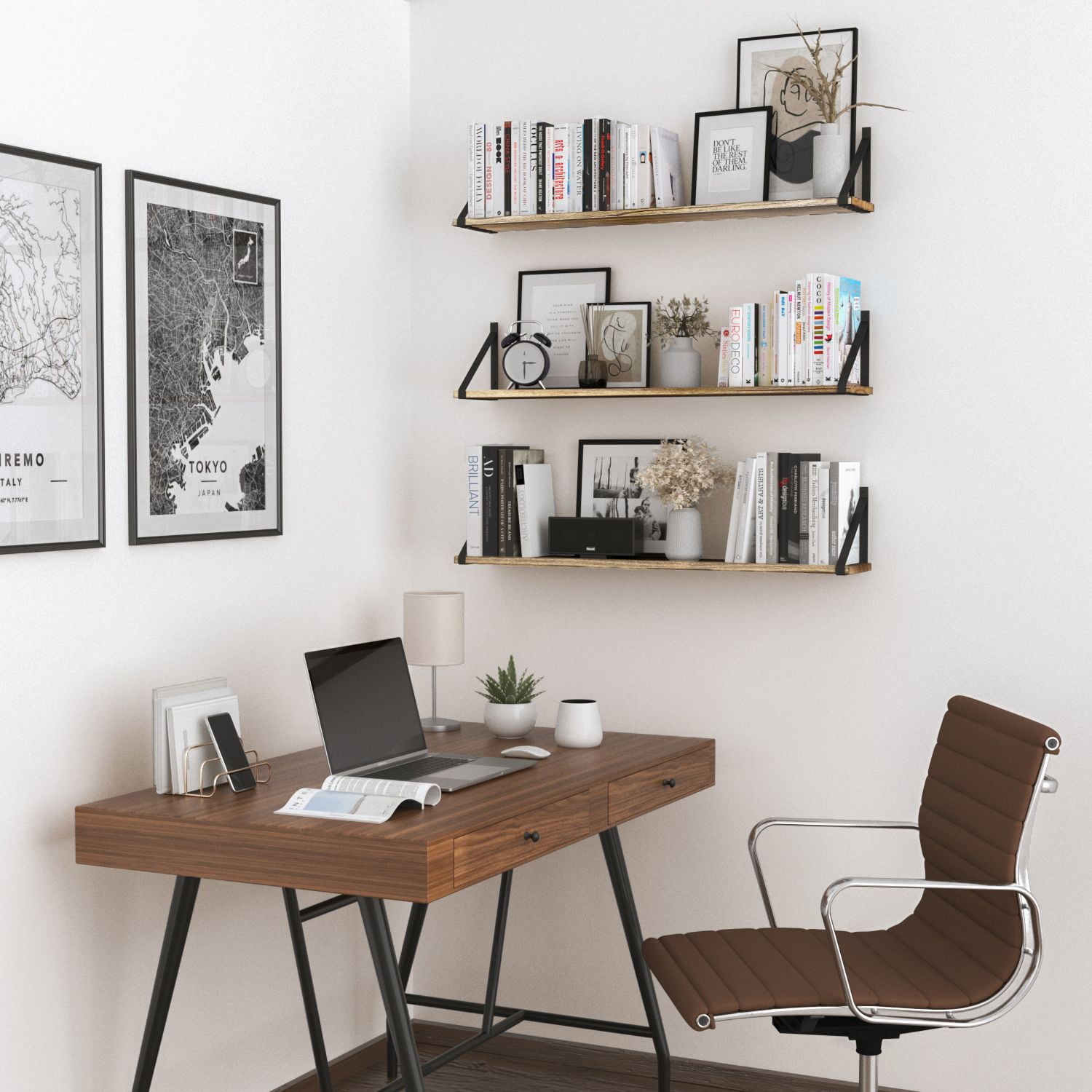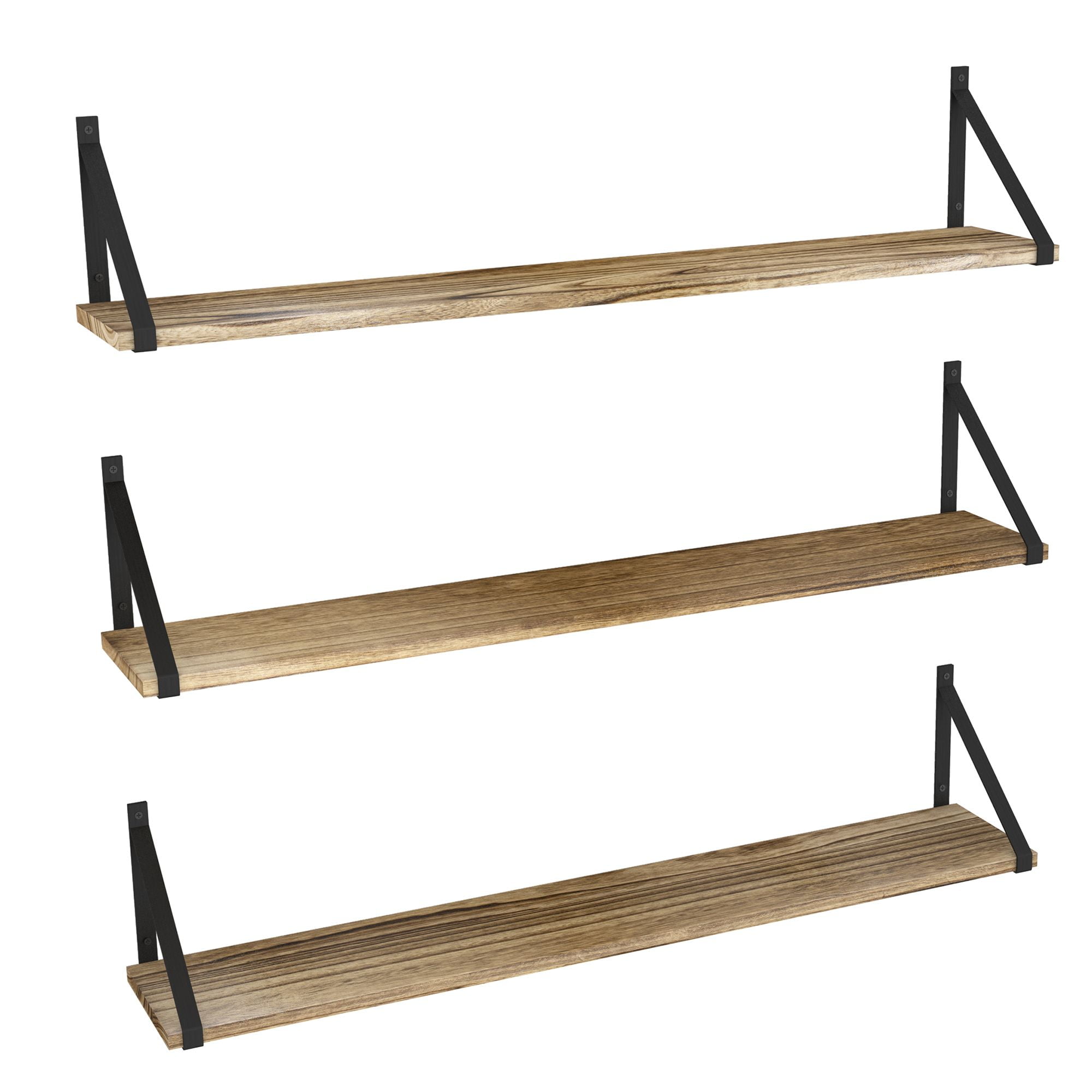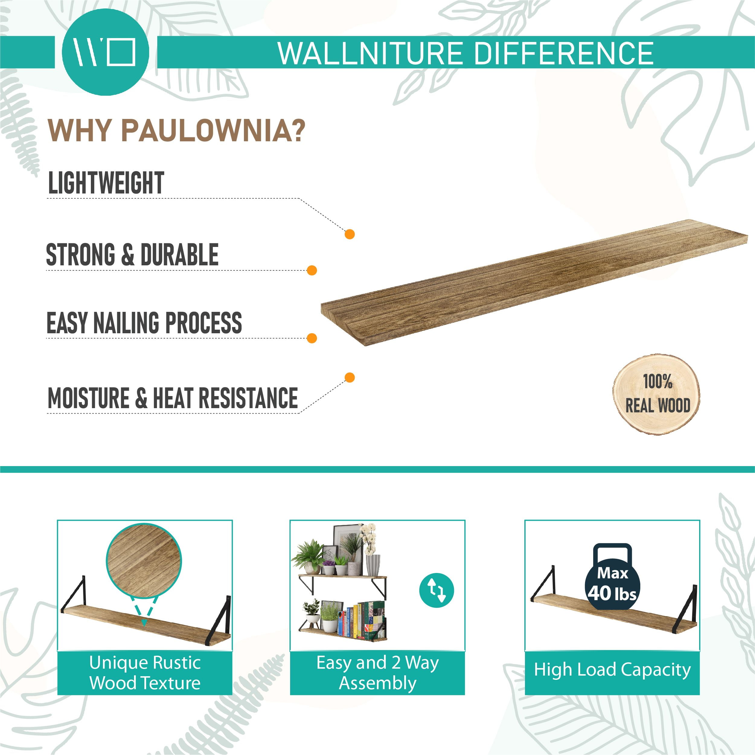 Set of 3, Wallniture BORA Float Shelf for Wall with Brackets, 36″ x 6″, Natural Burned Made of durable Paulownia wood and elegant metal brackets, holds up to 40 lb Have an additional storage space while having a great match to your rustic home decor Flexible usage with its neat, symmetrical, and perfectly proportioned design approach Natural burned wall shelves for storage are ideal for any house decor Install multi-purpose 36″ wood wall shelves in the kitchen, bathroom, bedroom, and living room Keep your kitchen cabinet and pantry storage tidy and neat Mount kitchen storage shelves next to the countertop and revamp your kitchen organization Display kitchen gadgets, organize coffee mug, spices and seasonings set, or storage containers Keep the wood cutting board, cookbook, and kitchen appliances in check Store coffee pods and tea set, mason jars, snacks, serving bowls, soy sauce, or olive oil Bathroom storage shelf set fits right above the sink and provides a cozy retreat for toiletries Neatly store toilet paper, toothpaste, curling iron, spray bottles, makeup kit, and hand towels Perfect for bedroom set to install wall hanging shelves on the side of your bed frame Keep bedtime books, daily planner, reading glasses, phone, and morning essentials accessible Great for storing books, or displaying favorite collectibles, photo frames, and artificial plants Wall rustic kitchen shelf set is an elegant gift for birthdays, housewarmings, holidays, or any occasion Wooden wall shelf for bathroom includes all necessary hardware and instruction manual Specifications Material: Paulownia Wood Board and Stainless Steel Bracket Color: Natural Burned Board | Black Brackets Dimensions Assembled Wall Shelf Dimensions: 36″ x H 7″ x D 6″ Weight Capacity: 40 lbs What is in the Package? 3x 36″ Wood Board 6x Metal Bracket 24x Steel Screws 12x Plastic Anchors 1x Installation Manual Each Wallniture wall mount wood shelves with metal brackets are designed to meet your needs and expectations. Ensure that once you buy our product, you will use it with life satisfaction. But if you encounter any problems, we will be here to assist you!
