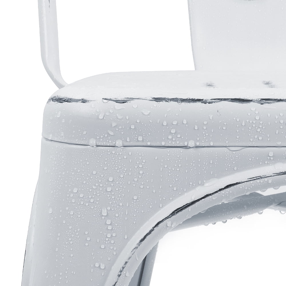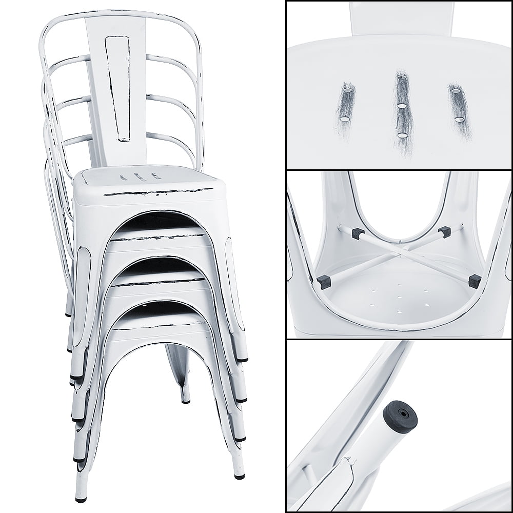 Walnew Metal Bistro Stacking Chairs, Distressed White (Set of 4) Heavy duty metal construction Durable scratch-resistant finish Made with holes on the seat to allow water to drain after rain Water-resistant and rust-resistant with excellent polishing effect X-brace under the seat provides extra support and stability Non-slip rubber feet keep them from sliding and scratching floors Color: White