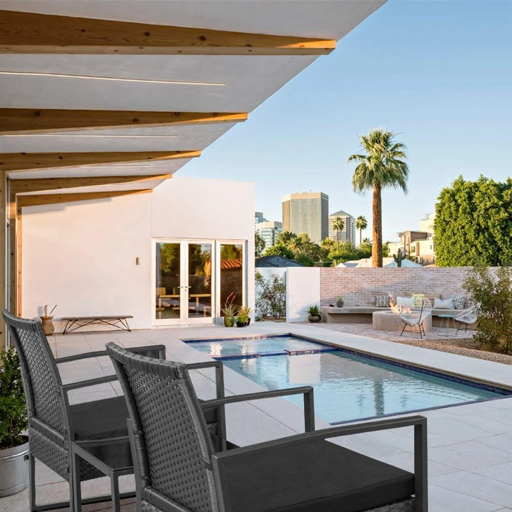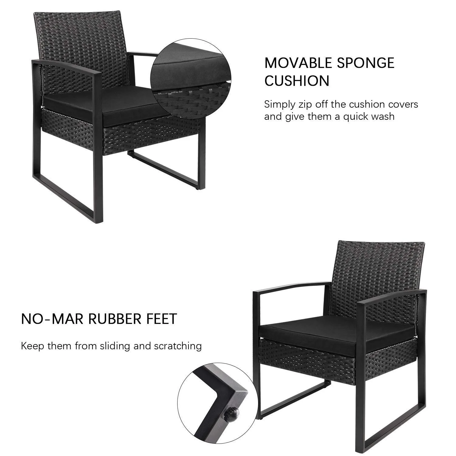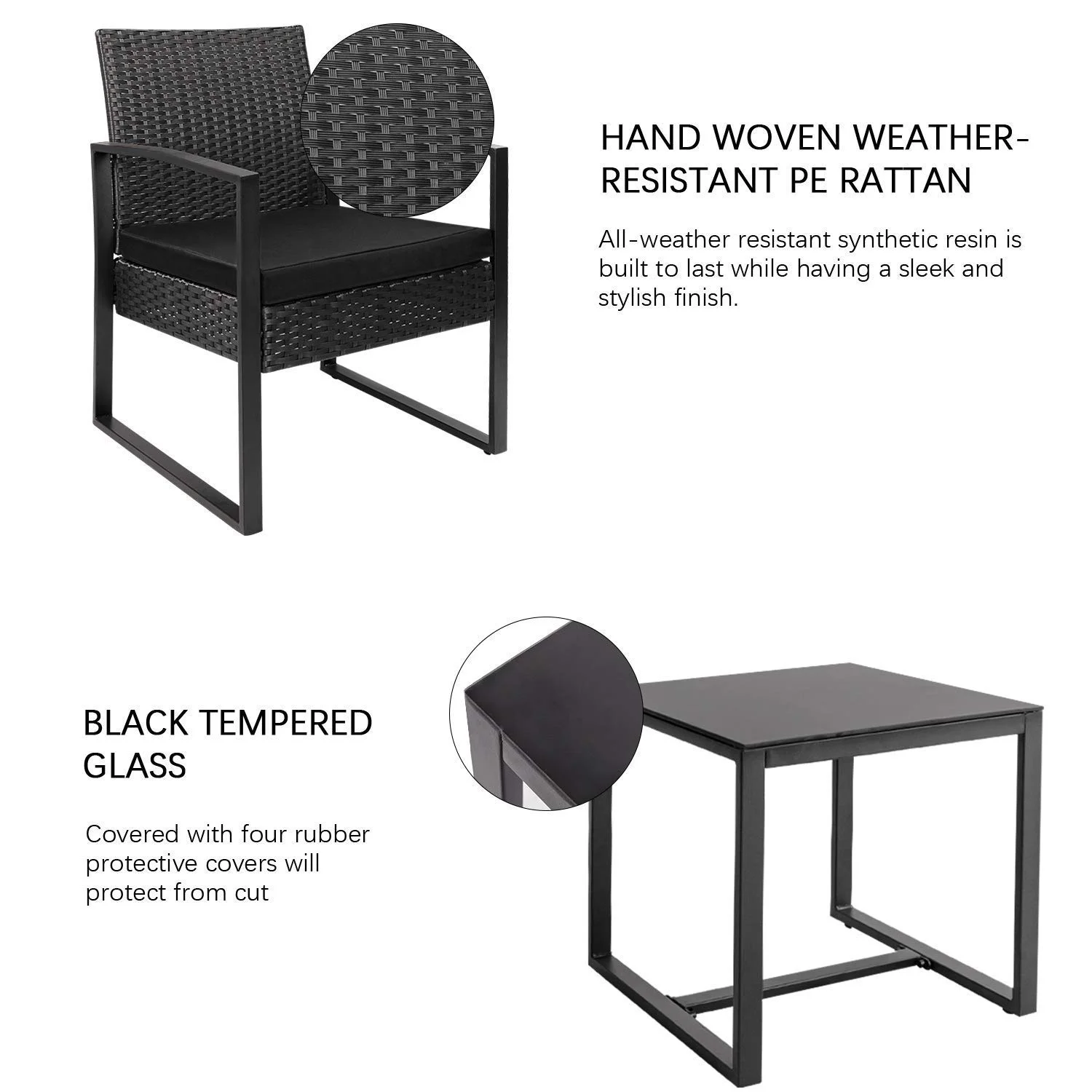 This is our 3 piece patio furniture cushioned PE rattan bistro sets, including 1 coffee table, 2 singe chairs.Made with high quality PE rattan material and a solid metal frame.This balcony furniture set is durable and has long life span, allowing you to enjoy it for years to come.Outdoor bistro set features and elegant glass top side table perfect for a couple glasses of wine or the morning coffee and newspaper.Its weather resistance characteristic helps you make quick clean come to fruition. Removable sponge which can be taken out from the zippered cushions can be cleaned labor-efficiently. Coffee table with tempered glass can clear up the water stain in one minute.Ergonomically engineered for ultimate comfort, walnew stylish porch chairs come with thick sponged cushion and pillow for more indoor and outdoor use.